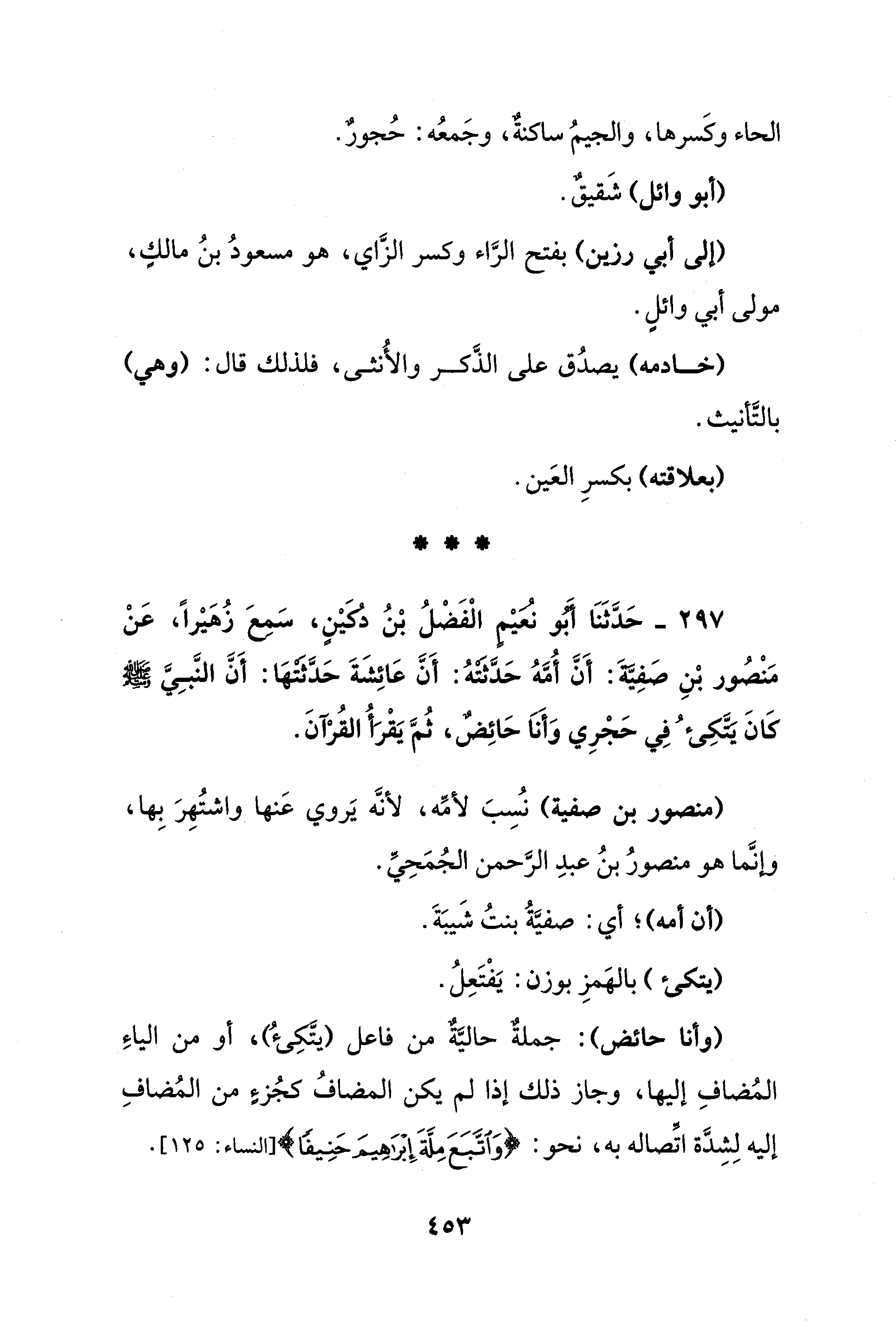297 - حَدَّثَنَا أبو نعيم الْفَضْلُ بْنُ دُكَيْنٍ، سَمعَ زُهَيْرًا، عَنْ مَنْصُور بْنِ صَفيَّةَ: أَنَّ أُمَّهُ حَدَّثتهُ: أَنَّ عَائِشَةَ حَدَّثتهَا: أَنَّ النَّبِيَّ - صلى الله عليه وسلم - كَانَ يتكِئُ فِي حَجْرِي وَأَناَ حَائِضٌ، ثُمَّ يَقْرأُ القُرآن.