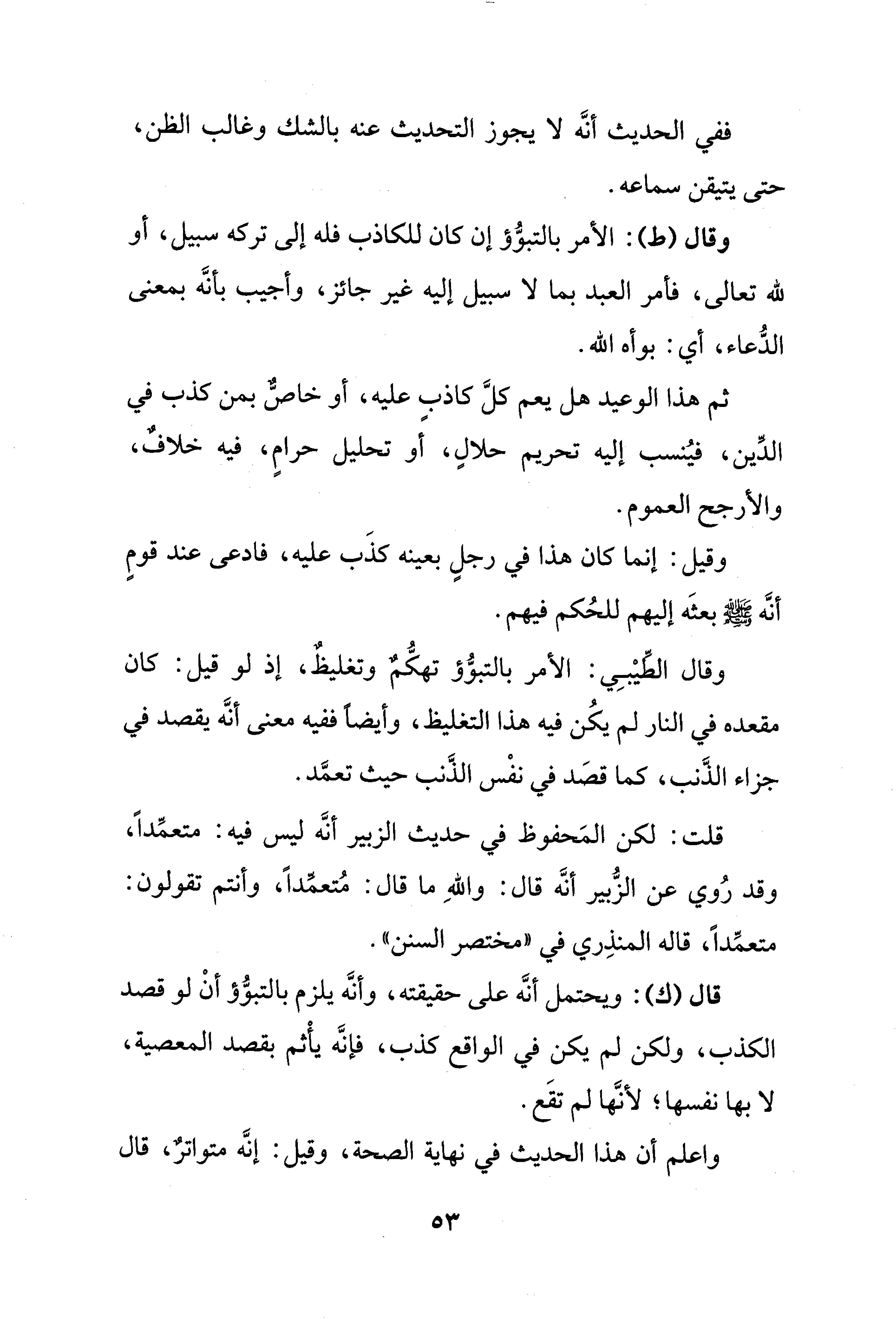 قال (ك): ويحتمل أنَّه على حقيقته، وأنَّه يلزم بالتبوُّؤ أنْ لو قصد الكذب، ولكن لم يكن في الواقع كذب، فإنَّه يأْثم بقصد المعصية، لا بها نفسها؛ لأنَّها لم تقَع.