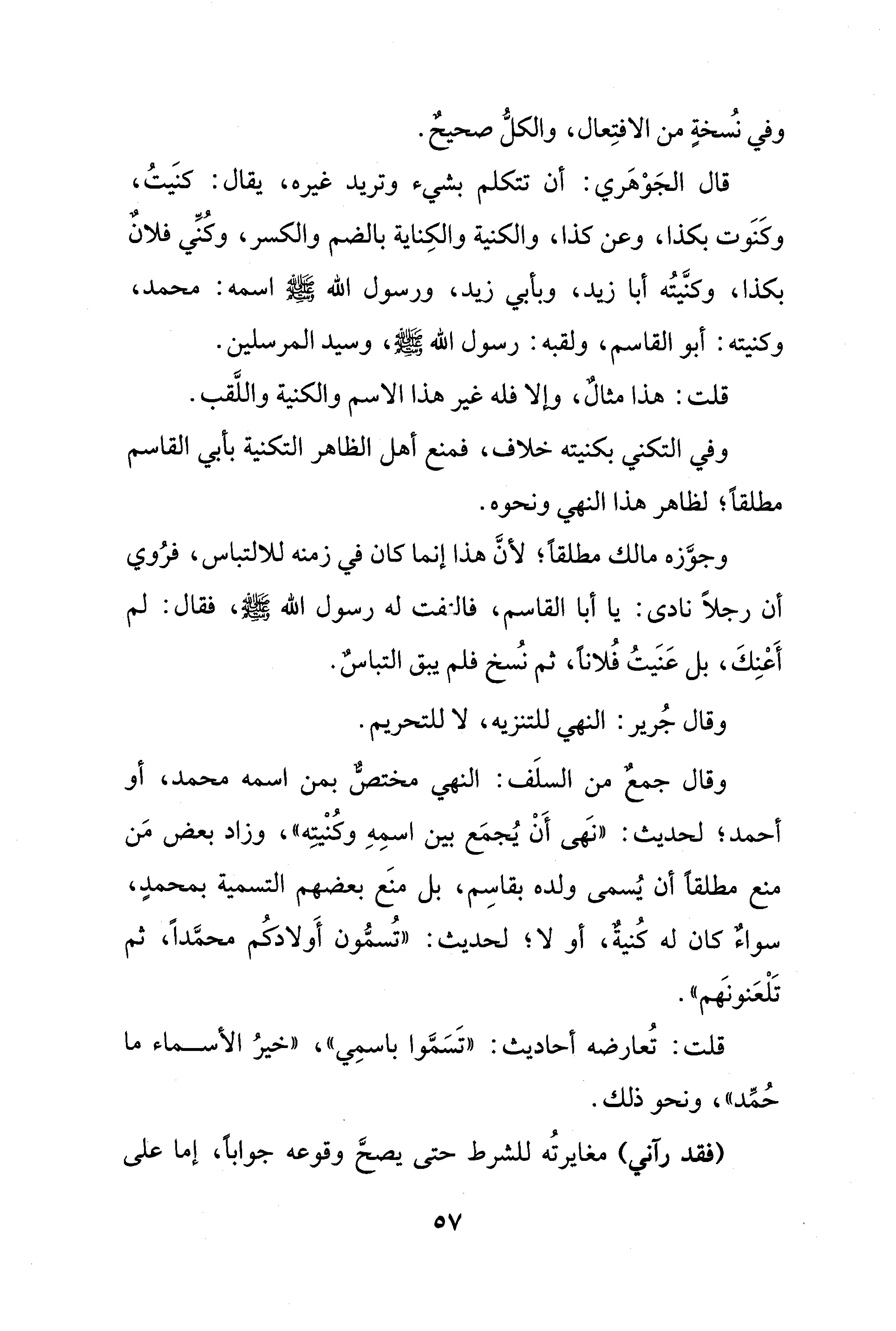وقال جمعٌ من السلَف: النهي مختصٌّ اسمه محمد، أو أحمد؛ لحديث: "نَهى أَنْ يُجمَع بين اسمِهِ وكُنْيتِه"، وزاد بعض مَن منع مطلقًا أن يُسمى ولده بقاسِم، بل منَع بعضهم التسمية بمحمدٍ، سواءٌ كان له كُنيةٌ، أو لا؛ لحديث: "تُسمُّون أَولاكُم محمَّدًا، ثم تَلْعَنونَهم".