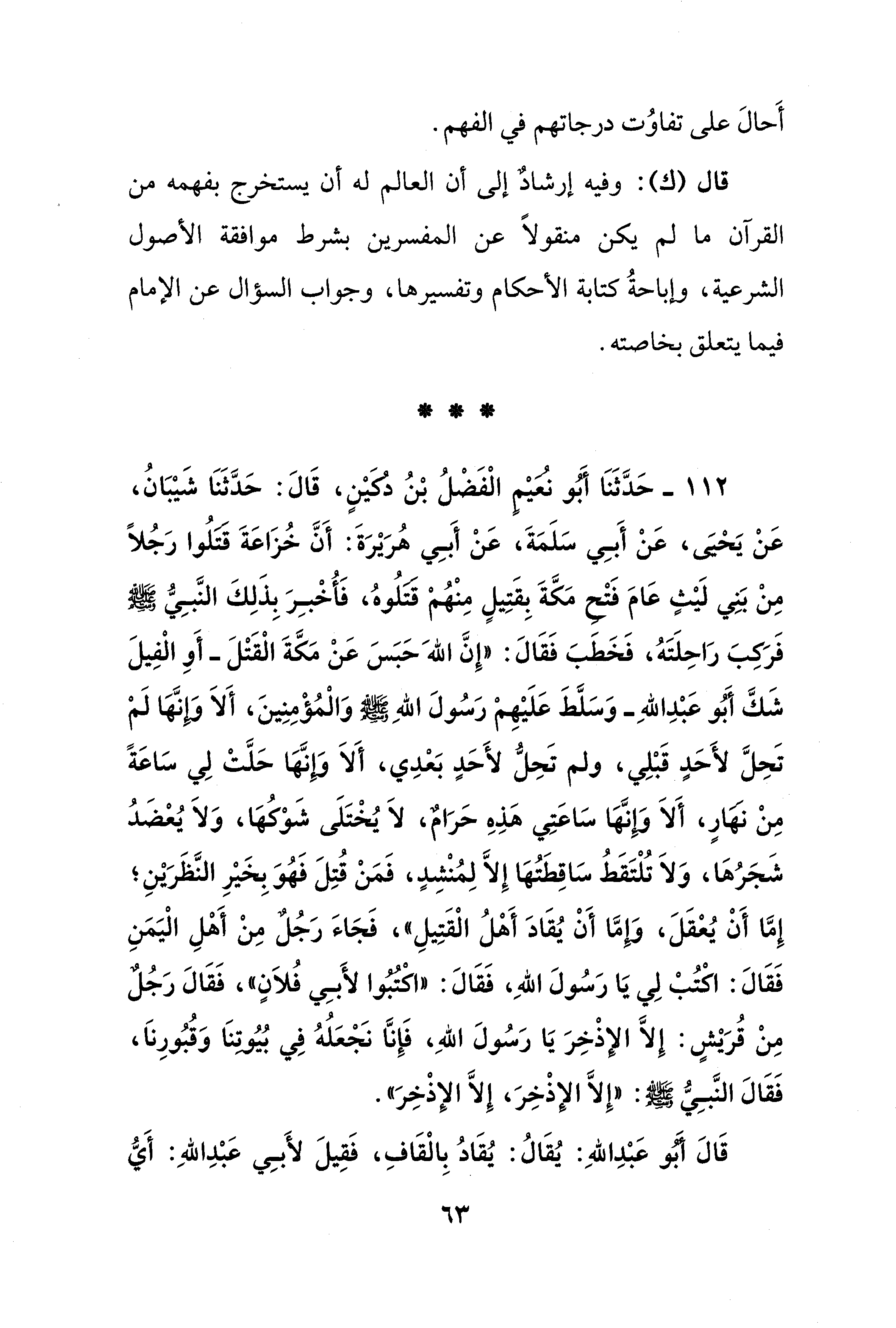 112 - حَدَّثَنَا أَبُو نُعَيْمٍ الْفَضْلُ بْنُ دُكَيْنٍ، قَالَ: حَدَّثَنَا شَيْبَانُ، عَنْ يَحْيَى، عَنْ أَبِي سَلَمَةَ، عَنْ أَبِي هُرَيْرَةَ: أَنَّ خُزَاعَةَ قتَلُوا رَجُلًا مِنْ بَنِي لَيْثٍ عَامَ فَتْحِ مَكَّةَ بِقَتِيلٍ مِنْهُمْ قتَلُوهُ، فَأُخْبِرَ بِذَلِكَ النَّبِيُّ - صلى الله عليه وسلم - فَرَكِبَ رَاحِلَتَهُ، فَخَطَبَ فَقَالَ: "إِنَّ اللهَ حَبَسَ عَنْ مَكَّةَ الْقَتْلَ -أَوِ الْفِيلَ شَكَّ أَبُو عَبْدِ اللهِ- وَسَلَّطَ عَلَيْهِمْ رَسُولَ اللهِ - صلى الله عليه وسلم - وَالْمُؤْمِنِينَ، أَلاَ وإِنَّهَا لَمْ تَحِلَّ لأَحَدٍ قَبْلِي، ولم تَحِلُّ لأَحَدٍ بَعْدِي، أَلاَ وَإِنَّهَا حَلَّتْ لِي سَاعَةً مِنْ نهَارٍ، أَلاَ وَإِنَّهَا سَاعَتِي هَذِهِ حَرَامٌ، لاَ يُخْتَلَى شَوْكُهَا، وَلاَ يُعْضَدُ شَجَرُهَا، وَلاَ تُلْتَقَطُ سَاقِطَتُهَا إِلَّا لِمُنْشِدٍ، فَمَنْ قُتِلَ فَهُوَ بِخَيْرِ النَّظَرَيْنِ؛ إِمَّا أَنْ يُعْقَلَ، وَإِمَّا أَنْ يُقَادَ أَهْلُ الْقَتِيلِ"، فَجَاءَ رَجُلٌ مِنْ أَهْلِ الْيَمَنِ فَقَالَ: اكتُبْ لِي يَا رَسُولَ اللهِ، فَقَالَ: "اكْتُبُوا لأَبِي فُلاَنٍ"، فَقَالَ رَجُلٌ مِنْ قُرَيْشٍ: إِلَّا الإذْخِرَ يَا رَسُولَ اللهِ، فَإِنَّا نَجْعَلُهُ فِي بُيُوتنَا وَقُبُورِناَ، فَقَالَ النَّبِيُّ - صلى الله عليه وسلم -: "إلَّا الإذْخِرَ، إلَّا الإذْخِر".