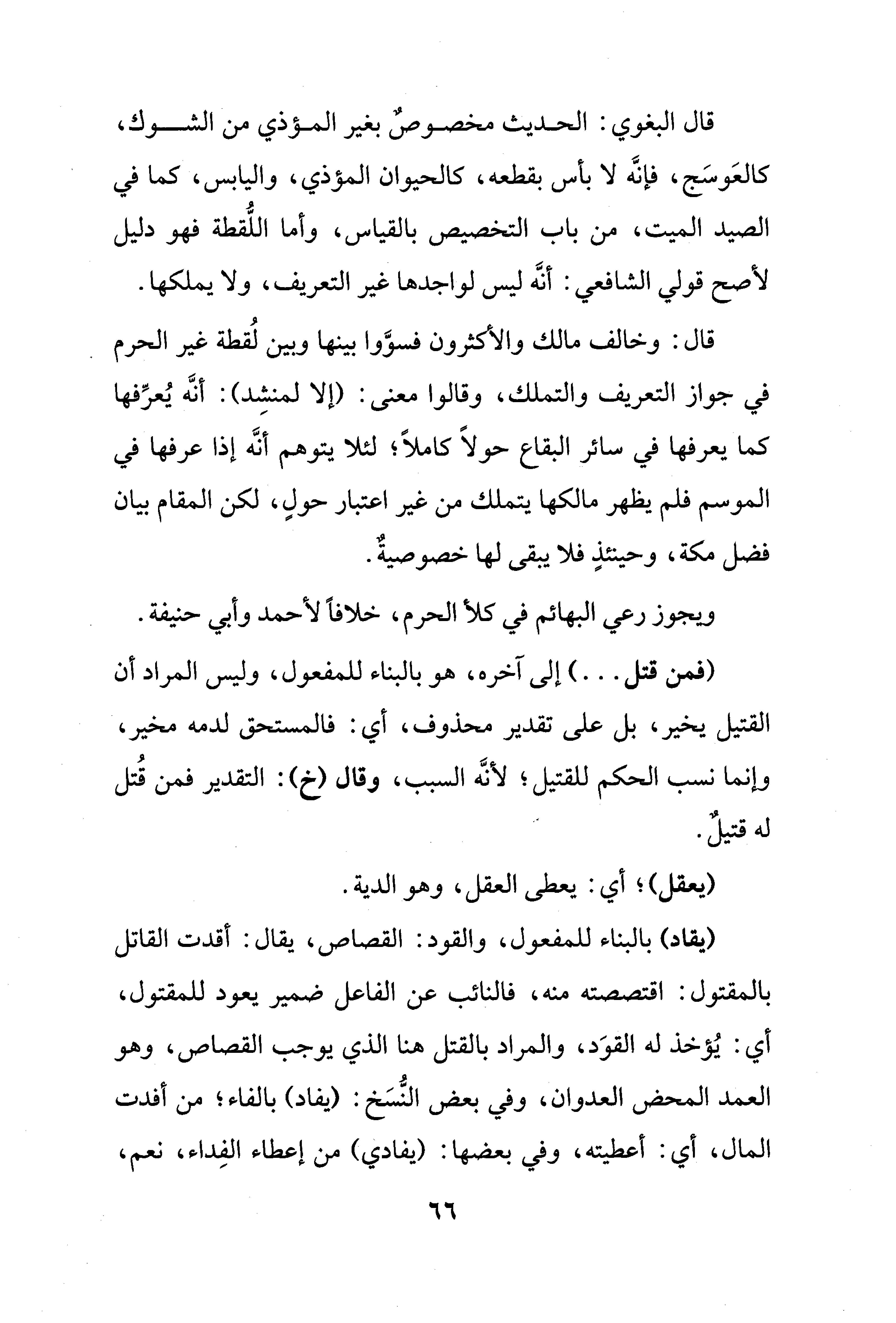 قال البغوي: الحديث مخصوصٌ بغير المؤذي من الشوك، كالعَوسَج، فإنَّه لا بأس بقطعه، كالحيوان المؤذي، واليابس، كما في الصيد الميت، من باب التخصيص بالقياس، وأما اللُّقطة فهو دليل لأصح قولي الشافعي: أنَّه ليس لواجدها غير التعريف، ولا يملكها.