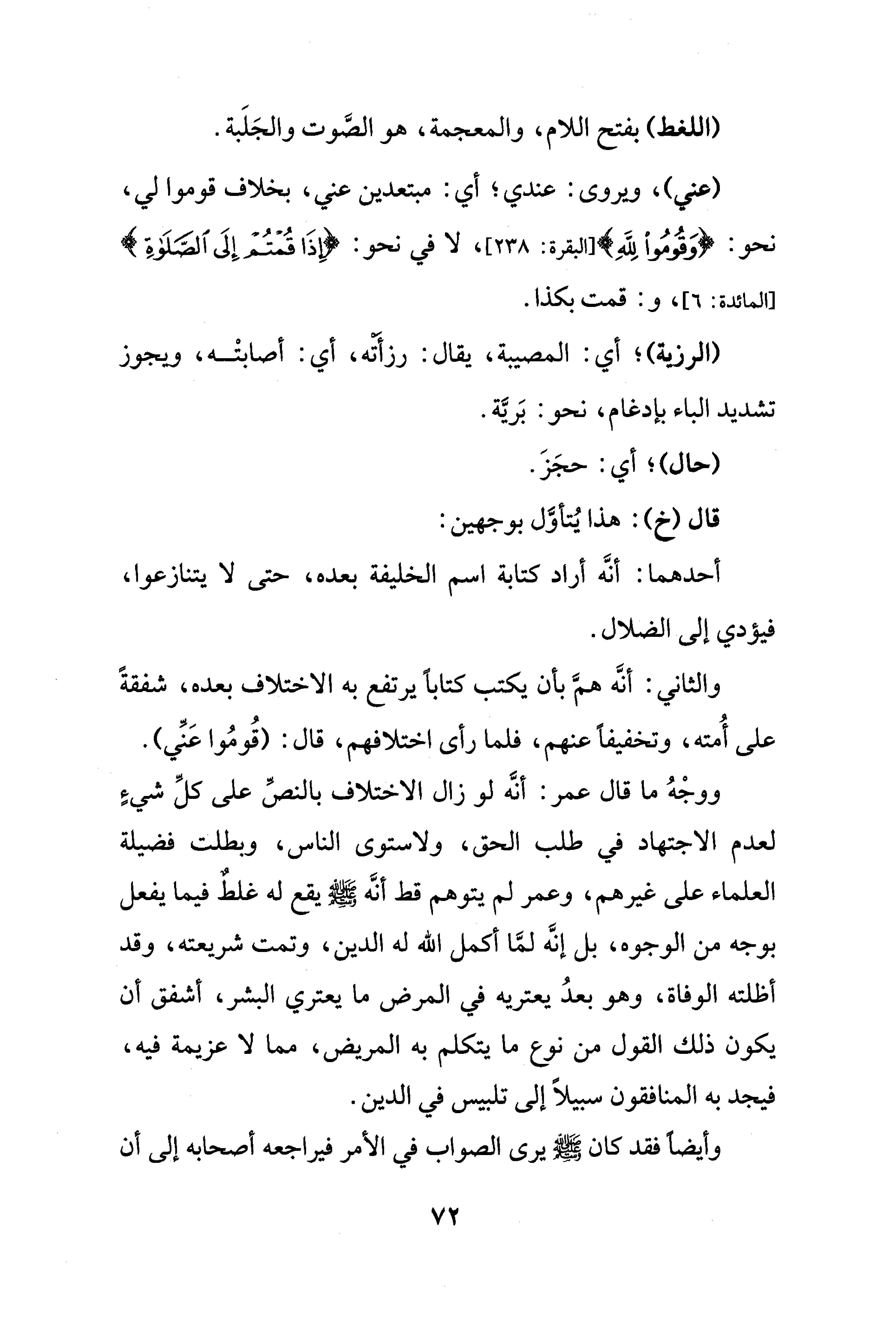 ووجْهُ ما قال عمر: أنَّه لو زال الاختلاف بالنصِّ على كلِّ شي لعدم الاجتهاد في طلب الحق، ولاستوى الناس، وبطلت فضيلة العلماء على غيرهم، وعمر لم يتوهم قط أنَّه - صلى الله عليه وسلم - يقع له غلطٌ فيما يفعل بوجه من الوجوه، بل إنَّه لمَّا أكمل الله له الدين، وتمت شريعته، وقد أظلته الوفاة، وهو بعدُ يعتريه في المرض ما يعتري البشر، أشفق أن يكون ذلك القول من نوع ما يتكلم به المريض، مما لا عزيمة فيه، فيجد به المنافقون سبيلًا إلى تلبيس في الدين.
