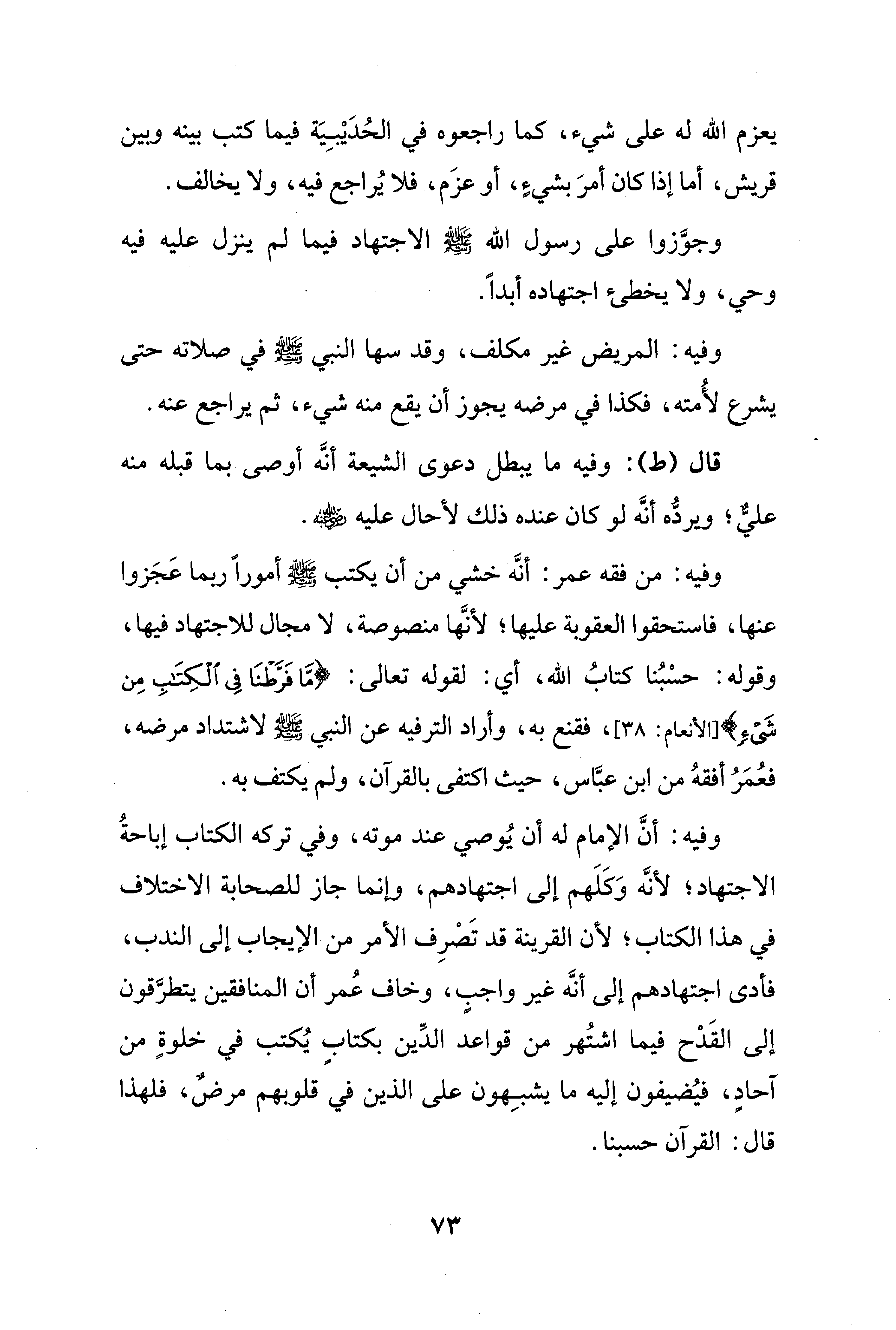 وفيه: أنَّ الإمام له أن يُوصي عند موته، وفي تركه الكتاب إباحةُ الاجتهاد؛ لأنَّه وَكَلَهم إلى اجتهادهم، وإنما جاز للصحابة الاختلاف في هذا الكتاب؛ لأن القرينة قد تَصْرِف الأمر من الإيجاب إلى الندب، فأدى اجتهادهم إلى أنَّه غير واجبٍ، وخاف عُمر أن المنافقين يتطرَّقون إلى القَدْح فيما اشتُهر من قواعد الدِّين بكتابٍ يُكتب في خلوةٍ من آحادٍ، فيُضيفون إليه ما يشبِهون على الذين في قلوبهم مرضٌ، فلهذا قال: القرآن حسبنا.