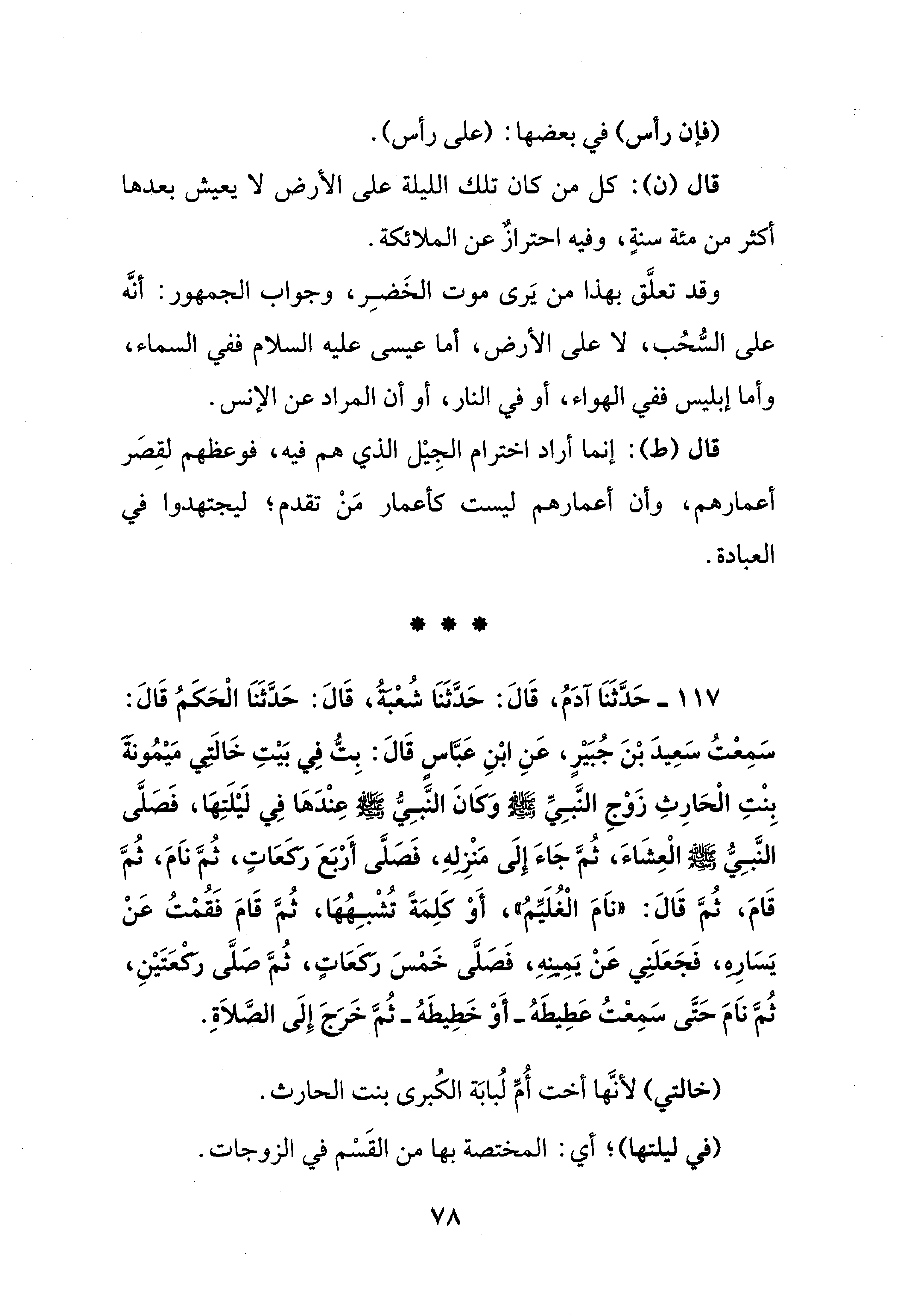 117 - حَدَّثَنَا آدَمُ، قَالَ: حَدَّثَنَا شُعْبَةُ، قَالَ: حَدَّثَنَا الْحَكَمُ قَالَ: سَمِعْتُ سَعِيدَ بْنَ جُبَيْرٍ، عَنِ ابْنِ عَبَّاسٍ قَالَ: بِتُّ فِي بَيْتِ خَالَتِي مَيْمُونَةَ بِنْتِ الْحَارِثِ زَوْجِ النَّبِيِّ - صلى الله عليه وسلم - وَكَانَ النَّبِيُّ - صلى الله عليه وسلم - عِنْدَهَا فِي لَيْلَتِهَا، فَصَلَّى النَّبِيُّ - صلى الله عليه وسلم - الْعِشَاءَ، ثُمَّ جَاءَ إِلَى مَنْزِلِهِ، فَصَلَّى أَرْبَعَ ركَعَاتٍ، ثُمَّ ناَمَ، ثُمَّ قَامَ، ثُمَّ قَالَ: "ناَمَ الْغُلَيِّمُ"، أَوْ كلِمَةً تُشْبِهُهَا، ثُمَّ قَامَ فَقُمْتُ عَنْ يَسَارِهِ، فَجَعَلَنِي عَنْ يَمِينِهِ، فَصَلَّى خَمْسَ ركَعَاتٍ، ثُمَّ صَلَّى ركْعَتَيْنِ، ثُمَّ ناَمَ حَتَّى سَمِعْتُ عَطِيطَهُ -أَوْ خَطِيطَهُ- ثمَّ خَرَجَ إلَى الصَّلاَةِ.