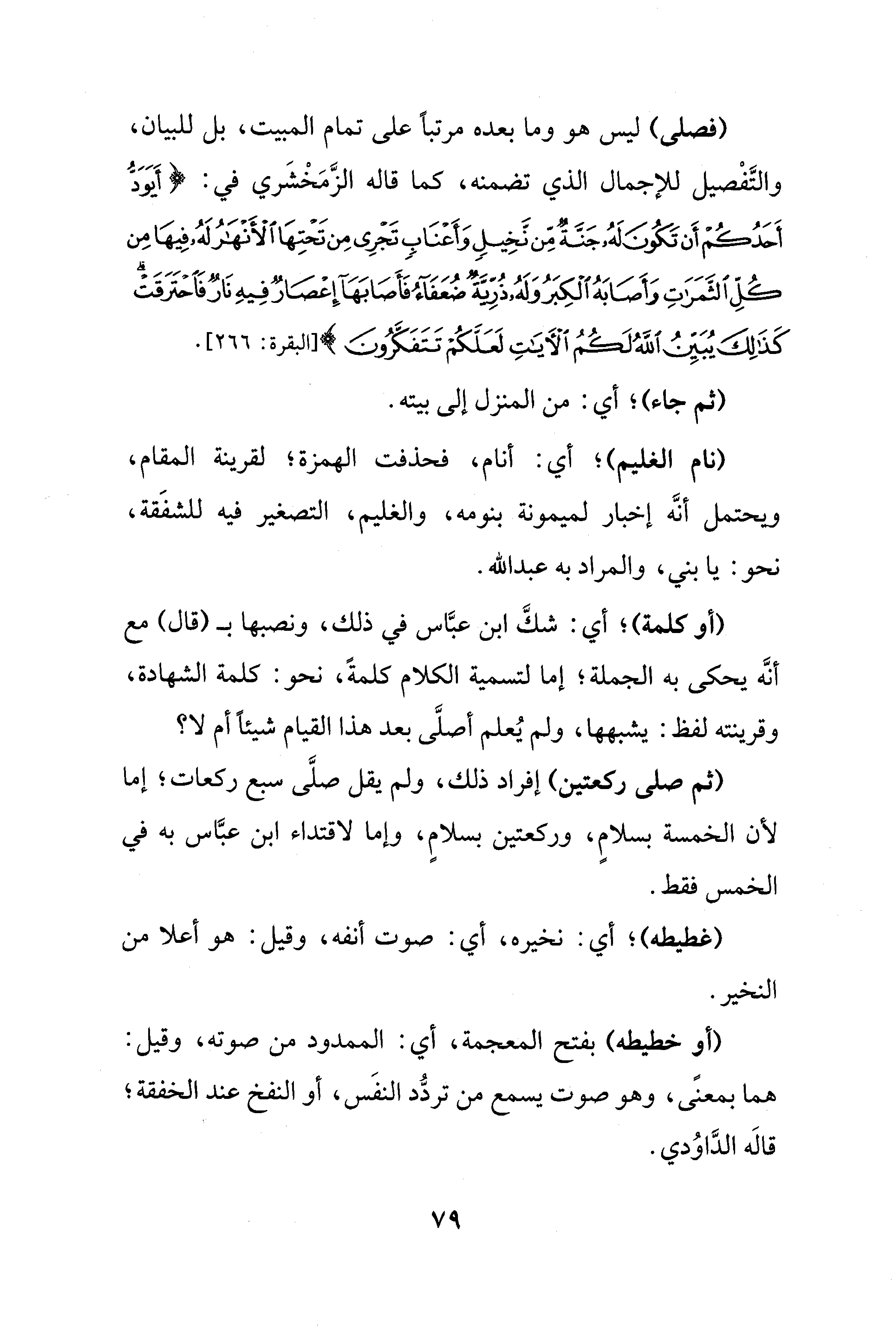 (فصلى) ليس هو وما بعده مرتبًا على تمام المبيت، بل للبيان، والتَّفْصيل للإجمال الذي تضمنه، كما قاله الزَّمَخْشَري في: {أَيَوَدُّ أَحَدُكُمْ أَنْ تَكُونَ لَهُ جَنَّةٌ مِنْ نَخِيلٍ وَأَعْنَابٍ تَجْرِي مِنْ تَحْتِهَا الْأَنْهَارُ لَهُ فِيهَا مِنْ كُلِّ الثَّمَرَاتِ وَأَصَابَهُ الْكِبَرُ وَلَهُ ذُرِّيَّةٌ ضُعَفَاءُ فَأَصَابَهَا إِعْصَارٌ فِيهِ نَارٌ فَاحْتَرَقَتْ كَذَلِكَ يُبَيِّنُ اللَّهُ لَكُمُ الْآيَاتِ لَعَلَّكُمْ تَتَفَكَّرُونَ} [البقرة: 266].