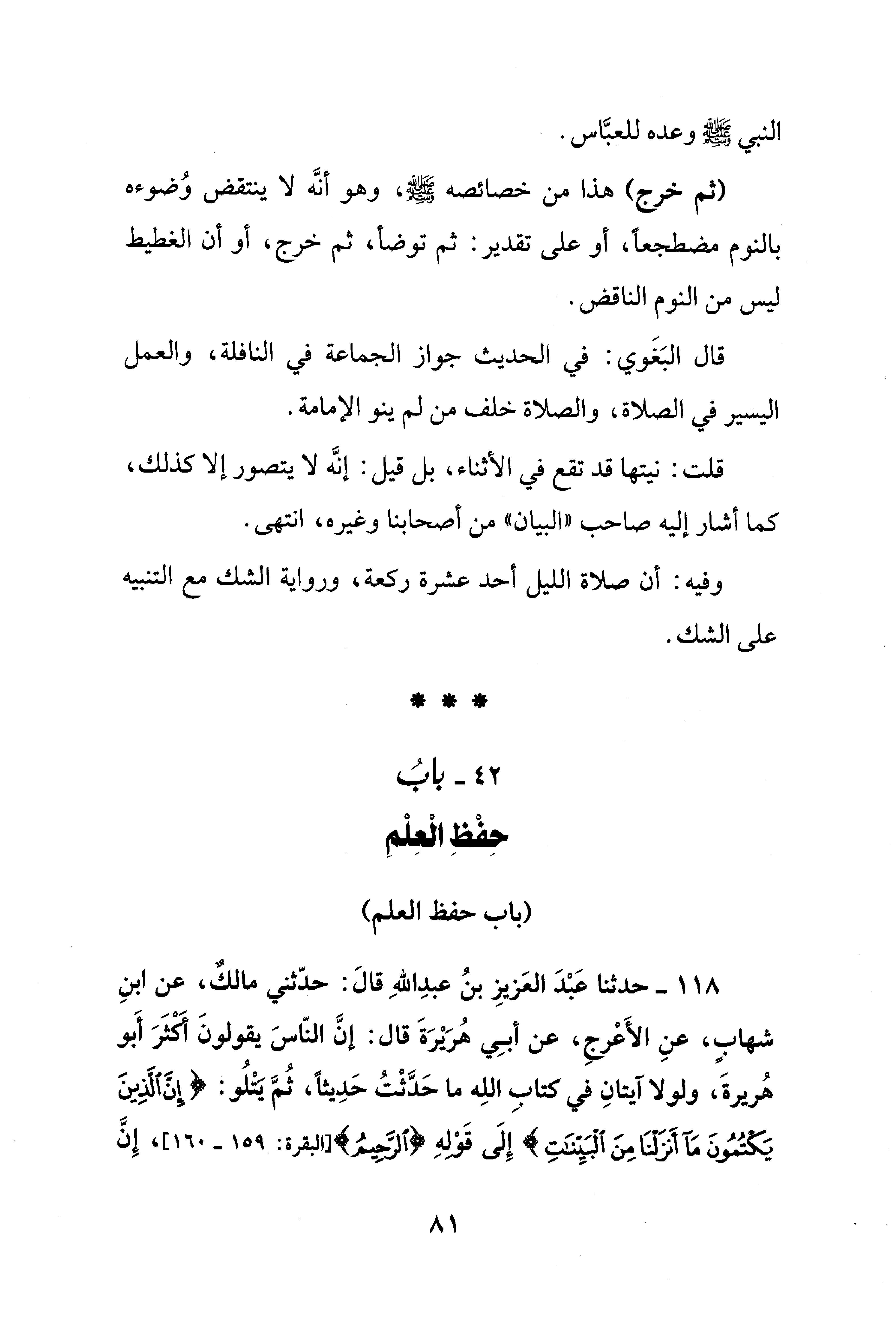 118 - حدثنا عَبْدَ العَزيزِ بنُ عبدِ اللهِ قالَ: حدَّثني مالكٌ، عن ابنِ شهابٍ، عنِ الأَعْرجِ، عن أبِي هُرَيْرَةَ قال: إنَّ النَّاسَ يقولونَ أَكثَرَ أَبو هُريرةَ، ولولا آيتانِ في كتابِ اللهِ ما حَدَّثْتُ حَدِيثًا، ثُمَّ يتْلُو: {إِنَّ الَّذِينَ يَكْتُمُونَ مَا أَنْزَلْنَا مِنَ الْبَيِّنَاتِ} [البقرة: 159 - 160]، إنَّ