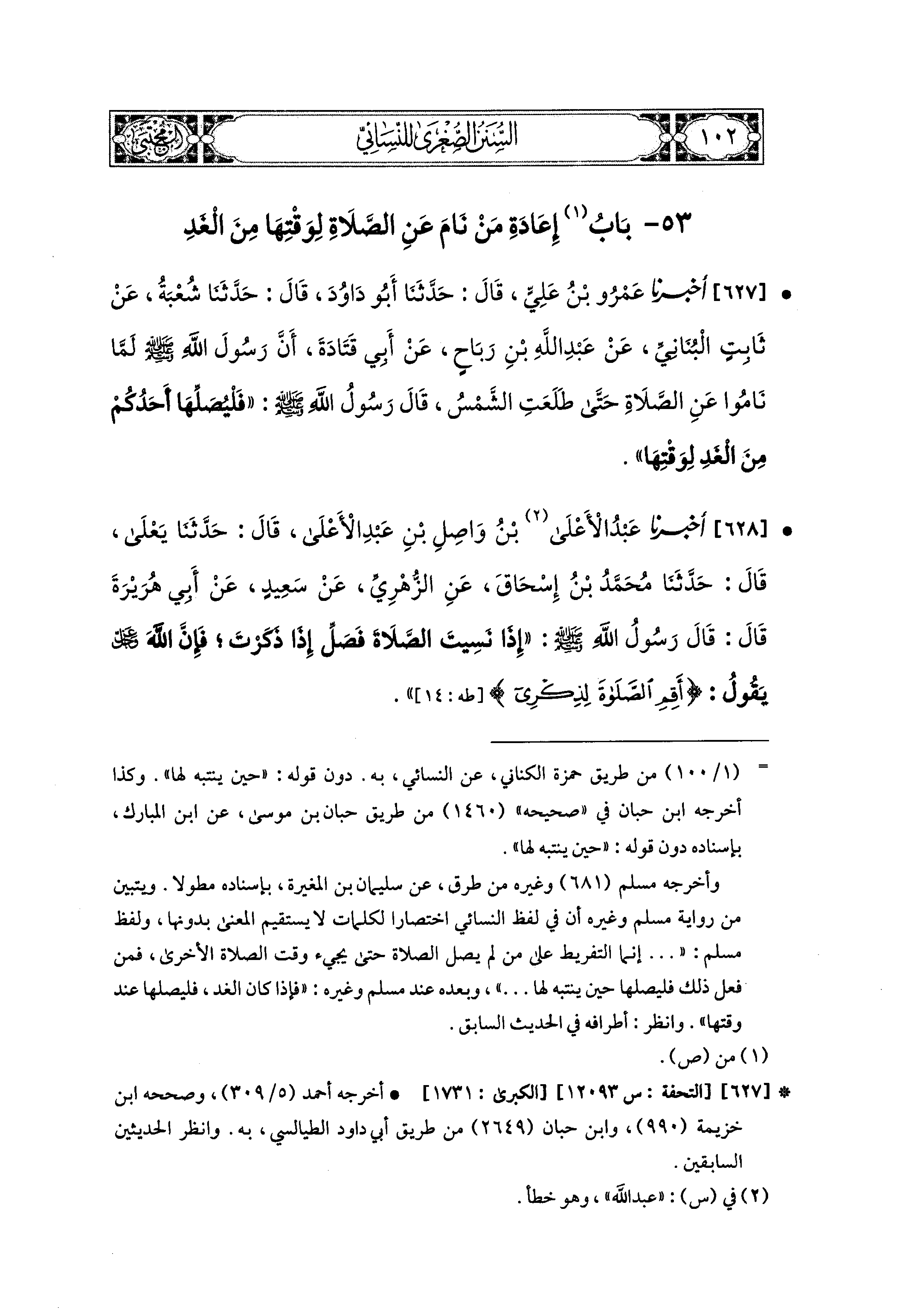 627- أَخبَرنا عَمْرُو بنُ عَلِيٍّ، قال: حَدثنا أَبو دَاوُدَ، قال: حَدثنا شُعبَةُ، عَن ثَابِتٍ البُنَانيِّ، عَن عَبد اللهِ بن رَبَاحٍ، عَن أَبي قَتَادَةَ، أَنَّ رَسُولَ اللهِ صَلى الله عَليه وسَلم لَمَّا نَامُوا عَنِ الصَّلاَةِ حَتَّى طَلَعَتِ الشَّمْسُ، قَالَ رَسُولُ اللهِ صَلى الله عَليه وسَلم: فَلْيُصَلِّهَا أَحَدُكُمْ مِنَ الغَدِ لِوَقْتِهَا.