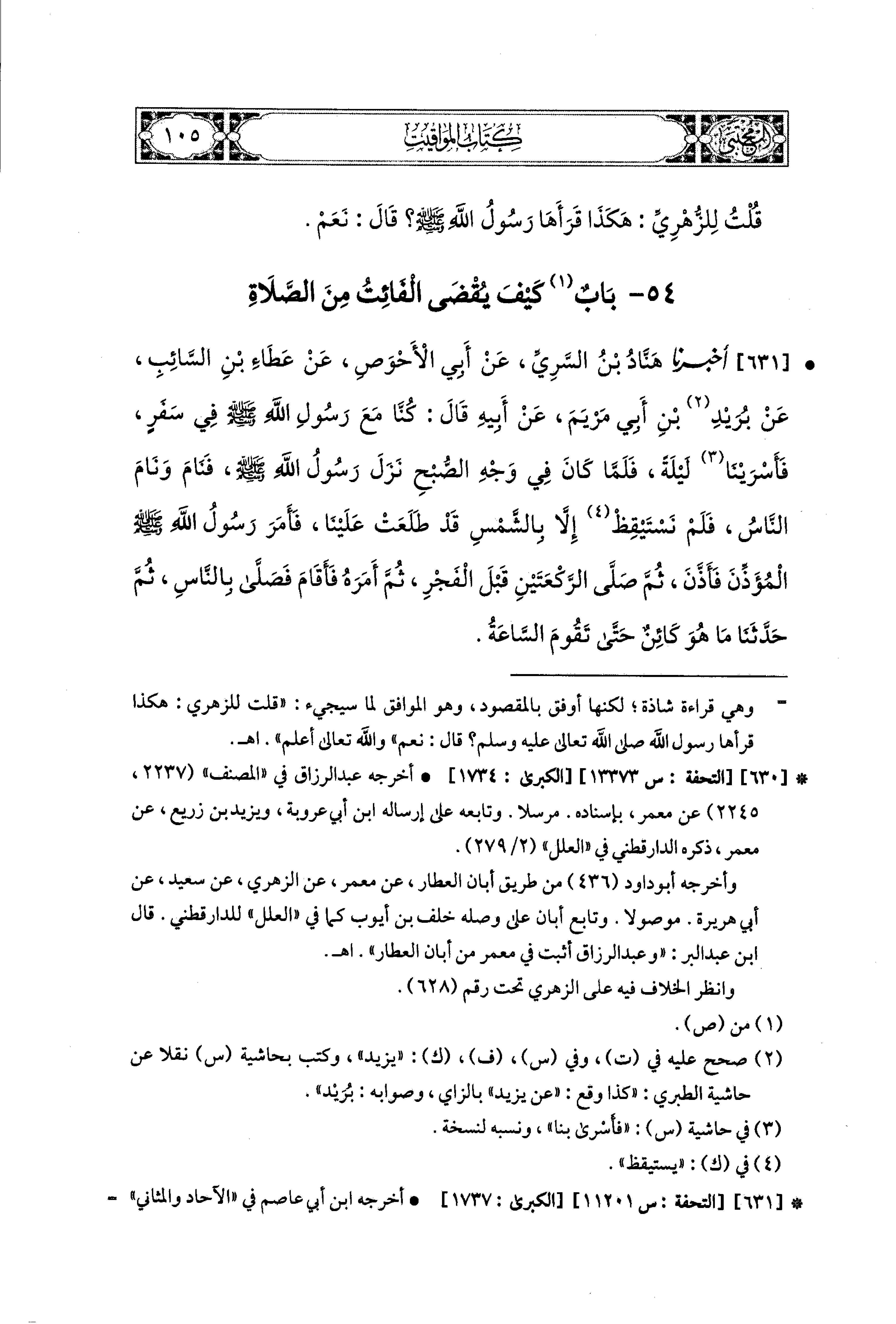 631- أَخبَرنا هَنَّادُ بنُ السَّرِيِّ، عَن أَبي الأَحْوَصِ، عَن عَطَاءِ بْنِ السَّائِبِ، عَن بُرَيْدِ بْنِ أَبي مَرْيَمَ، عَن أَبيهِ، قَالَ: كُنَّا مَعَ رَسُولِ اللهِ صَلى الله عَليه وسَلم فِي سَفَرٍ فَأَسْرَيْنَا لَيْلَةً، فَلَمَّا كَانَ فِي وَجْهِ الصُّبْحِ، نَزَلَ رَسُولُ اللهِ صَلى الله عَليه وسَلم فَنَامَ وَنَامَ النَّاسُ، فَلَمْ نَسْتَيْقِظْ إِلاَّ بِالشَّمْسِ قَدْ طَلَعَتْ عَلَيْنَا، فَأَمَرَ رَسُولُ اللهِ صَلى الله عَليه وسَلم المُؤَذِّنَ، فَأَذَّنَ، ثُمَّ صَلَّى الرَّكْعَتَيْنِ قَبْلَ الفَجْرِ، ثُمَّ أَمَرَهُ فَأَقَامَ فَصَلَّى بِالنَّاسِ، ثُمَّ حَدَّثَنَا مَا هُوَ كَائِنٌ حَتَّى تَقُومَ السَّاعَةُ.