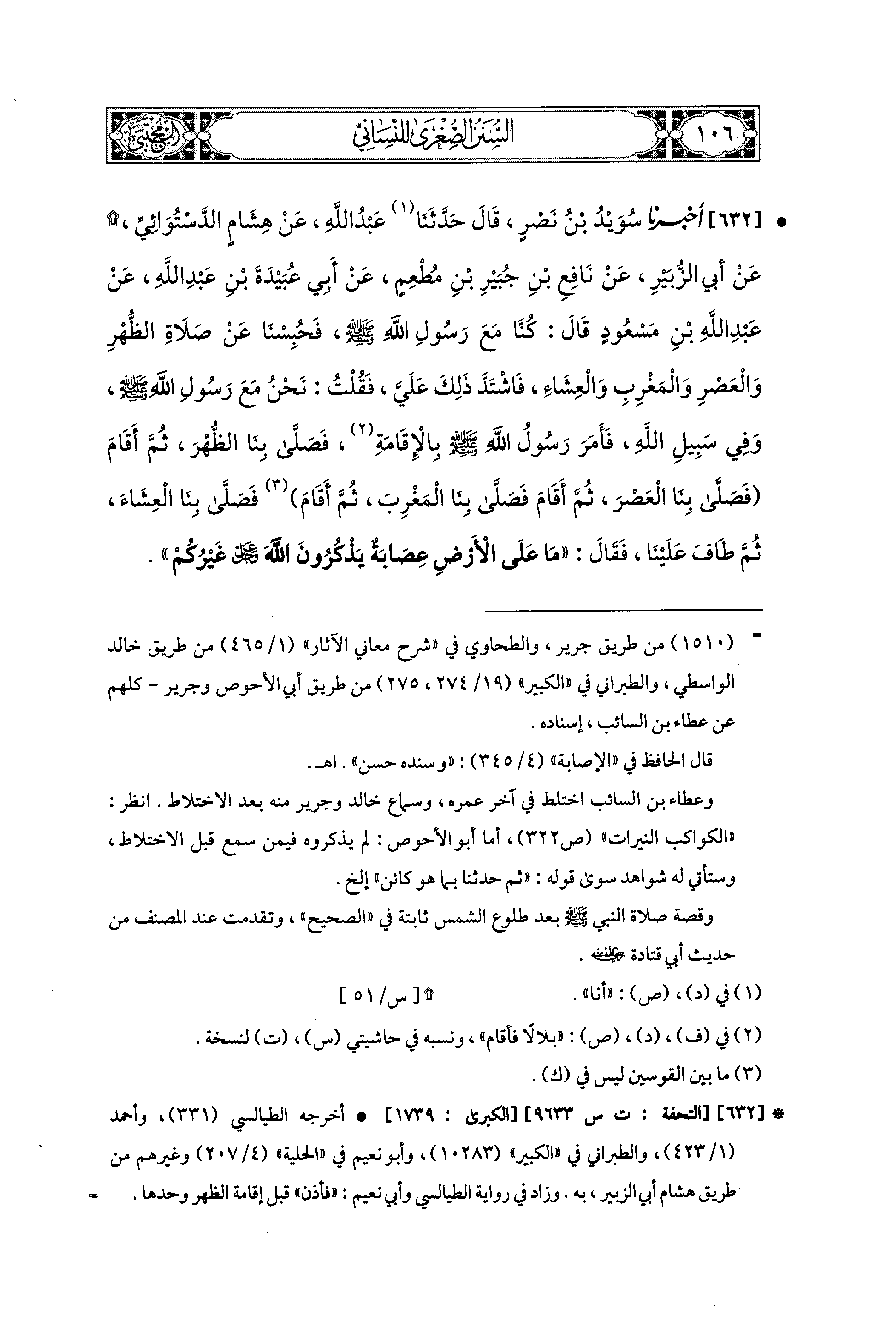 632- أَخبَرنا سُوَيْدُ بنُ نَصْرٍ، قال: حَدثنا عَبدُ اللهِ، عَن هِشَامٍ الدَّسْتَوَائِيِّ، عَن أَبي الزُّبَيْرِ، عَن نَافِعِ بْنِ جُبَيْرِ بْنِ مُطْعِمٍ، عَن أَبي عُبَيدَةَ بْنِ عَبدِ اللهِ، عَن عَبد اللهِ بن مَسْعُودٍ قَالَ: كُنَّا مَعَ رَسُولِ اللهِ صَلى الله عَليه وسَلم فَحُبِسْنَا عَن صَلاَةِ الظُّهْرِ وَالعَصْرِ وَالمَغْرِبِ وَالعِشَاء، فَاشْتَدَّ ذَلِكَ عَلَيَّ، فَقُلْتُ: نَحْنُ مَعَ رَسُولِ اللهِ صَلى الله عَليه وسَلم وَفِي سَبِيلِ اللهِ، فَأَمَرَ رَسُولُ اللهِ صَلى الله عَليه وسَلم، بالإقامة فَصَلَّى بِنَا الظُّهْرَ، ثُمَّ أَقَامَ فَصَلَّى بِنَا العَصْرَ، ثُمَّ أَقَامَ فَصَلَّى بِنَا المَغْرِبَ، ثُمَّ أَقَامَ فَصَلَّى بِنَا العِشَاء، ثُمَّ طَافَ عَلَيْنَا، فَقَالَ: مَا عَلَى الأَرضِ عِصَابَةٌ يَذْكُرُونَ اللهَ عَزَّ وَجَلَّ غَيْرُكُمْ.
