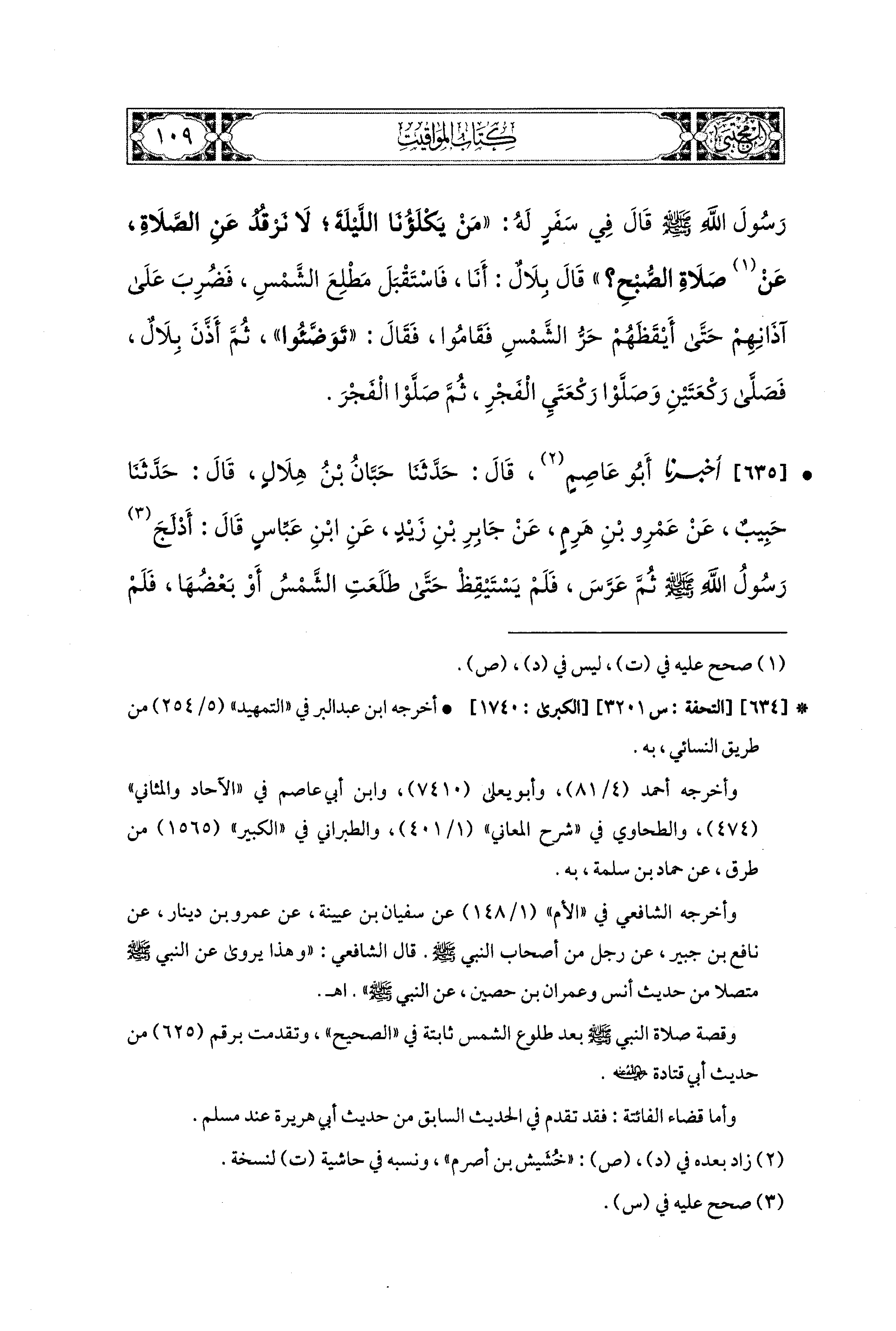635- أَخبَرنا أَبو عَاصِمٍ، قال: حَدثنا حَبَّانُ بنُ هِلاَلٍ، قال: حَدَّثَنَا حَبِيبٌ (1)، عَن عَمْرِو بْنِ هَرِمٍ، عَن جَابِرِ بْنِ زَيْدٍ، عَنِ ابنِ عَبَّاسٍ، قَالَ: أَدْلَجَ رَسُولُ اللهِ صَلى الله عَليه وسَلم، ثُمَّ عَرَّسَ فَلَمْ يَسْتَيْقِظْ حَتَّى طَلَعَتِ الشَّمْسُ، أَوْ بَعْضُهَا، فَلَمْ يُصَلِّ حَتَّى ارْتَفَعَتِ الشَّمْسُ، فَصَلَّى وَهِيَ صَلاَةُ الوُسْطَى.