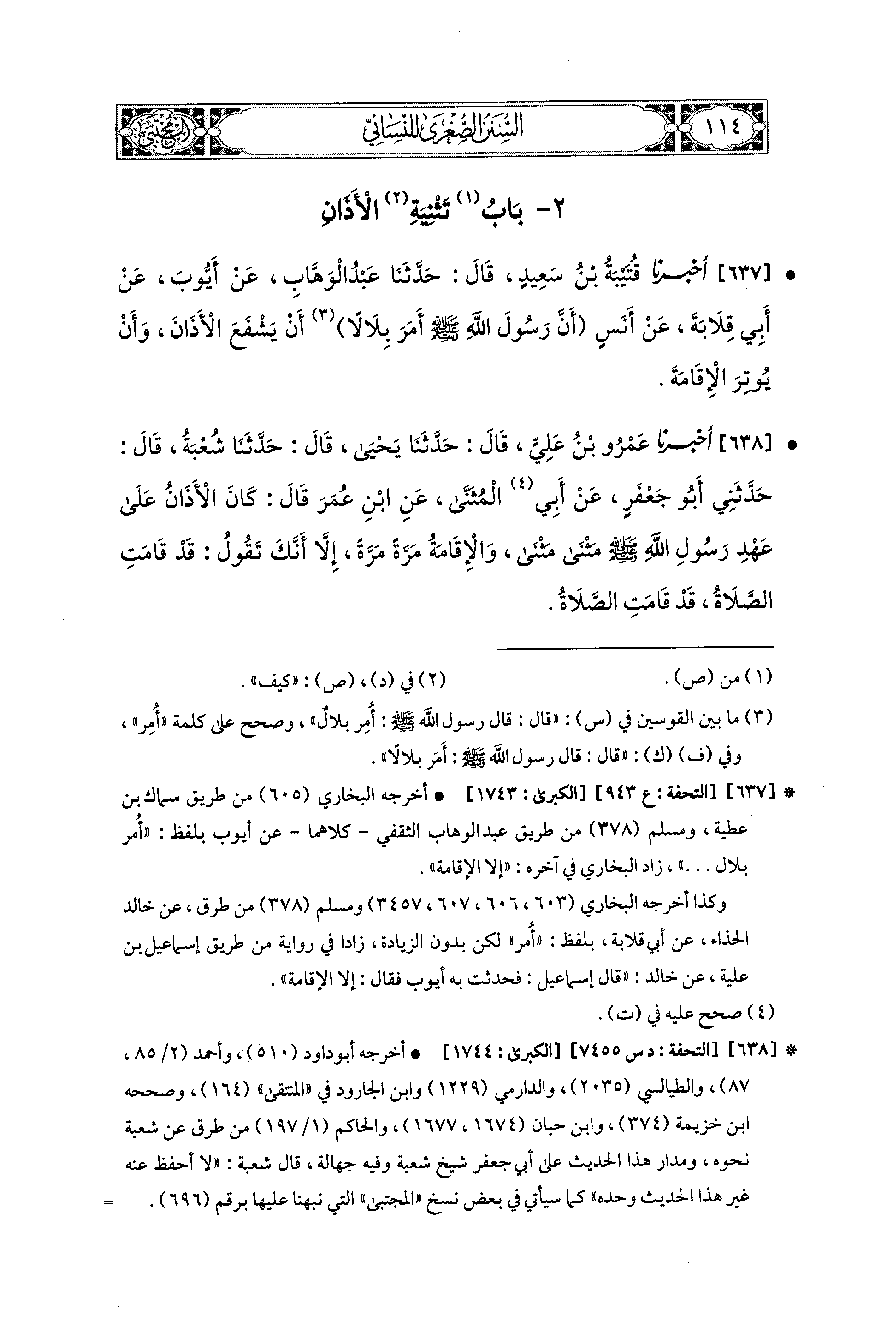 637- أَخبَرنا قُتَيبَةُ بنُ سَعيدٍ، قال: حَدثنا عَبدُ الوَهَّابِ، عَن أَيُّوبَ، عَن أَبي قِلاَبَةَ، عَن أَنَسٍ, أَنَّ رَسُولَ اللهِ صَلى الله عَليه وسَلم أَمَرَ بِلاَلاً أَنْ يَشْفَعَ الأَذَانَ، وَأَنْ يُوتِرَ الإِقَامَةَ.
