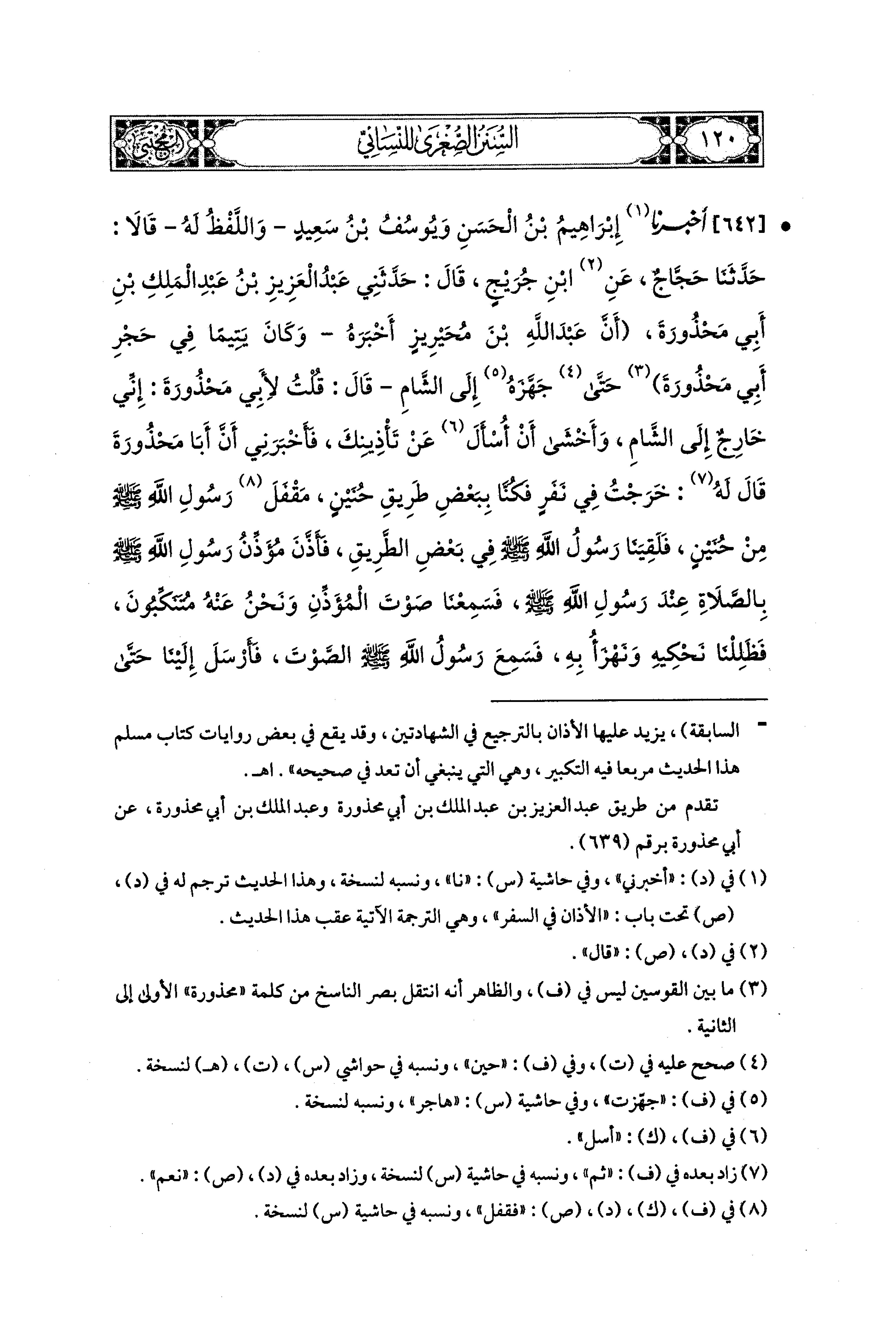642- أَخبَرنا إِبراهِيمُ بنُ الحَسَنِ، وَيُوسُفُ بنُ سَعيدٍ، وَاللَّفْظُ لَهُ، قَالاَ: حَدَّثَنَا حَجَّاجٌ، عَنِ ابنِ جُرَيْجٍ، قَالَ: حَدَّثَني عَبدُ العَزِيزِ بنُ عَبدِ المَلِكِ بْنِ أَبي مَحْذُورَةَ أَنَّ عَبدَ اللهِ بْنَ مُحَيْرِيزٍ أَخْبَرَهُ وَكَانَ يَتِيمًا فِي حِجْرِ أَبي مَحْذُورَةَ حَتَّى جَهَّزَهُ إِلَى الشَّامِ، قَالَ: قُلْتُ لأَبي مَحْذُورَةَ إِنِّي خَارِجٌ إِلَى الشَّامِ وَأَخْشَى أَنْ أُسْأَلَ عَن تَأْذِينِكَ، فَأَخبَرني أَنَّ أَبَا مَحْذُورَةَ قَالَ لَهُ: خَرَجْتُ فِي نَفَرٍ فَكُنَّا بِبَعْضِ طَرِيقِ حُنَيْنٍ مَقْفَلَ رَسُولِ اللهِ صَلى الله عَليه وسَلم مِنْ حُنَيْنٍ، فَلَقِيَنَا رَسُولُ اللهِ صَلى الله عَليه وسَلم فِي بَعْضِ الطَّرِيقِ، فَأَذَّنَ مُؤَذِّنُ رَسُولِ اللهِ صَلى الله عَليه وسَلم بِالصَّلاَةِ عِنْدَ رَسُولِ اللهِ صَلى الله عَليه وسَلم فَسَمِعْنَا صَوْتَ المُؤَذِّنِ وَنَحْنُ عَنهُ مُتَنَكِّبُونَ، فَظَلِلْنَا نَحْكِيهِ وَنَهْزَأُ بِهِ، فَسَمِعَ رَسُولُ اللهِ صَلى الله عَليه وسَلم الصَّوْتَ فَأَرْسَلَ إِلَيْنَا حَتَّى وَقَفْنَا بَيْنَ يَدَيْهِ،