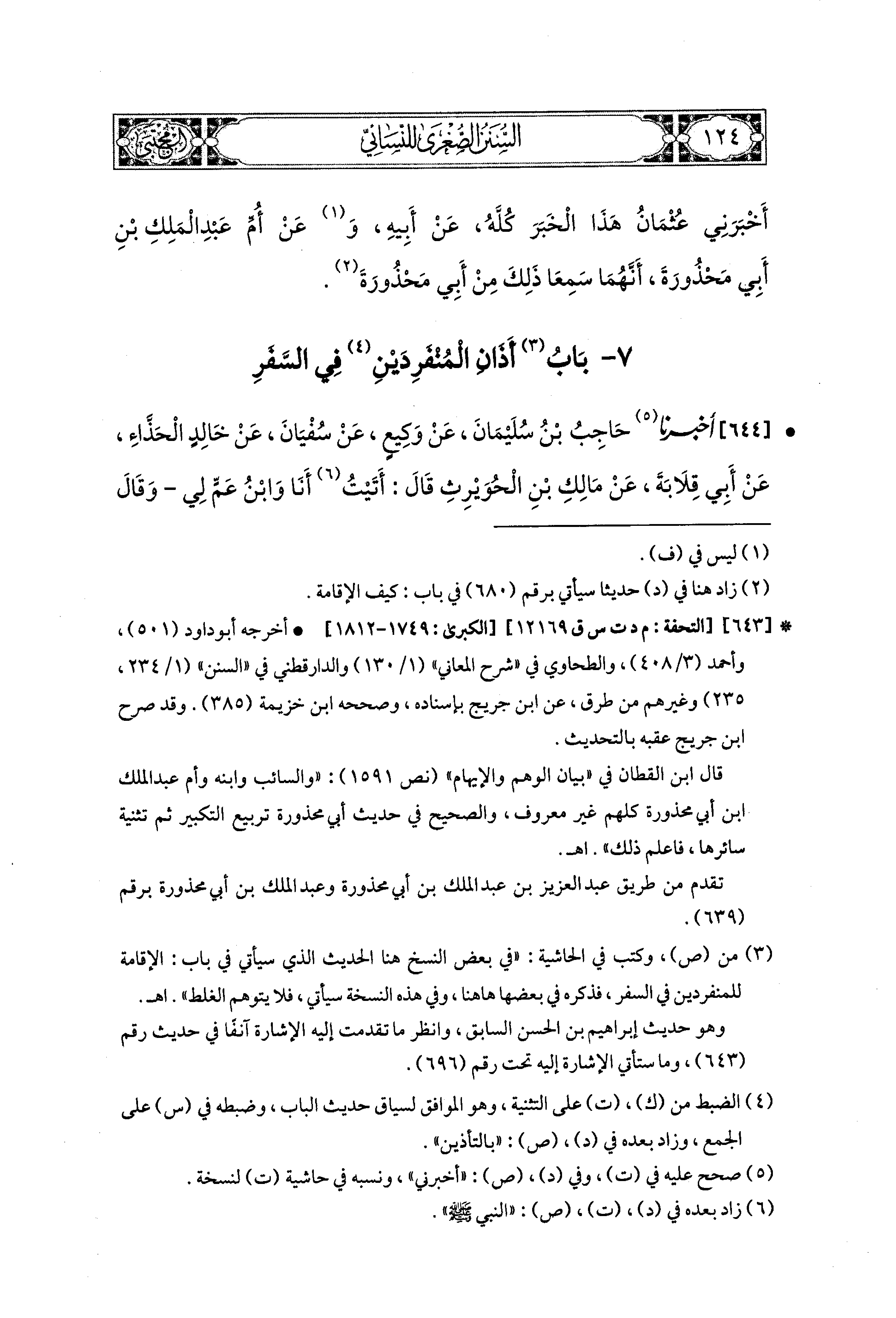 644- أَخبَرنا حَاجِبُ بنُ سُلَيمَانَ، عَن وَكِيعٍ، عَن سُفيَانَ، عَن خَالِدٍ الحَذَّاءِ، عَن أَبي قِلاَبَةَ، عَن مَالِكِ بْنِ الحُوَيْرِثِ قَالَ: أَتَيْتُ أَنَا وَابنُ عَمٍّ لِي، وَقَالَ مَرَّةً: أَنَا وَصَاحِبٌ لِي النَّبيَّ صَلى الله عَليه وسَلم، فَقَالَ: إِذَا سَافَرْتُمَا فَأَذِّنَا وَأَقِيمَا، وَلْيَؤُمَّكُمَا أَكْبَرُكُمَا.