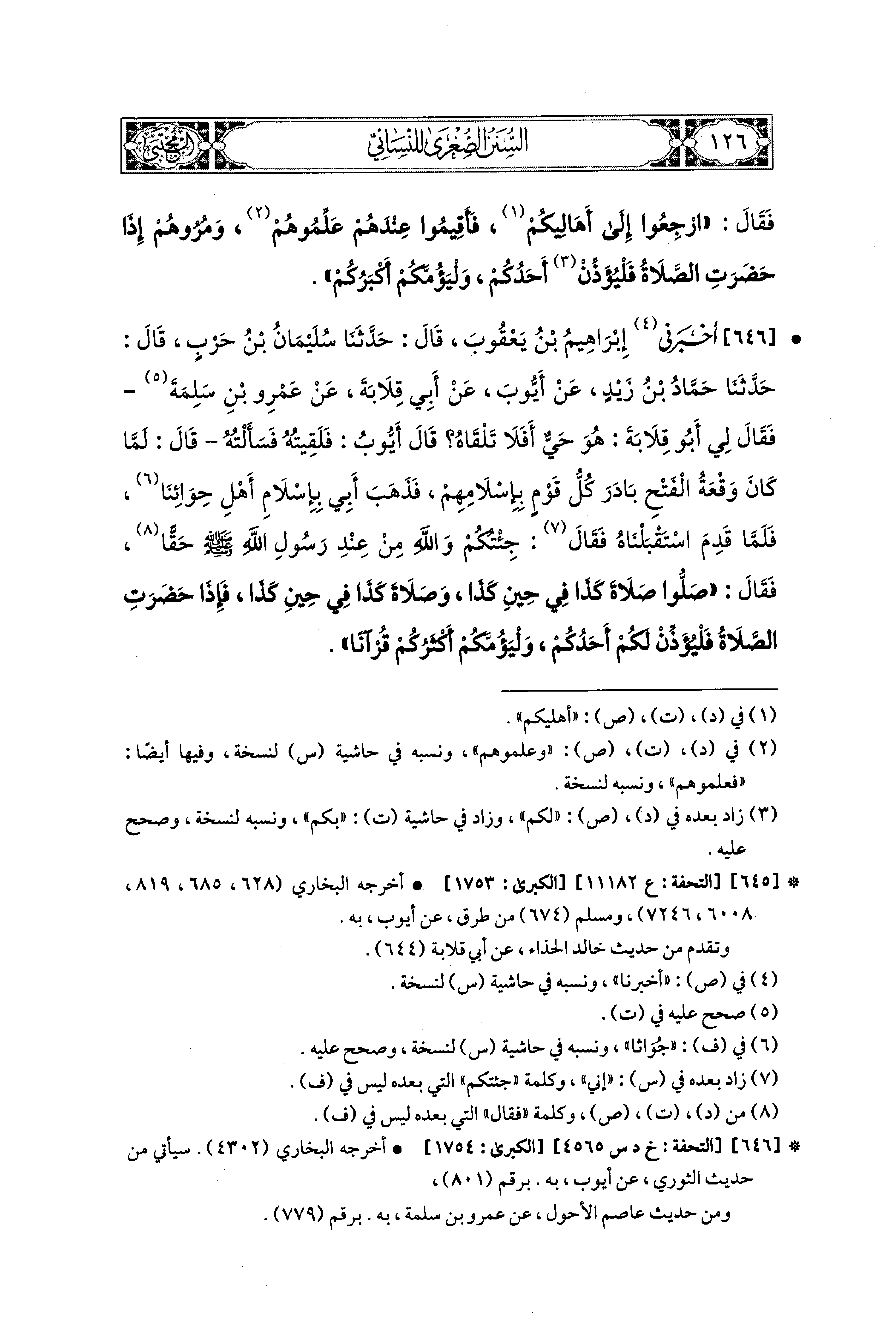 646- أَخبَرني إِبراهِيمُ بنُ يَعقُوبَ، قال: حَدثنا سُلَيمَانُ بنُ حَرْبٍ، قال: حَدثنا حَمَّادُ بنُ زَيْدٍ، عَن أَيُّوبَ، عَن أَبي قِلاَبَةَ، عَن عَمْرِو بْنِ سَلَمَةَ فَقَالَ لِي أَبو قِلاَبَةَ: هُوَ حَيٌّ أَفَلاَ تَلْقَاهُ؟ قَالَ أَيُّوبُ: فَلَقِيتُهُ فَسَأَلْتُهُ قَالَ: لَمَّا كَانَ وَقْعَةُ الفَتْحِ بَادَرَ كُلُّ قَوْمٍ بِإِسْلاَمِهِمْ، فَذَهَبَ أَبي بِإِسْلاَمِ أَهْلِ حِوَائِنَا، فَلَمَّا قَدِمَ اسْتَقْبَلْنَاهُ، فَقَالَ: جِئْتُكُمْ وَالله مِنْ عِنْدِ رَسُولِ اللهِ صَلى الله عَليه وسَلم حَقًّا، فَقَالَ: صَلُّوا صَلاَةَ كَذَا فِي حِينِ كَذَا، وَصَلاَةَ كَذَا فِي حِينِ كَذَا، فَإِذَا حَضَرَتِ الصَّلاَةُ فَلْيُؤَذِّنْ لَكُمْ أَحَدُكُمْ، وَلْيَؤُمَّكُمْ أَكْثَرُكُمْ قُرْآنًا.