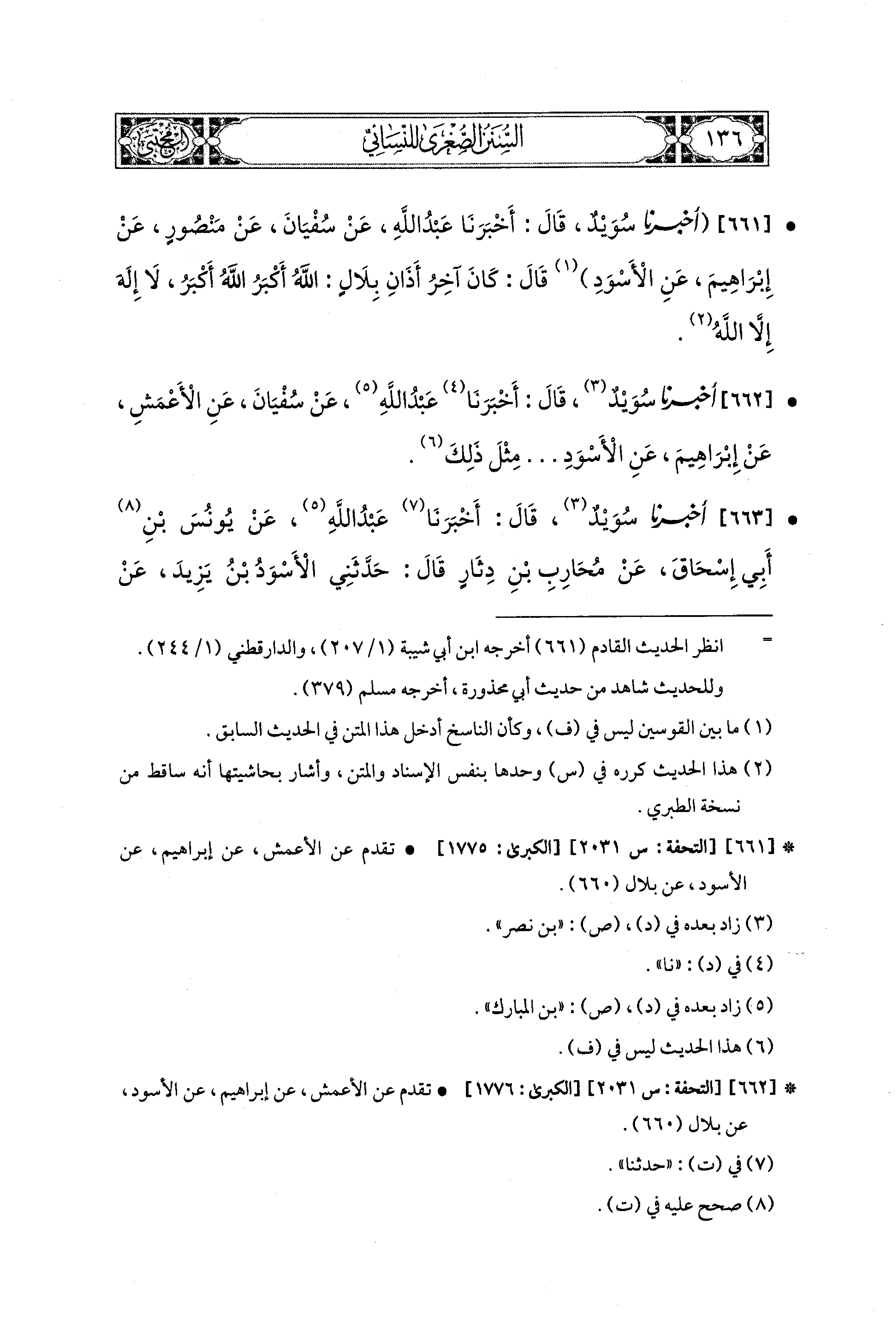 661- أَخبَرنا سُوَيْدٌ، قَالَ: أَخبَرنا عَبدُ اللهِ، عَن سُفيَانَ، عَن مَنْصُورٍ، عَن إِبراهِيمَ، عَنِ الأَسْوَدِ، قَالَ: كَانَ آخِرُ أَذَانِ بِلاَلٍ، اللهُ أَكْبَرُ، اللهُ أَكْبَرُ، لاَ إِلَهَ إِلاَّ اللهُ.