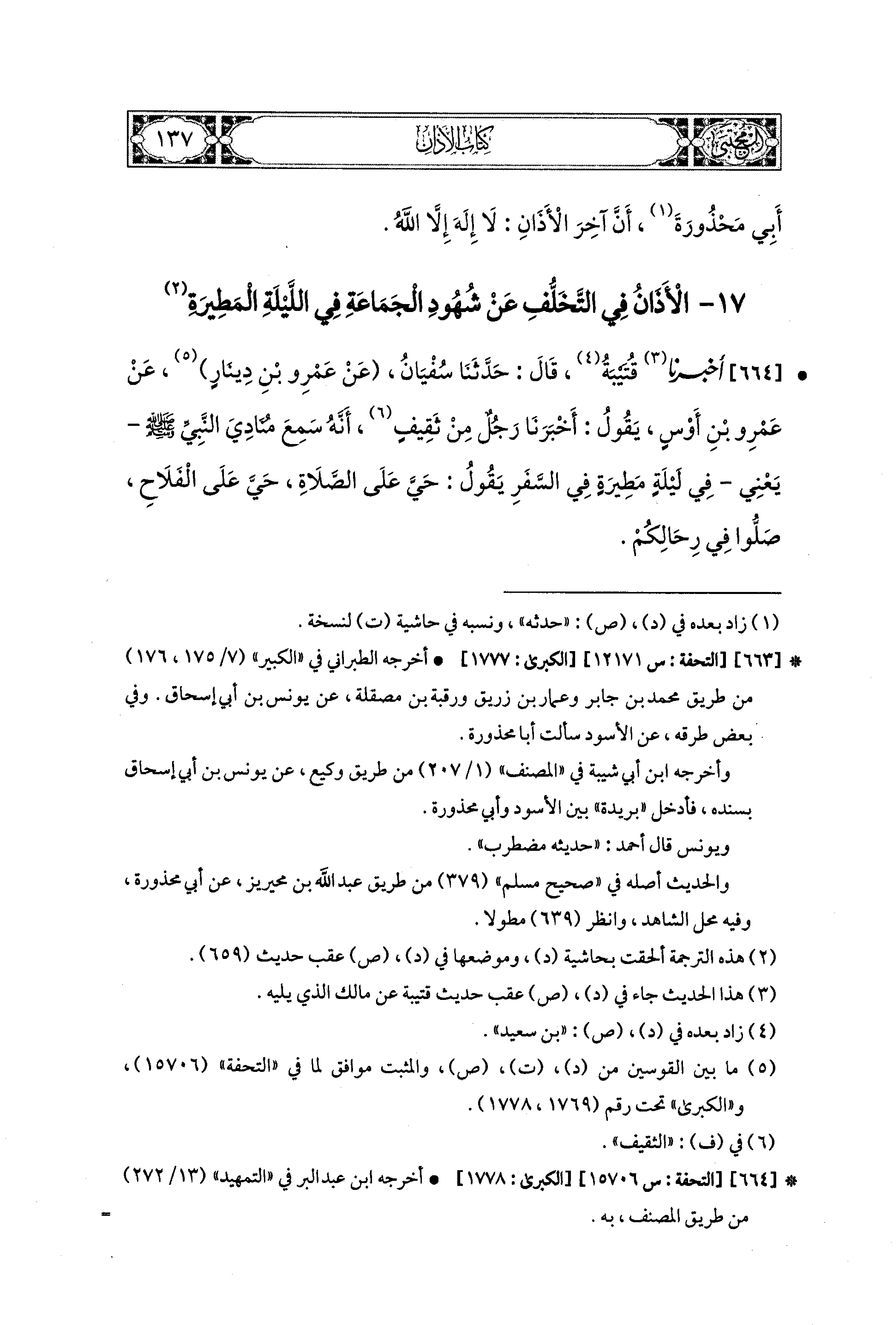 664- أَخبَرنا قُتَيبَةُ، قال: حَدثنا سُفيَانُ، عَن عَمرِو بن دِينارٍ، عَن عَمْرِو بْنِ أَوْسٍ يَقُولُ: أَخبَرنا رَجُلٌ مِنْ ثَقِيفٍ، أَنَّهُ سَمِعَ مُنَادِيَ النَّبيِّ صَلى الله عَليه وسَلم، يَعْني فِي لَيْلَةٍ مَطِيرَةٍ فِي السَّفَرِ، يَقُولُ: حَيَّ عَلَى الصَّلاَةِ، حَيَّ عَلَى الفَلاَحِ، صَلُّوا فِي رِحَالِكُمْ.