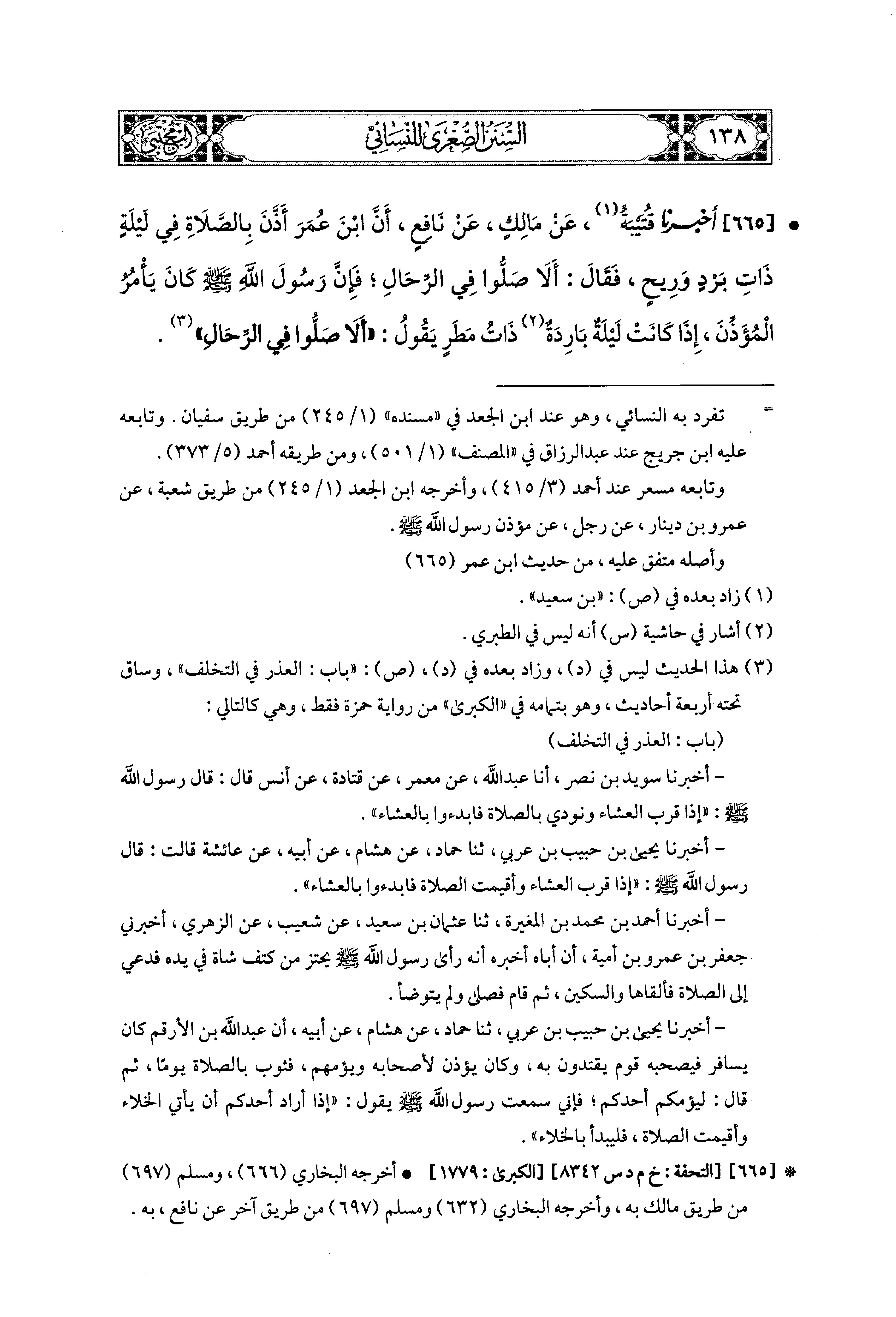 665- أَخبَرنا قُتَيبَةُ، عَن مَالِكٍ، عَن نَافِعٍ، أَنَّ ابنَ عُمَرَ أَذَّنَ بِالصَّلاَةِ فِي لَيْلَةٍ ذَاتِ بَرْدٍ وَرِيحٍ، فَقَالَ: أَلاَ صَلُّوا فِي الرِّحَالِ؛ فَإِنَّ رَسُولَ اللهِ صَلى الله عَليه وسَلم كَانَ يَأْمُرُ المُؤَذِّنَ إِذَا كَانَتْ لَيْلَةٌ بَارِدَةٌ ذَاتُ مَطَرٍ يَقُولُ: أَلاَ صَلُّوا فِي الرِّحَالِ.