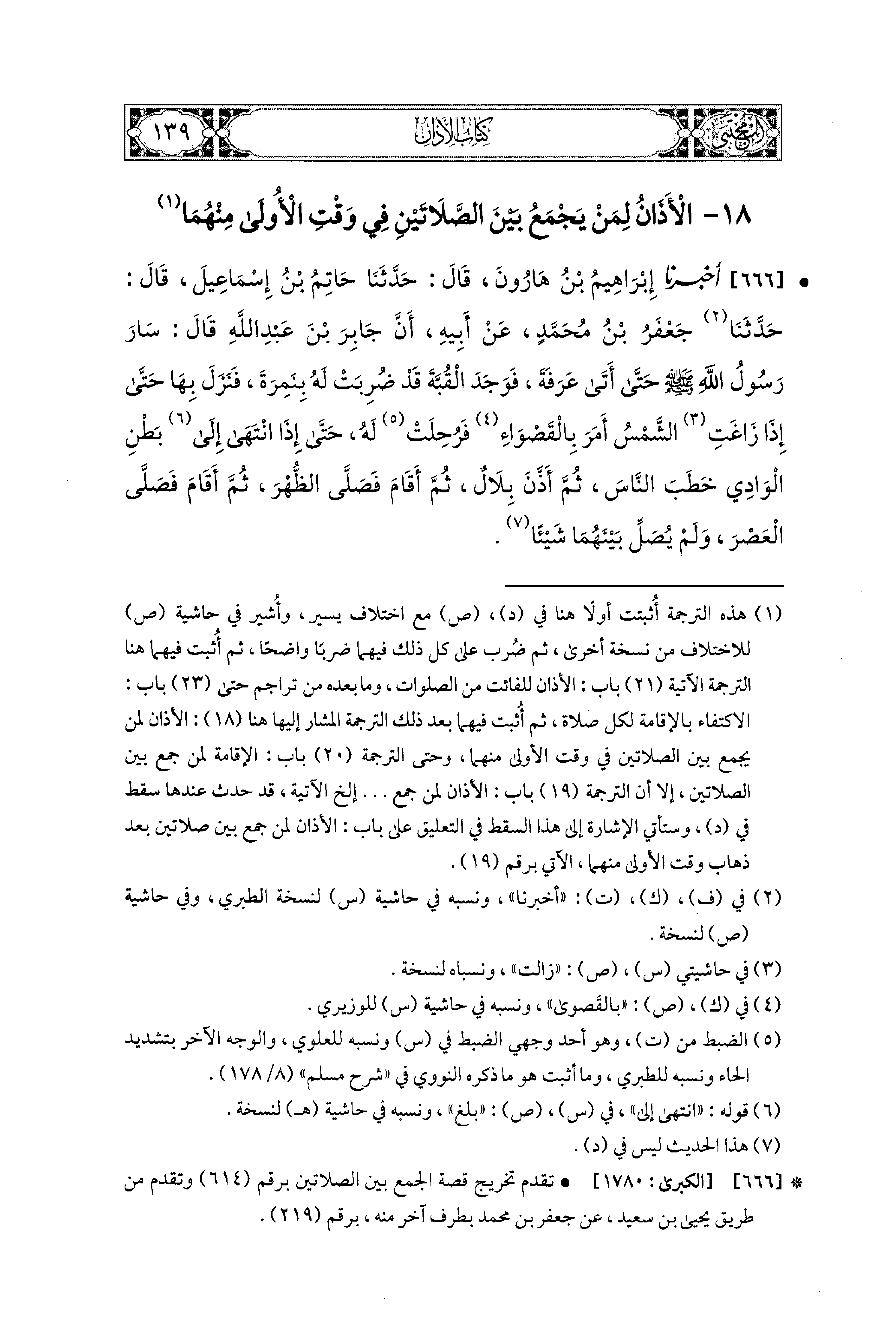 666- أَخبَرنا إِبراهِيمُ بنُ هَارُونَ، قال: حَدثنا حَاتِمُ بنُ إِسماعِيلَ، قَالَ: حَدثنا جَعْفَرُ بنُ مُحَمدٍ، عَن أَبيهِ، أَنَّ جَابِرَ بْنَ عَبدِ اللهِ قَالَ: سَارَ رَسُولُ اللهِ صَلى الله عَليه وسَلم حَتَّى أَتَى عَرَفَةَ، فَوَجَدَ القُبَّةَ قَدْ ضُرِبَتْ لَهُ بِنَمِرَةَ، فَنَزَلَ بِهَا حَتَّى إِذَا زَاغَتِ الشَّمْسُ أَمَرَ بِالقَصْوَاءِ فَرُحِّلَتْ لَهُ، حَتَّى إِذَا انْتَهَى إِلَى بَطْنِ الوَادِي خَطَبَ النَّاسَ، ثُمَّ أَذَّنَ بِلاَلٌ، ثُمَّ أَقَامَ فَصَلَّى الظُّهْرَ، ثُمَّ أَقَامَ فَصَلَّى العَصْرَ وَلَمْ يُصَلِّ بَيْنَهُمَا شَيْئًا.
