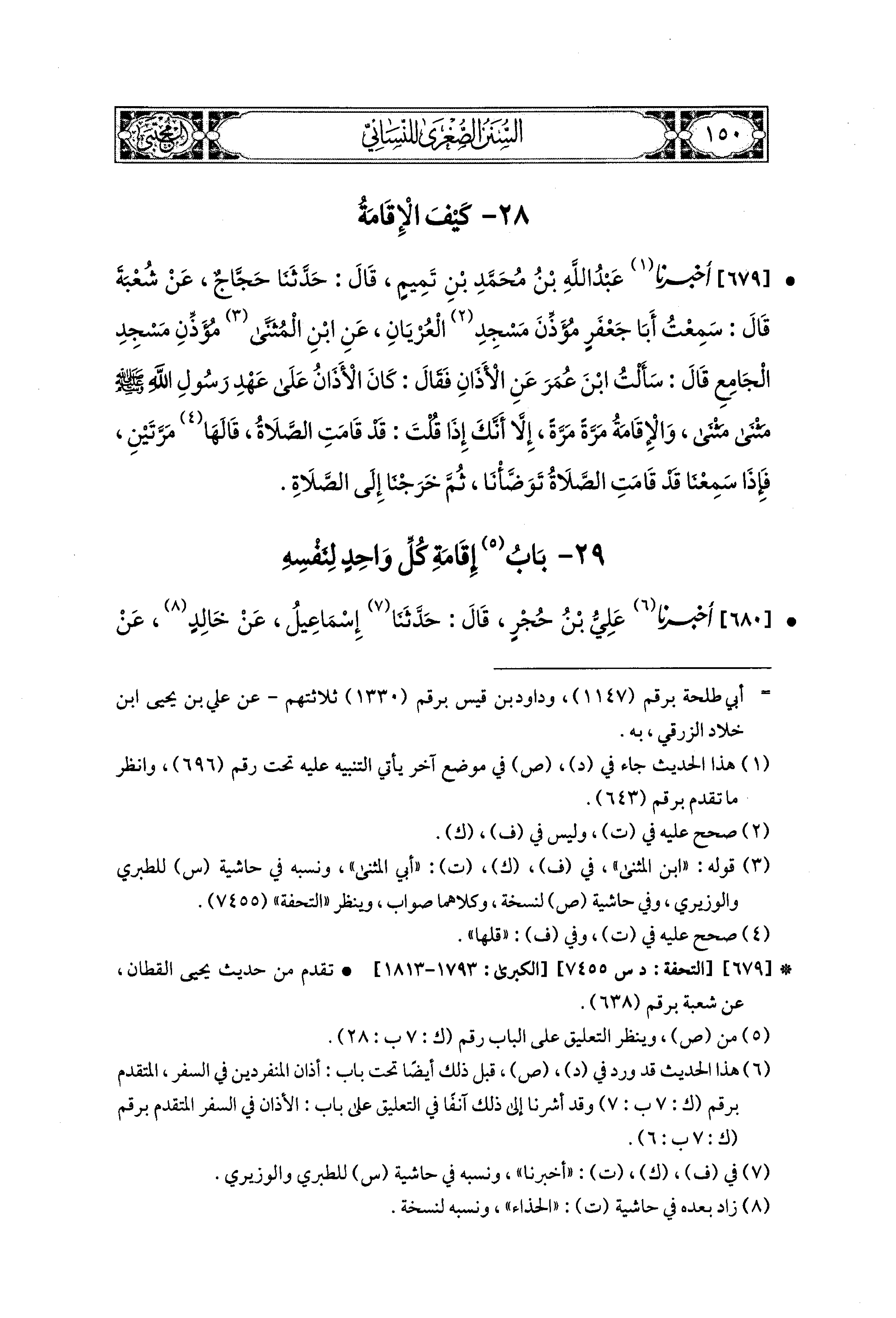 679- أَخبَرنا عَبدُ اللهِ بنُ مُحَمدِ بْنِ تَمِيمٍ، قال: حَدثنا حَجَّاجٌ، عَن شُعبَةَ، قَالَ: سَمِعْتُ أَبَا جَعْفَرٍ مُؤَذِّنَ مَسْجِدِ العُرْيَانِ، عَن أَبي المُثَنَّى (1)، مُؤَذِّنِ مَسْجِدِ الجَامِعِ، قَالَ: سَأَلْتُ ابنَ عُمَرَ، عَنِ الأَذَانِ، فَقَالَ: كَانَ الأَذَانُ عَلَى عَهْدِ رَسُولِ اللهِ صَلى الله عَليه وسَلم مَثْنَى مَثْنَى، وَالإِقَامَةُ مَرَّةً مَرَّةً، إِلاَّ أَنَّكَ إِذَا قُلْتَ: قَدْ قَامَتِ الصَّلاَةُ، قَالَهَا مَرَّتَيْنِ، فَإِذَا سَمِعْنَا قَدْ قَامَتِ الصَّلاَةُ تَوَضَّأْنَا، ثُمَّ خَرَجْنَا إِلَى الصَّلاَةِ.