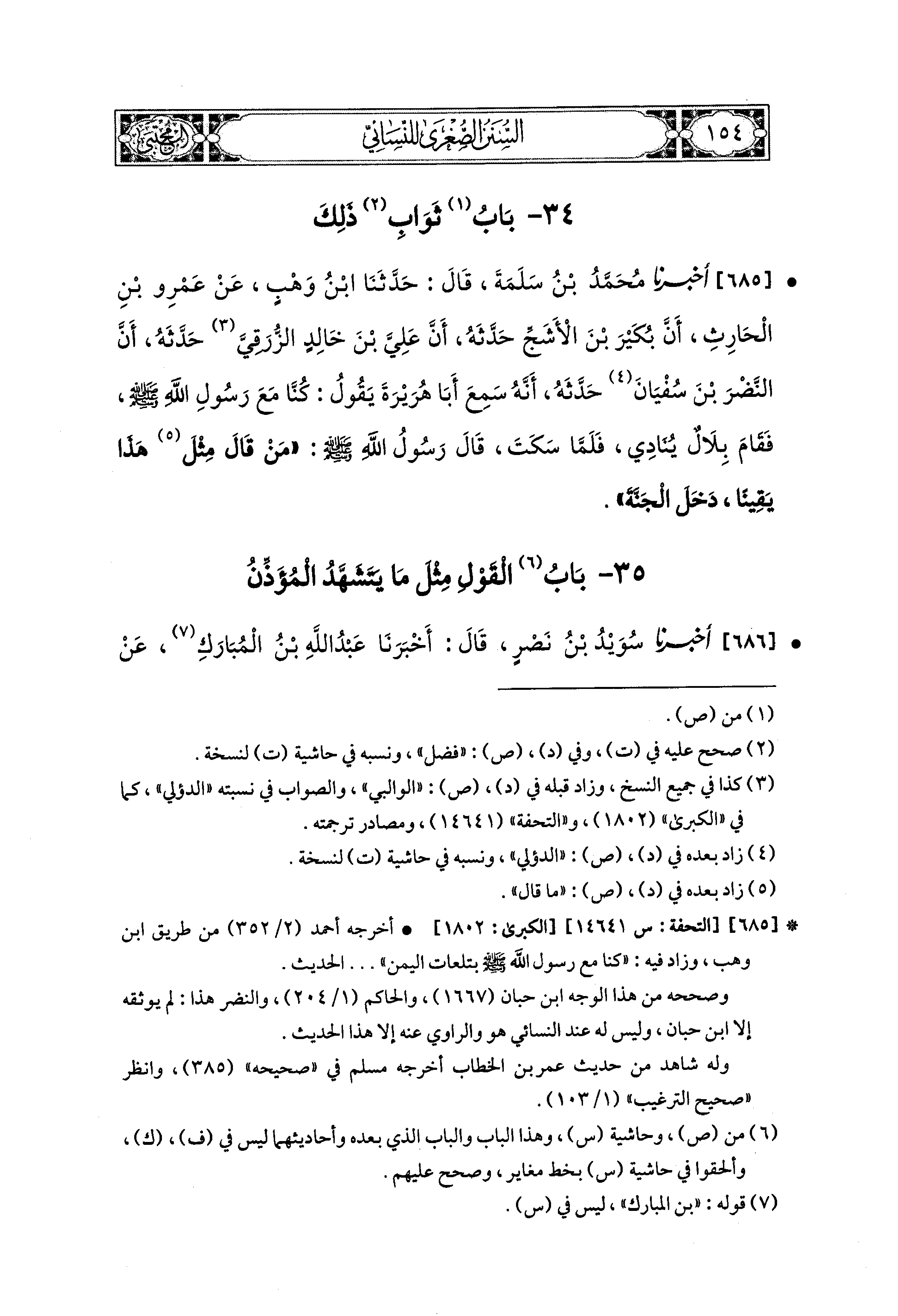 686- أَخبَرنا سُوَيْدُ بنُ نَصْرٍ، قال: أَخبَرنا عَبدُ اللهِ بنُ المُبَارَكِ، عَن مُجَمِّعِ بْنِ يَحيَى الأَنصَارِيِّ قَالَ: كُنْتُ جَالِسًا عِنْدَ أَبي أُمَامَةَ بْنِ سَهْلِ بْنِ حُنَيْفٍ، فَأَذَّنَ المُؤَذِّنُ فَقَالَ: اللهُ أَكْبَرُ اللهُ أَكْبَرُ، فَكَبَّرَ اثْنَتَيْنِ، فَقَالَ: أَشْهَدُ أَنْ لاَ إِلَهَ إِلاَّ اللهُ، فَتَشَهَّدَ اثْنَتَيْنِ، فَقَالَ: أَشْهَدُ أَنَّ مُحَمدًا رَسُولُ اللهِ، فَتَشَهَّدَ اثْنَتَيْنِ، ثُمَّ، قَالَ: حَدَّثَني هَكَذَا مُعَاوِيَةُ بنُ أَبي سُفيَانَ، عَن قَوْلِ رَسُولِ اللهِ صَلى الله عَليه وسَلم.