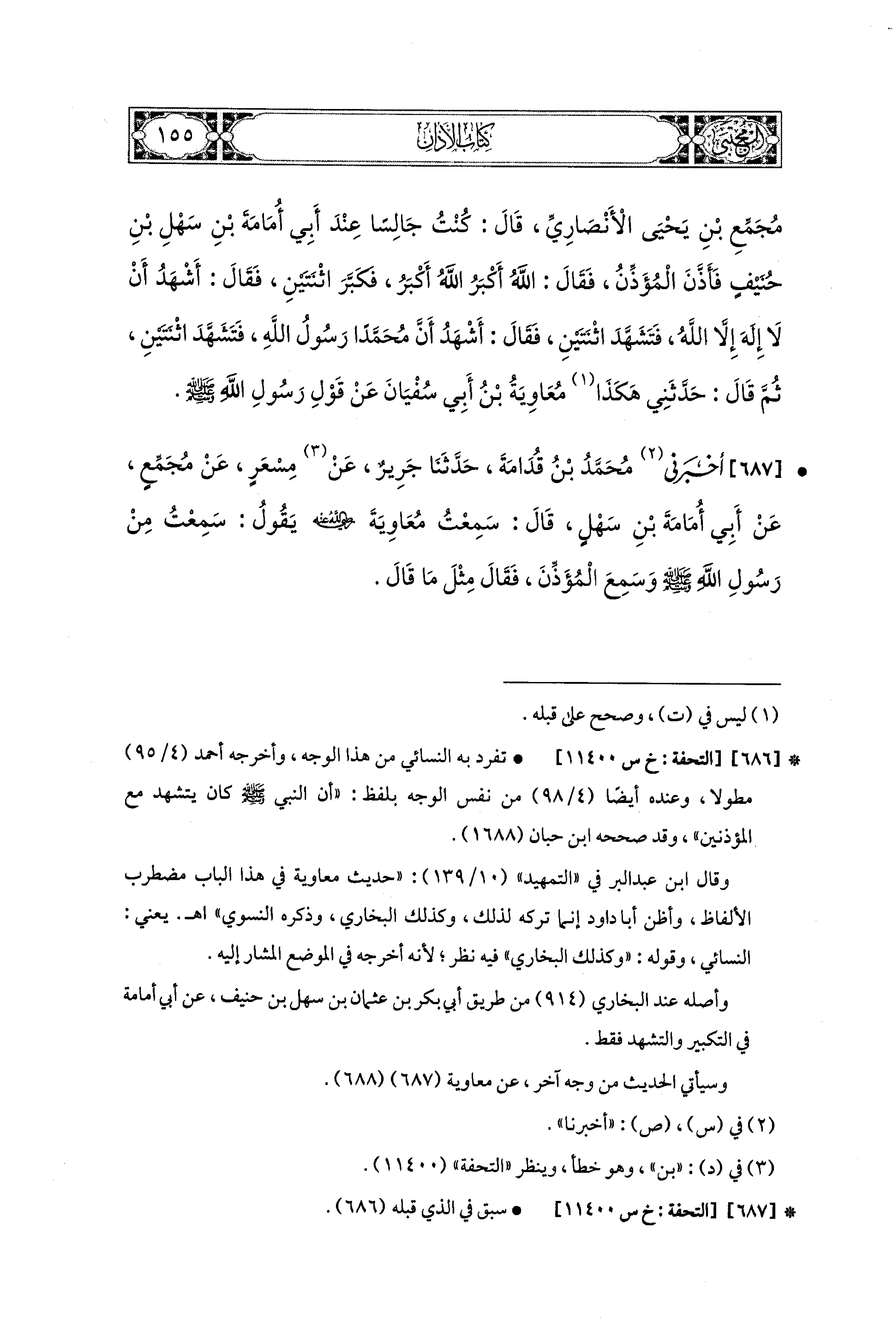 687- أَخْبَرَنِي مُحَمد بنُ قُدَامَةَ، حَدَّثَنَا جَرِيرٌ، عَن مِسْعَرٍ، عَن مُجَمِّعٍ، عَن أَبي أُمَامَةَ بْنِ سَهْلٍ، قَالَ: سَمِعْتُ مُعَاوِيَةَ رَضِيَ اللهُ عَنهُ يَقُولُ: سَمِعْتُ مِنْ رَسُولِ اللهِ صَلى الله عَليه وسَلم وَسَمِعَ المُؤَذِّنَ فَقَالَ مِثْلَ مَا قَالَ.