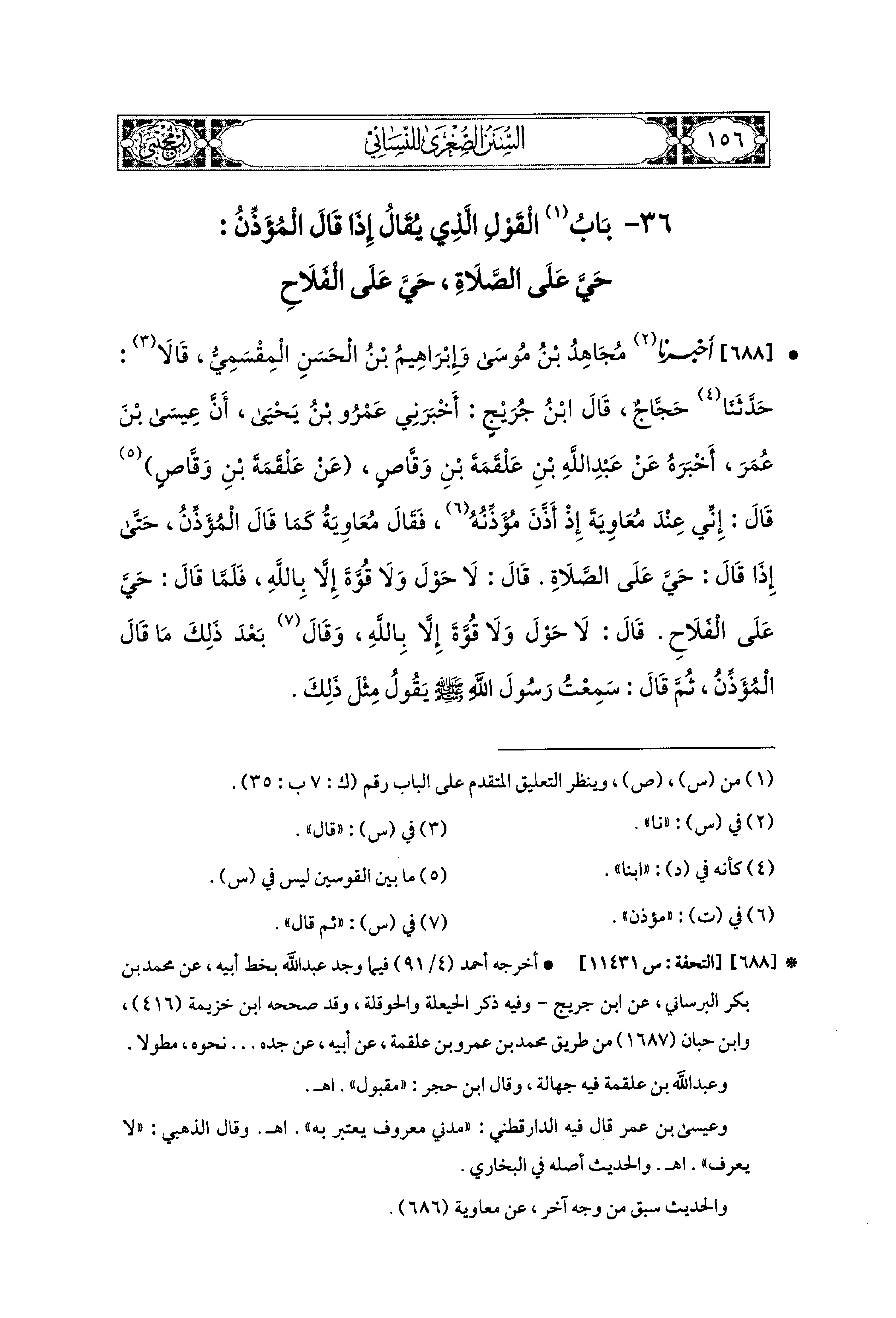 688- أَخبَرنا مُجَاهِدُ بنُ مُوسَى، وَإِبراهِيمُ بنُ الحَسَنِ المِقْسَمِيُّ قَالاَ: حَدَّثَنَا حَجَّاجٌ قَالَ ابنُ جُرَيْجٍ: أَخبَرني عَمْرُو بنُ يَحيَى، أَنَّ عِيسَى بْنَ عُمَرَ أَخْبَرَهُ، عَن عَبد اللهِ بن عَلْقَمَةَ بْنِ وَقَّاصٍ، عَن عَلْقَمَةَ بْنِ وَقَّاصٍ قَالَ: إِنِّي عِنْدَ مُعَاوِيَةَ إِذْ أَذَّنَ مُؤَذِّنُهُ، فَقَالَ مُعَاوِيَةُ كَمَا قَالَ المُؤَذِّنُ، حَتَّى إِذَا قَالَ: حَيَّ عَلَى الصَّلاَةِ، قَالَ: لاَ حَوْلَ وَلاَ قُوَّةَ إِلاَّ بِالله، فَلَمَّا قَالَ: حَيَّ عَلَى الفَلاَحِ، قَالَ: لاَ حَوْلَ وَلاَ قُوَّةَ إِلاَّ بِالله، وَقَالَ بَعْدَ ذَلِكَ مَا قَالَ المُؤَذِّنُ، ثُمَّ، قَالَ: سَمِعْتُ رَسُولَ اللهِ صَلى الله عَليه وسَلم يَقُولُ مِثْلَ ذَلِكَ.
