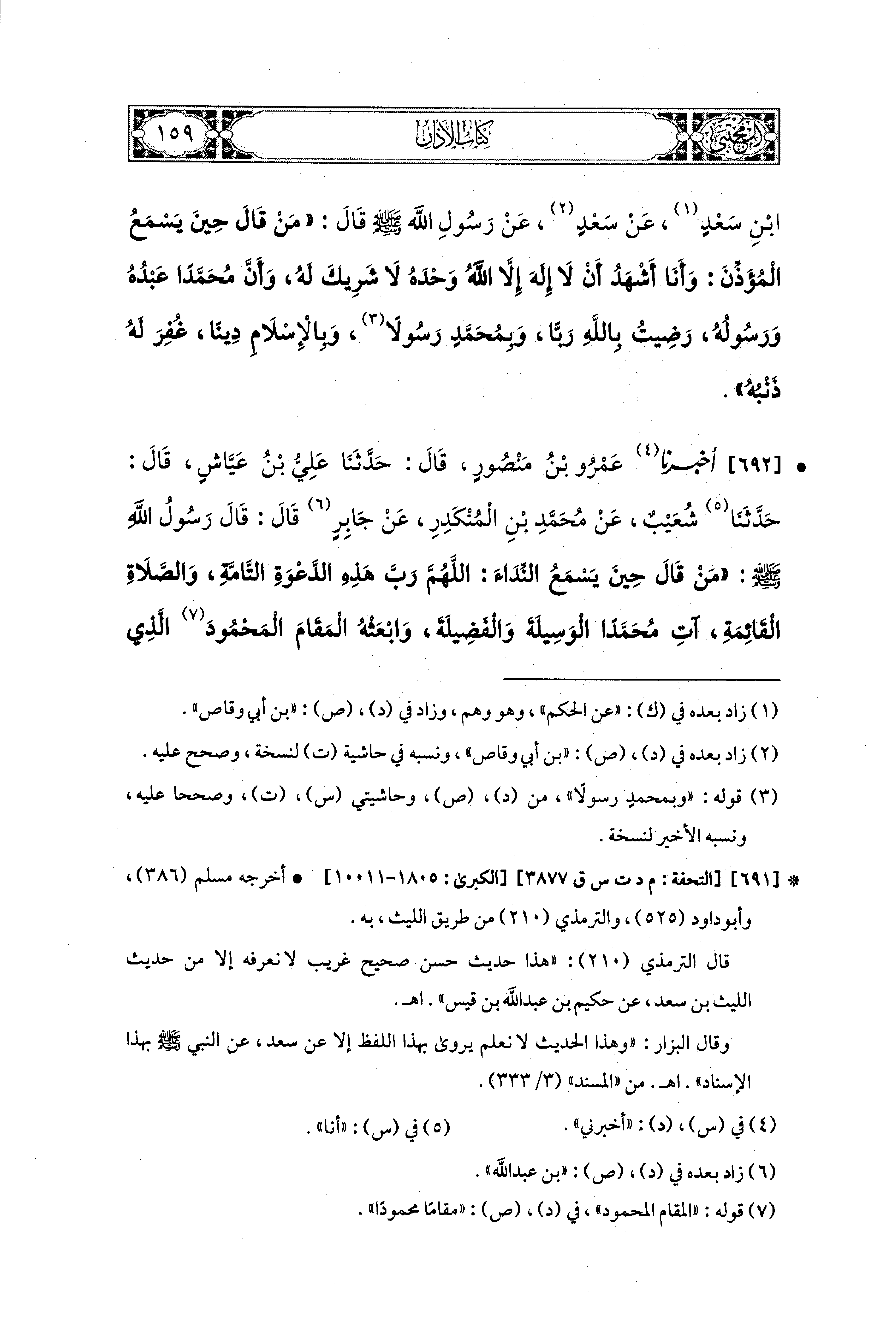 692- أَخبَرنا عَمْرُو بنُ مَنْصُورٍ، قال: حَدثنا عَلِيُّ بنُ عَيَّاشٍ، قال: حَدثنا شُعَيبٌ، عَن مُحَمدِ بْنِ المُنْكَدِرِ، عَن جَابِرٍ قَالَ: قَالَ رَسُولُ اللهِ صَلى الله عَليه وسَلم: مَنْ قَالَ حِينَ يَسْمَعُ النِّدَاءَ: اللهُمَّ رَبَّ هَذِهِ الدَّعْوَةِ التَّامَّةِ وَالصَّلاَةِ القَائِمَةِ، آتِ مُحَمدًا الوَسِيلَةَ وَالفَضِيلَةَ، وَابْعَثْهُ المَقَامَ المَحْمُودَ الَّذِي وَعَدْتَهُ، إِلاَّ حَلَّتْ لَهُ شَفَاعَتِي يَوْمَ القِيَامَةِ.