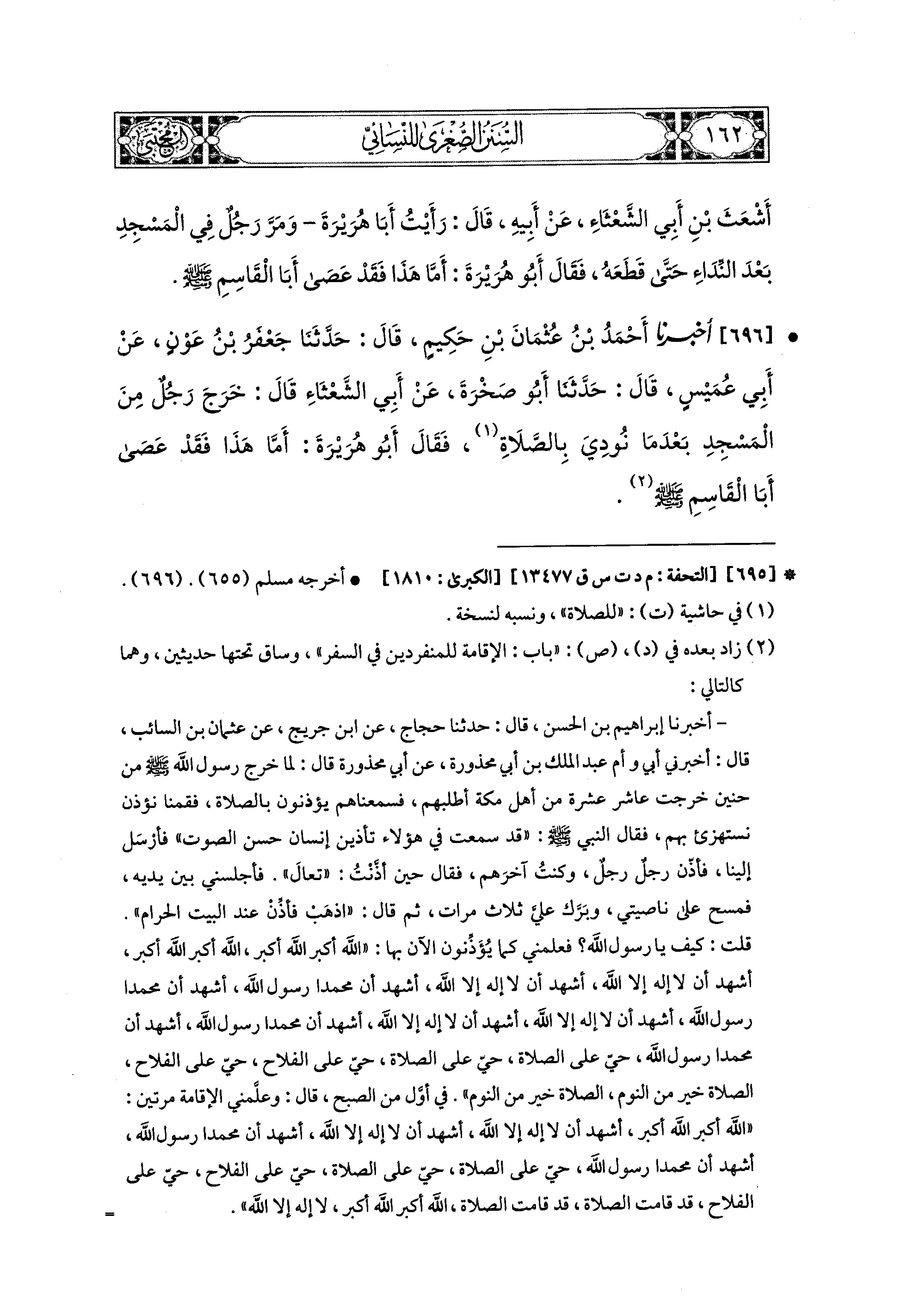 696- أَخبَرنا أَحْمَدُ بنُ عُثمَانَ بْنِ حَكِيمٍ، قال: حَدثنا جَعْفَرُ بنُ عَوْنٍ، عَن أَبي عُمَيْسٍ قَالَ: حَدثنا أَبو صَخْرَةَ، عَن أَبي الشَّعْثَاءِ قَالَ: خَرَجَ رَجُلٌ مِنَ المَسْجِدِ بَعْدَ مَا نُودِيَ بِالصَّلاَةِ، فَقَالَ أَبو هُرَيْرَةَ: أَمَّا هَذَا فَقَدْ عَصَى أَبَا القَاسِمِ صَلى الله عَليه وسَلم.