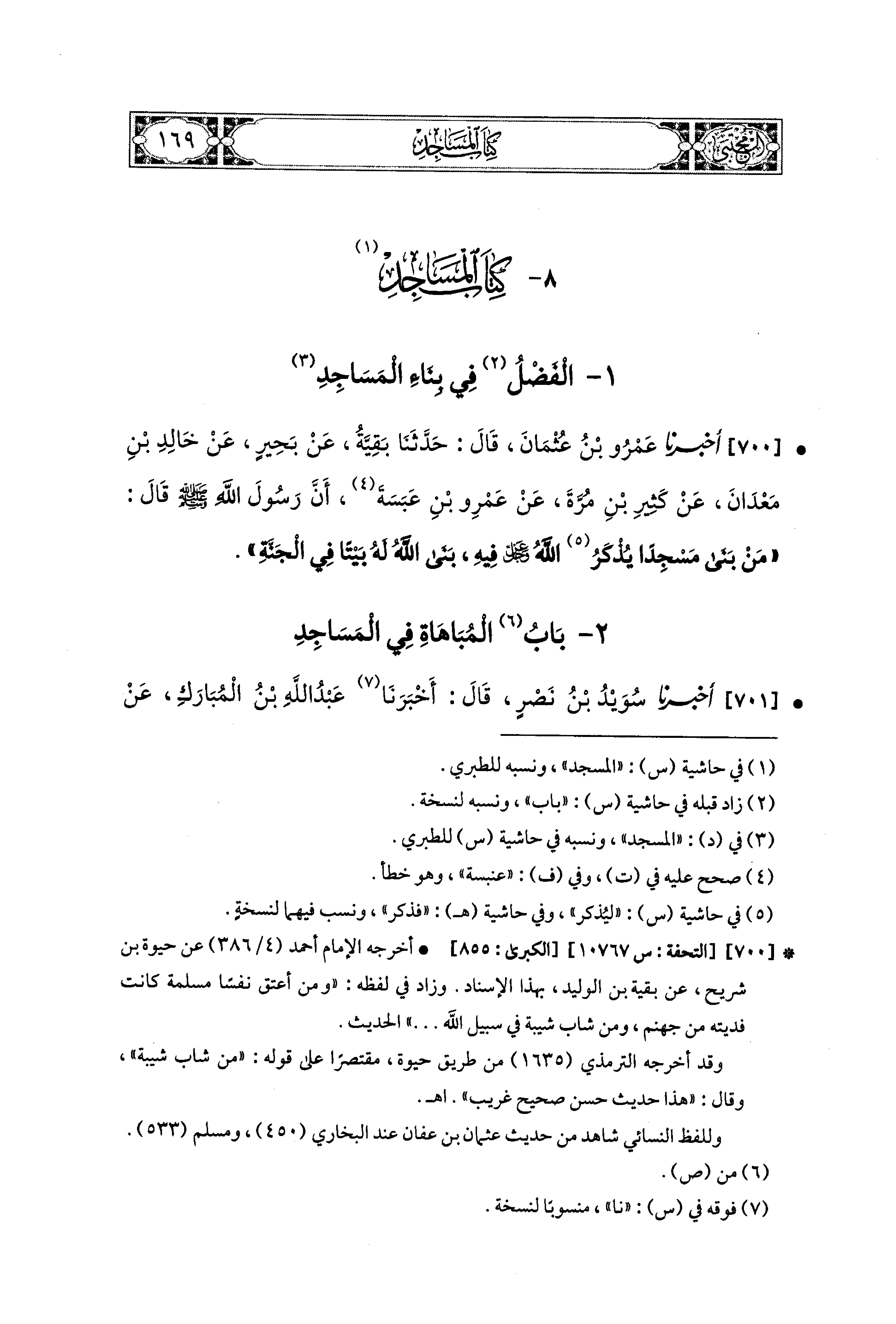 700 - أَخبَرنا عَمْرُو بنُ عُثمَانَ، قال: حَدثنا بَقِيَّةُ، عَن بَحِيرٍ، عَن خَالِدِ بْنِ مَعْدَانَ، عَن كَثِيرِ بْنِ مُرَّةَ، عَن عَمْرِو بْنِ عَبَسَةَ، أَنَّ رَسُولَ اللهِ صَلى الله عَليه وسَلم قَالَ: مَنْ بَنَى مَسْجِدًا يُذْكَرُ اللهُ عَزَّ وَجَلَّ فِيهِ، بَنَى اللهُ لَهُ بَيْتًا فِي الجَنَّةِ.