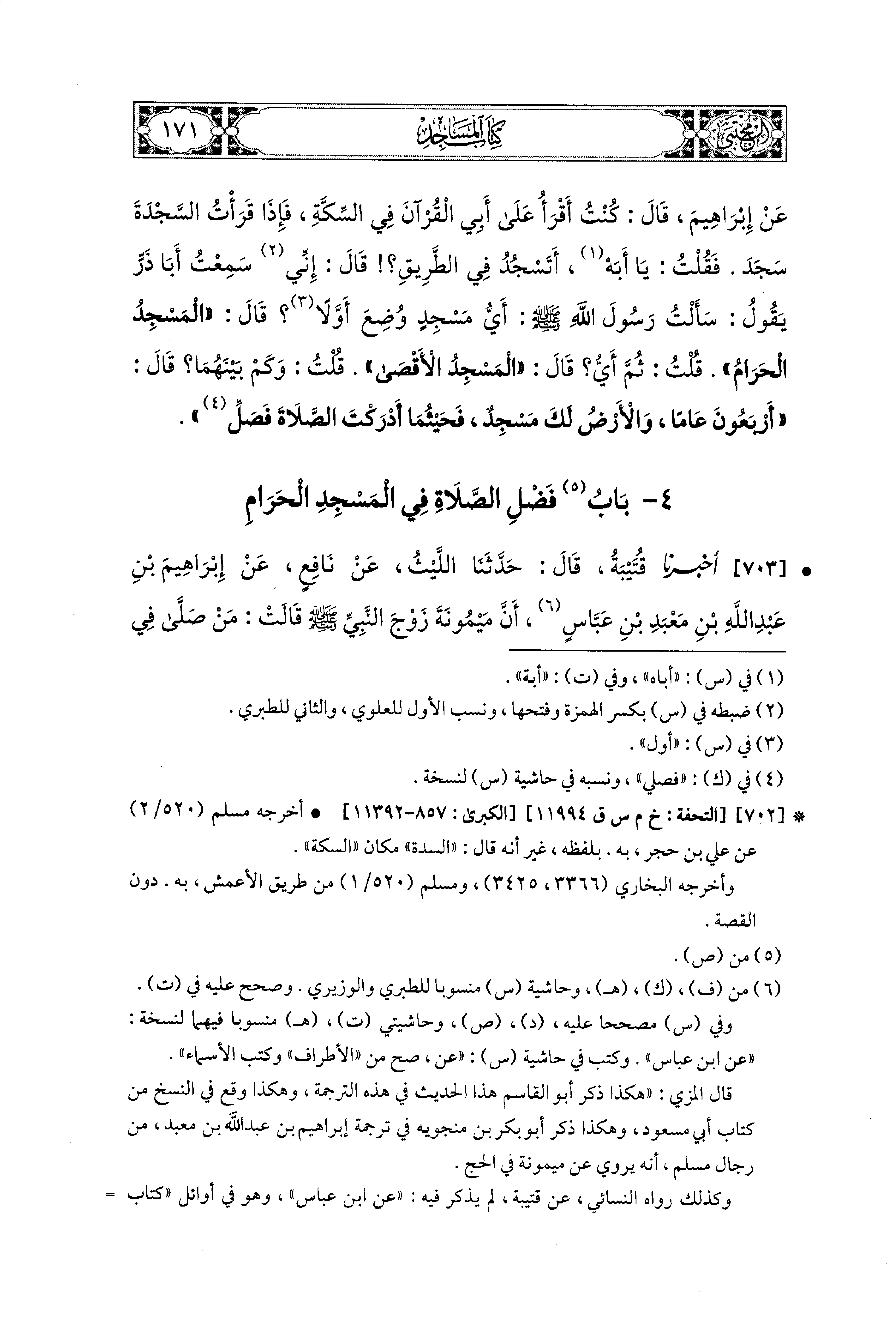 703- أَخبَرنا قُتَيبَةُ، قال: حَدثنا اللَّيْثُ، عَن نَافِعٍ، عَن إِبراهِيمَ بْنِ عَبدِ اللهِ بْنِ مَعْبَدِ بْنِ عَبَّاسٍ، أَنَّ مَيْمُونَةَ زَوْجَ النَّبيِّ صَلى الله عَليه وسَلم قَالَتْ: مَنْ صَلَّى فِي مَسْجِدِ الرَسُول صَلى الله عَليه وسَلم؛ فَإِنِّي سَمِعْتُ رَسُولَ اللهِ صَلى الله عَليه وسَلم يَقُولُ: الصَّلاَةُ فِيهِ أَفْضَلُ مِنَ ألْفِ صَلاَةٍ فِيمَا سِوَاهُ إِلاَّ مَسْجِدَ الكَعْبَةِ.