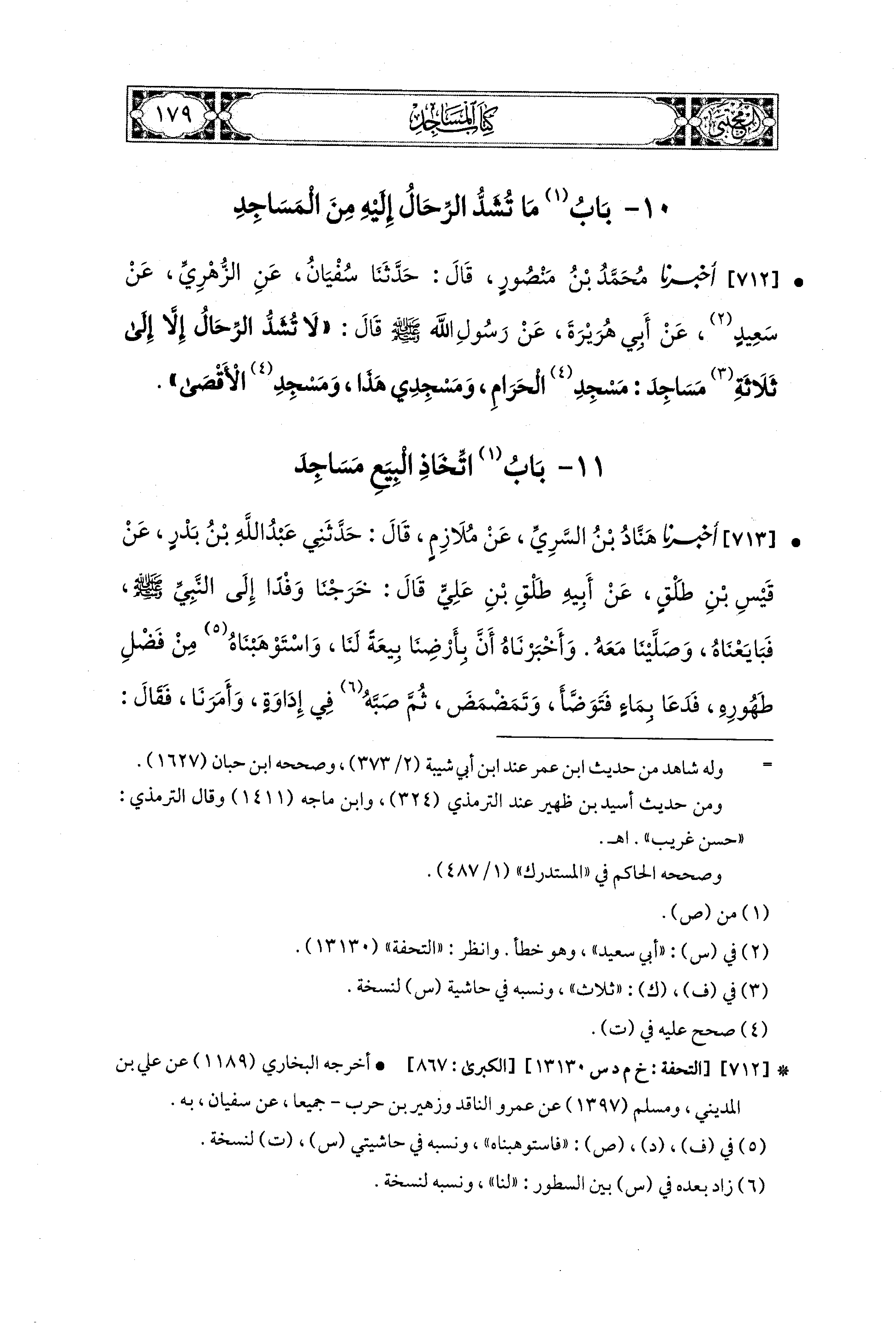 712- أَخبَرنا مُحَمد بنُ مَنْصُورٍ، قال: حَدثنا سُفيَانُ، عَنِ الزُّهْرِيِّ، عَن سَعيدٍ، عَن أَبي هُرَيْرَةَ، عَن رَسُولِ اللهِ صَلى الله عَليه وسَلم قَالَ: لاَ تُشَدُّ الرِّحَالُ إِلاَّ إِلَى ثَلاَثَةِ مَسَاجِدَ: مَسْجِدِ الحَرَامِ، وَمَسْجِدِي هَذَا، وَمَسْجِدِ الأَقْصَى.