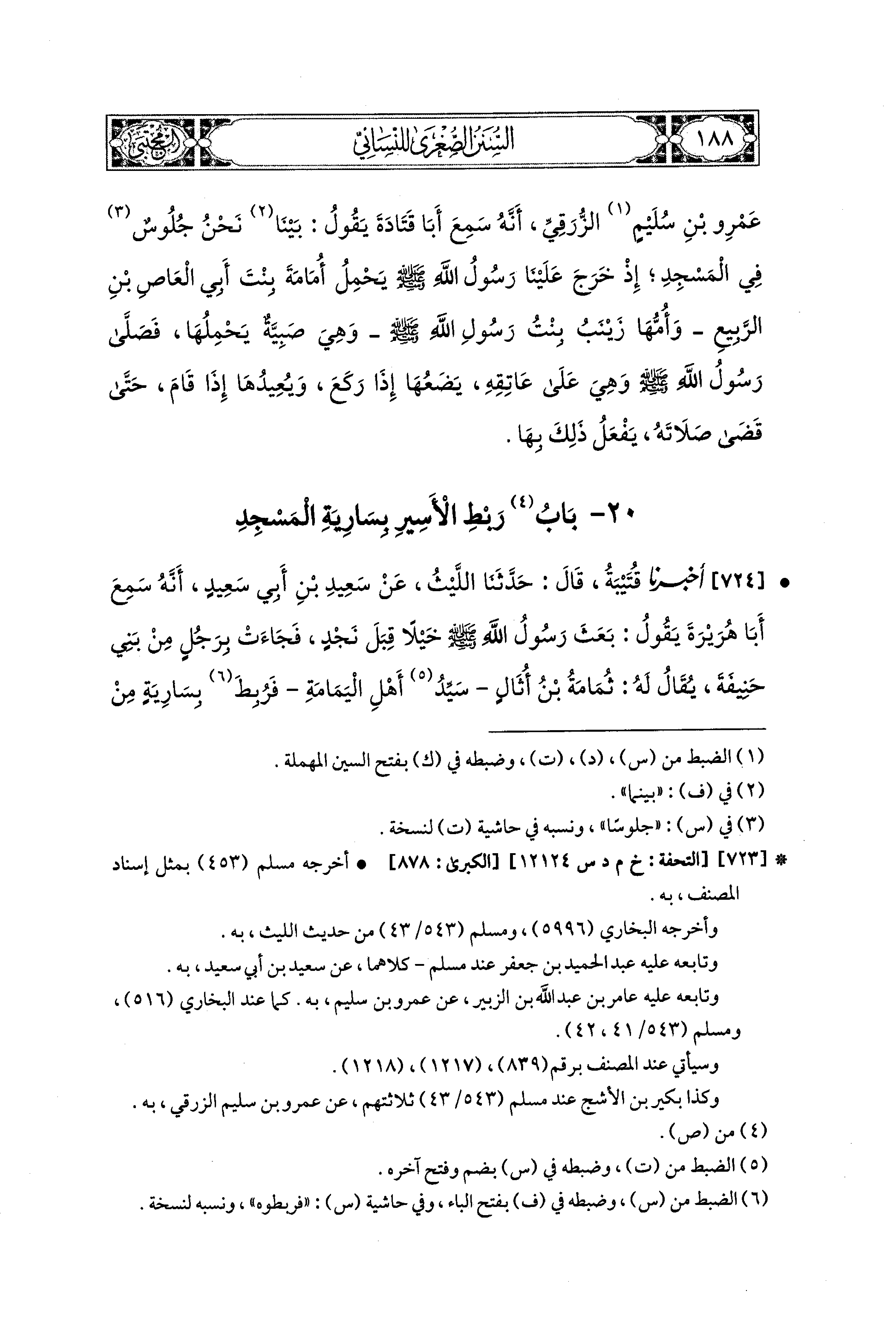 724- أَخبَرنا قُتَيبَةُ، قَاَل: حَدَّثَنَا اللَّيْثُ، عَن سَعيدِ بْنِ أَبي سَعيدٍ، أَنَّهُ سَمِعَ أَبَا هُرَيْرَةَ يَقُولُ: بَعَثَ رَسُولُ اللهِ صَلى الله عَليه وسَلم خَيْلاً قِبَلَ نَجْدٍ، فَجَاءَتْ بِرَجُلٍ مِنْ بَني حَنيفَةَ، يُقَالُ لَهُ: ثُمَامَةُ بنُ أُثَالٍ، سَيِّدُ أَهْلِ اليَمَامَةِ، فَرُبِطَ بِسَارِيَةٍ مِنْ سَوَارِي المَسْجِدِ، مُخْتَصَرٌ.