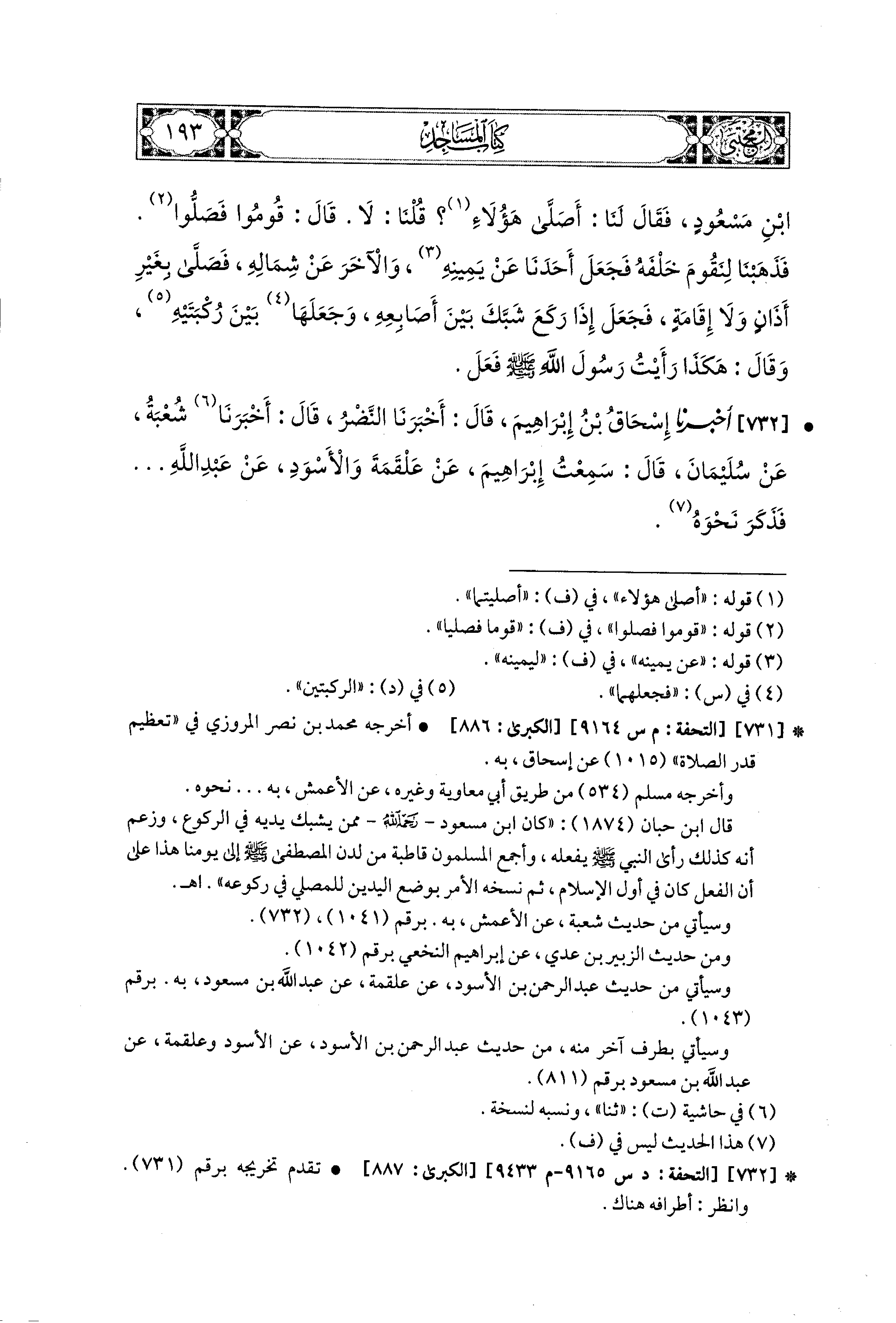 732- أَخبَرنا إِسحَاقُ بنُ إِبراهِيمَ، قَالَ: أَخبَرنا النَّضْرُ، قَالَ: أَخبَرنا شُعبَةُ، عَن سُلَيمَانَ، قَالَ: سَمِعْتُ إِبراهِيمَ، عَن عَلْقَمَةَ، وَالأَسْوَدِ، عَن عَبدِ اللهِ ... فَذَكَرَ نَحْوَهُ.