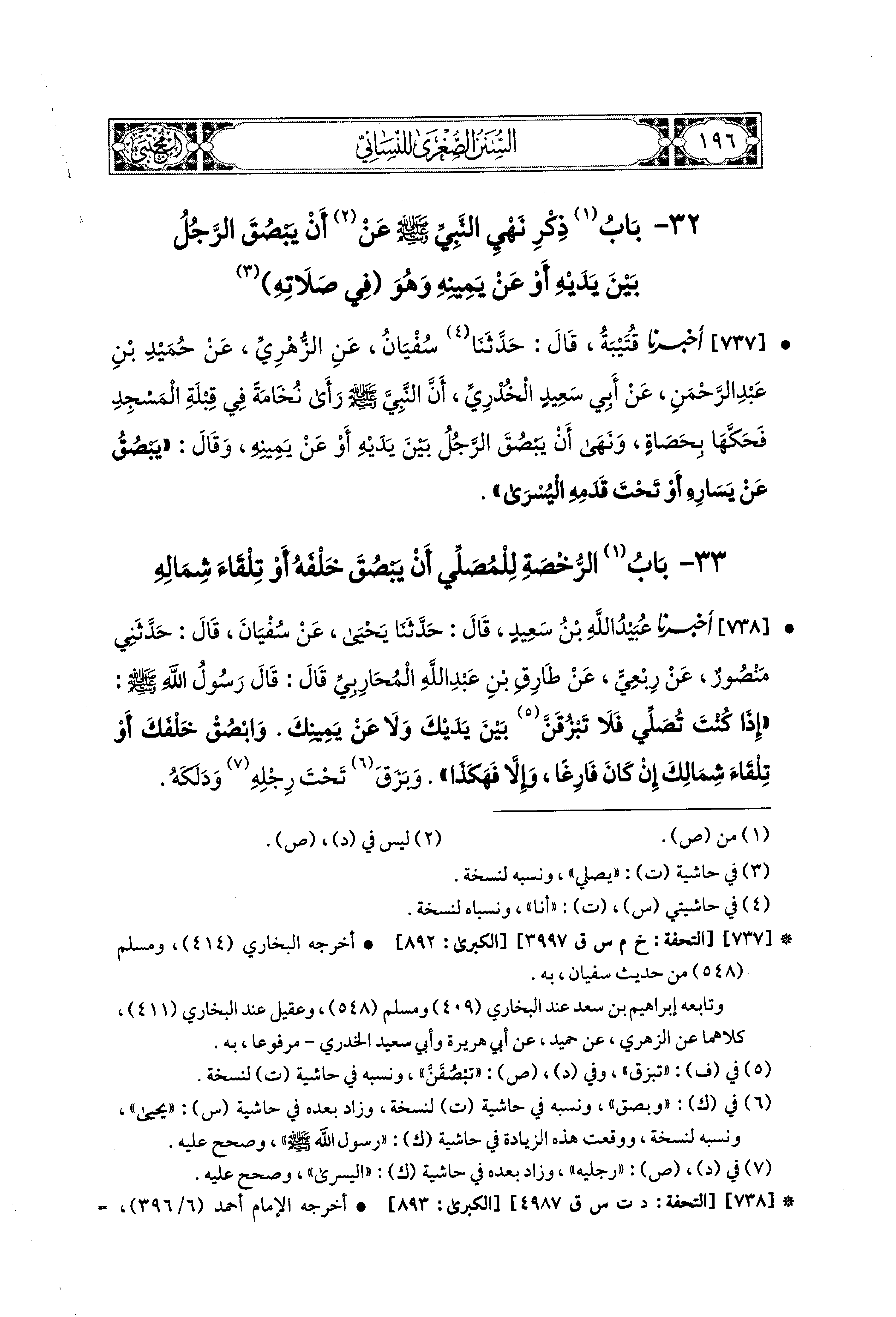 737- أَخبَرنا قُتَيبَةُ، قال: حَدثنا سُفيَانُ، عَنِ الزُّهْرِيِّ، عَن حُمَيدِ بْنِ عَبدِ الرَّحْمَنِ، عَن أَبي سَعيدٍ الخُدْرِيِّ، أَنَّ النَّبيَّ صَلى الله عَليه وسَلم رَأَى نُخَامَةً فِي قِبْلَةِ المَسْجِدِ فَحَكَّهَا بِحَصَاةٍ، وَنَهَى أَنْ يَبْصُقَ الرَّجُلُ بَيْنَ يَدَيْهِ، أَوْ عَن يَمِينِهِ، وَقَالَ: يَبْصُقُ عَن يَسَارِهِ، أَوْ تَحْتَ قَدَمِهِ اليُسْرَى.
