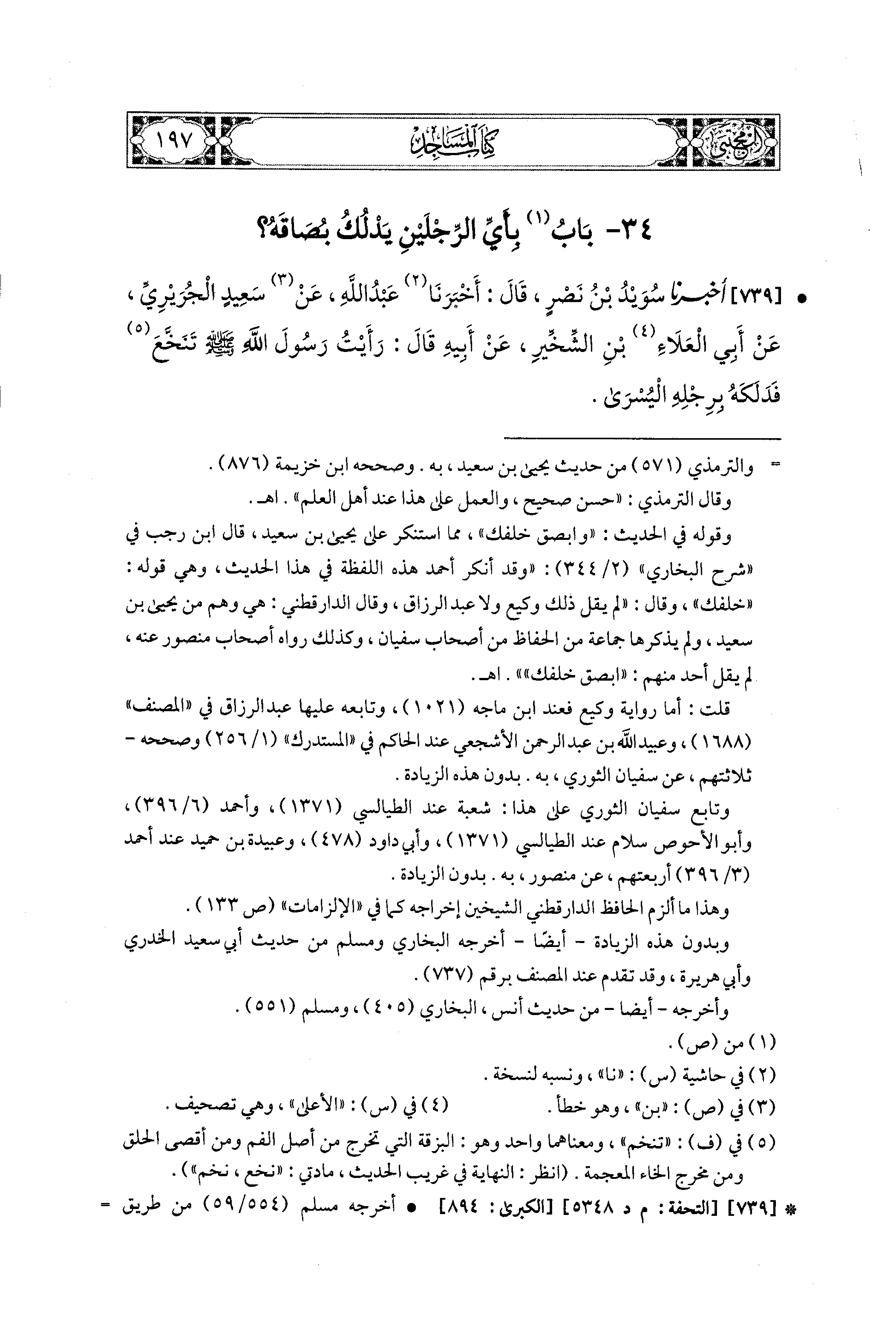 739- أَخبَرنا سُوَيْدُ بنُ نَصْرٍ، قَالَ: أَخبَرنا عَبدُ اللهِ، عَن سَعيدٍ الجُرَيْرِيِّ، عَن أَبي العَلاَءِ بْنِ الشِّخِّيرِ، عَن أَبيهِ، قَالَ: رَأَيْتُ رَسُولَ اللهِ صَلى الله عَليه وسَلم تَنَخَّعَ فَدَلَكَهُ بِرِجْلِهِ اليُسْرَى.