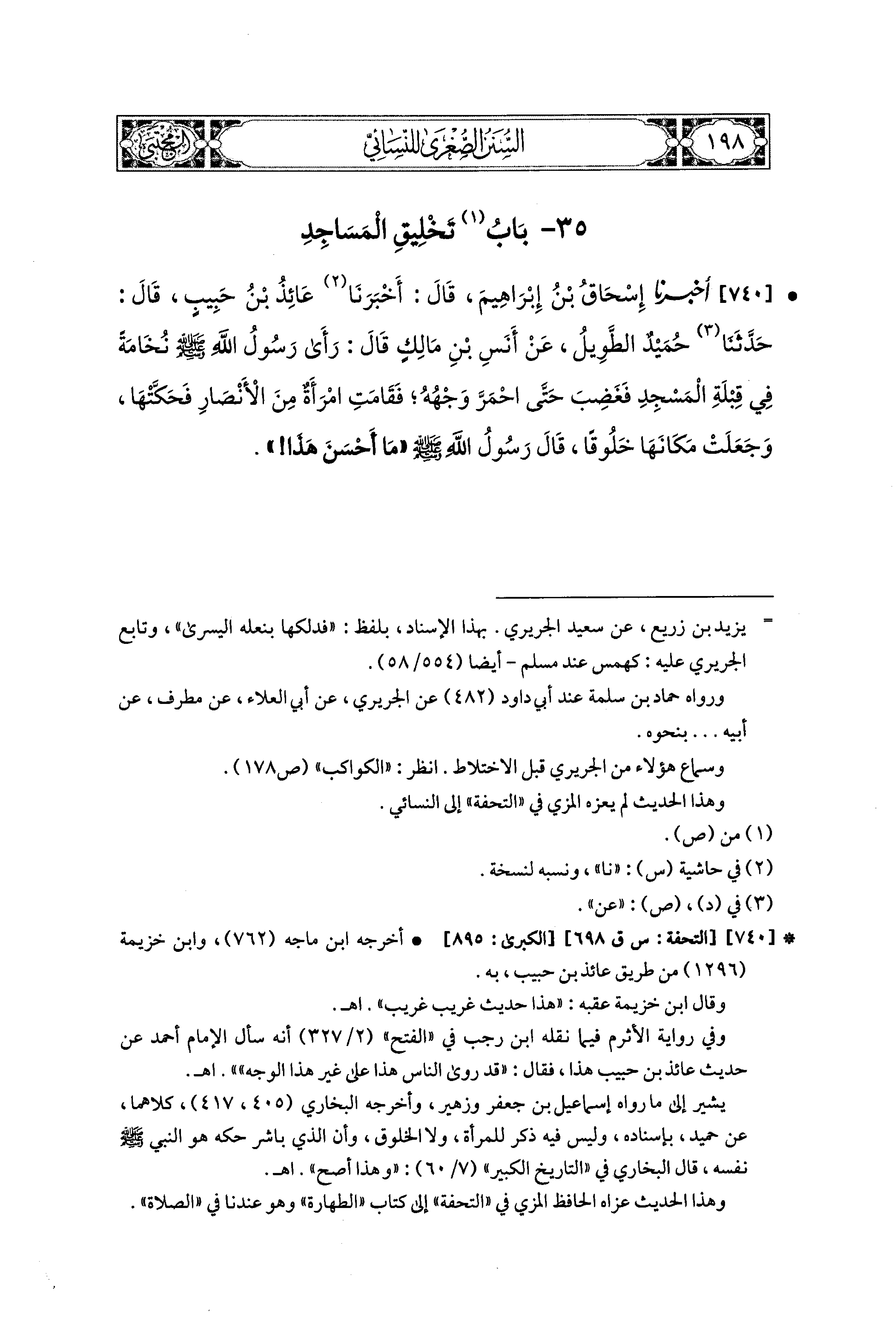 740- أَخبَرنا إِسحَاقُ بنُ إِبراهِيمَ، قال: أَخبَرَنا عَائِذُ بنُ حَبِيبٍ، قال: حَدثنا حُمَيدٌ الطَّوِيلُ، عَن أَنَسِ بْنِ مَالِكٍ قَالَ: رَأَى رَسُولُ اللهِ صَلى الله عَليه وسَلم نُخَامَةً فِي قِبْلَةِ المَسْجِدِ، فَغَضِبَ حَتَّى احْمَرَّ وَجْهُهُ، فَقَامَتِ امْرَأَةٌ مِنَ الأَنصَارِ فَحَكَّتْهَا وَجَعَلَتْ مَكَانَهَا خَلُوقًا، فَقَالَ رَسُولُ اللهِ صَلى الله عَليه وسَلم: مَا أَحْسَنَ هَذَا.