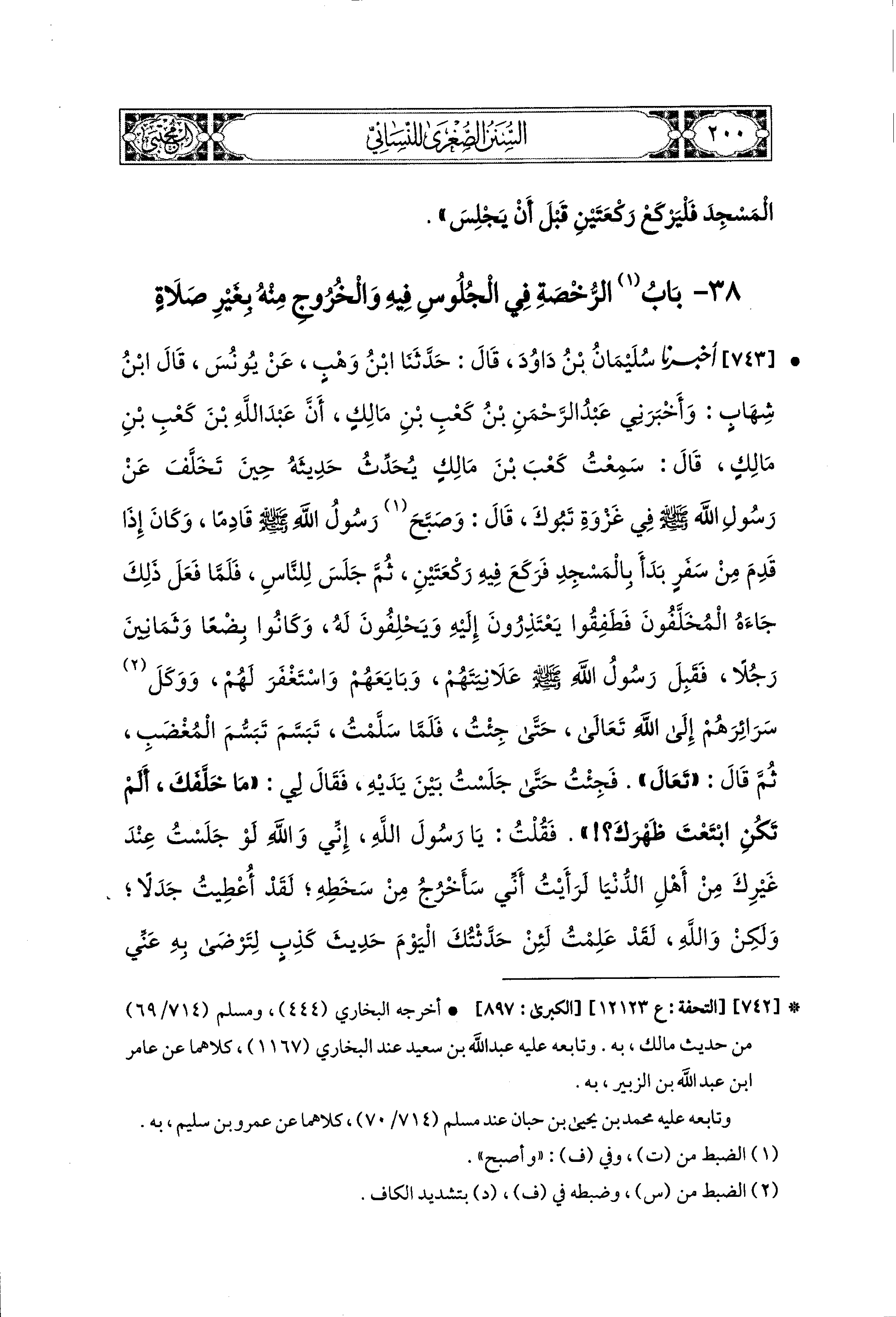 743- أَخبَرنا سُلَيمَانُ بنُ دَاوُدَ، قال: حَدثنا ابنُ وَهْبٍ، عَن يُونُسَ قَالَ ابنُ شِهَابٍ: وَأَخبَرني عَبدُ الرَّحْمَنِ بنُ كَعْبِ بْنِ مَالِكٍ، أَنَّ عَبدَ اللهِ بْنَ كَعْبٍ بْنِ مَالِكٍ، قَالَ: سَمِعْتُ كَعْبَ بْنَ مَالِكٍ يُحَدِّثُ حَدِيثَهُ حِينَ تَخَلَّفَ عَن رَسُولِ اللهِ صَلى الله عَليه وسَلم فِي غَزْوَةِ تَبُوكَ، قَالَ: وَصَبَّحَ رَسُولُ اللهِ صَلى الله عَليه وسَلم قَادِمًا، وَكَانَ إِذَا قَدِمَ مِنْ سَفَرٍ بَدَأَ بِالمَسْجِدِ فَرَكَعَ فِيهِ رَكْعَتَيْنِ، ثُمَّ جَلَسَ لِلنَّاسِ، فَلَمَّا فَعَلَ ذَلِكَ جَاءَهُ المُخَلَّفُونَ، فَطَفِقُوا يَعْتَذِرُونَ إِلَيْهِ وَيَحْلِفُونَ لَهُ، وَكَانُوا بِضْعًا وَثَمَانينَ رَجُلاً، فَقَبِلَ رَسُولُ اللهِ صَلى الله عَليه وسَلم عَلاَنيَتَهُمْ وَبَايَعَهُمْ وَاسْتَغْفَرَ لَهُمْ وَوَكَلَ سَرَائِرَهُمْ إِلَى اللهِ عَزَّ وَجَلَّ حَتَّى جِئْتُ، فَلَمَّا سَلَّمْتُ تَبَسَّمَ تَبَسُّمَ المُغْضَبِ، ثُمَّ قَالَ: تَعَالَ، فَجِئْتُ حَتَّى جَلَسْتُ بَيْنَ يَدَيْهِ، فَقَالَ لِي: مَا خَلَّفَكَ؟ أَلَمْ تَكُنِ ابْتَعْتَ ظَهْرَكَ؟ فَقُلْتُ: يَا رَسُولَ اللهِ، إِنِّي وَالله لَوْ جَلَسْتُ عِنْدَ غَيْرِكَ مِنْ أَهْلِ الدُّنْيَا لَرَأَيْتُ أَنِّي سَأَخْرُجُ مِنْ سَخَطِهِ، لَقَدْ أُعْطِيتُ جَدَلاً، وَلَكِنْ وَالله لَقَدْ عَلِمْتُ لَئِنْ حَدَّثْتُكَ اليَوْمَ حَدِيثَ كَذِبٍ لِتَرْضَى بِهِ عَنِّي لَيُوشَكُ أَنَّ اللهَ عَزَّ وَجَلَّ يُسْخِطُكَ عَلَيَّ، وَلَئِنْ حَدَّثْتُكَ حَدِيثَ صِدْقٍ تَجِدُ عَلَيَّ فِيهِ، إِنِّي لأَرْجُو فِيهِ عَفْوَ اللهِ، وَالله مَا كُنْتُ قَطُّ أَقْوَى وَلاَ أَيْسَرَ مِنِّي حِينَ تَخَلَّفْتُ عَنكَ، فَقَالَ رَسُولُ اللهِ صَلى الله عَليه وسَلم: أَمَّا هَذَا فَقَدْ صَدَقَ، قُمْ حَتَّى يَقْضِيَ اللهُ فِيكَ، فَقُمْتُ فَمَضَيْتُ، مُخْتَصَرٌ.