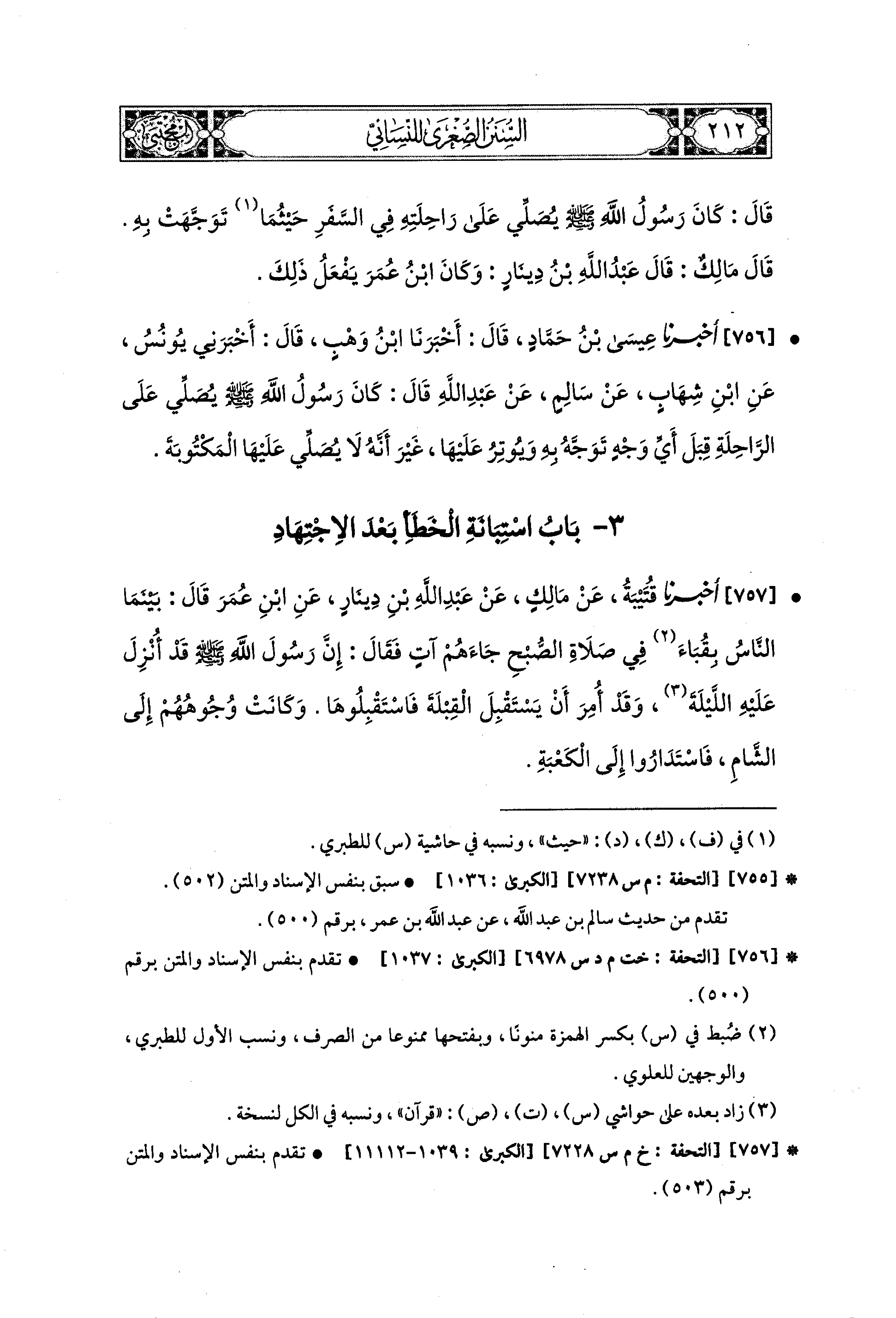 757- أَخبَرنا قُتَيبَةُ، عَن مَالِكٍ، عَن عَبد اللهِ بن دِينَارٍ، عَنِ ابنِ عُمَرَ قَالَ: بَيْنَمَا النَّاسُ بِقُبَاءَ فِي صَلاَةِ الصُّبْحِ جَاءَهُمْ آتٍ فَقَالَ: إِنَّ رَسُولَ اللهِ صَلى الله عَليه وسَلم قَدْ أُنْزِلَ عَلَيهِ اللَّيلَةَ، وَقَدْ أُمِرَ أَنْ يَسْتَقْبِلَ القِبْلَةَ، فَاسْتَقْبِلُوهَا وَكَانَتْ وُجُوهُهُمْ إِلَى الشَّامِ، فَاسْتَدَارُوا إِلَى الكَعْبَةِ.