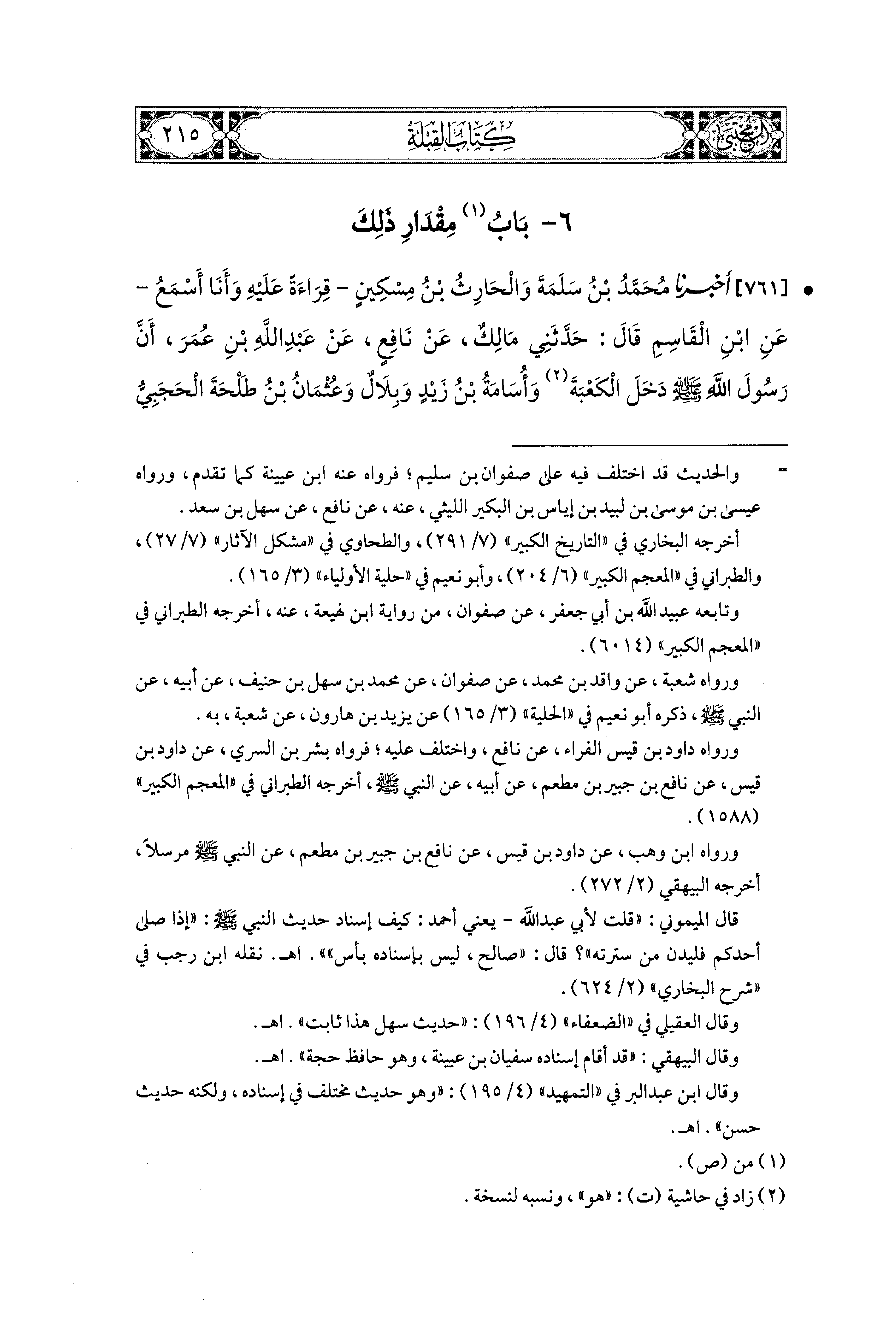 761- أَخبَرنا مُحَمد بنُ سَلَمَةَ، وَالحَارِثُ بنُ مِسكينٍ، قِرَاءَةً عَلَيهِ وَأَنَا أَسْمَعُ، عَنِ ابنِ القَاسِمِ، قَالَ: حَدَّثَني مَالِكٌ، عَن نَافِعٍ، عَن عَبد اللهِ بن عُمَرَ، أَنَّ رَسُولَ اللهِ صَلى الله عَليه وسَلم دَخَلَ الكَعْبَةَ وَأُسَامَةُ بنُ زَيْدٍ، وَبِلاَلٌ، وَعُثمَانُ بنُ طَلْحَةَ الحَجَبِيُّ فَأَغْلَقَهَا عَلَيهِ، قَالَ عَبدُ اللهِ بنُ عُمَرَ: فَسَأَلْتُ بِلاَلاً حِينَ خَرَجَ مَاذَا صَنَعَ رَسُولُ اللهِ صَلى الله عَليه وسَلم؟ قَالَ: جَعَلَ عَمُودًا عَن يَسَارِهِ وَعَمُودَيْنِ عَن يَمِينِهِ وَثَلاَثَةَ أَعْمِدَةٍ وَرَاءَهُ، وَكَانَ البَيْتُ يَوْمَئِذٍ عَلَى سِتَّةِ أَعْمِدَةٍ، ثُمَّ صَلَّى وَجَعَلَ بَيْنَهُ وَبَيْنَ الجِدَارِ نَحْوًا مِنْ ثَلاَثَةِ أَذْرُعٍ.