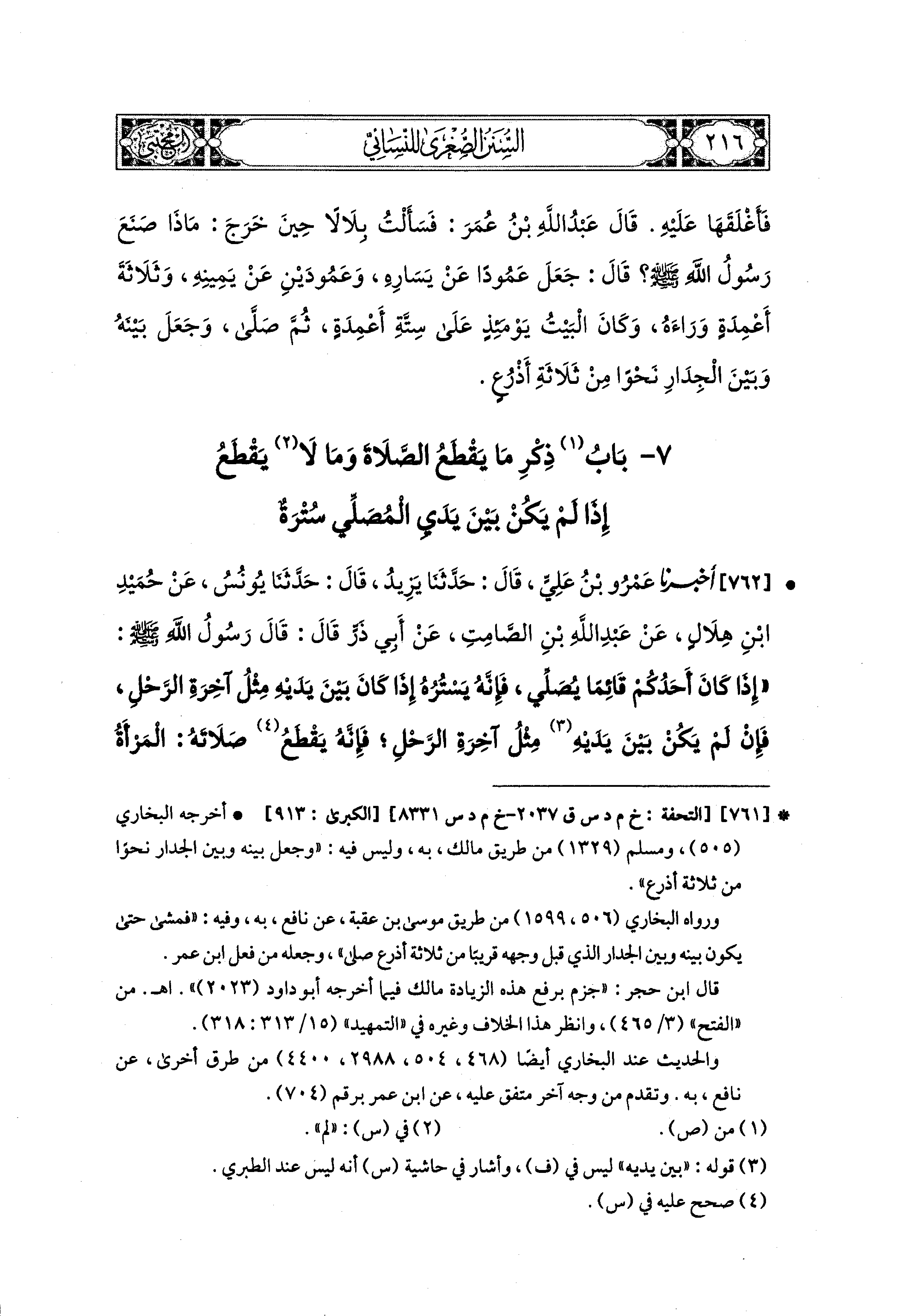 762- أَخبَرنا عَمْرُو بنُ عَلِيٍّ، قَالَ: حَدثنا يَزِيدُ، قال: حَدثنا يُونُسُ، عَن حُمَيدِ بْنِ هِلاَلٍ، عَن عَبد اللهِ بن الصَّامِتِ، عَن أَبي ذَرٍّ قَالَ: قَالَ رَسُولُ اللهِ صَلى الله عَليه وسَلم: إِذَا كَانَ أَحَدُكُمْ قَائِمًا يُصَلِّي فَإِنَّهُ يَسْتُرُهُ إِذَا كَانَ بَيْنَ يَدَيْهِ مِثْلُ آخِرَةِ الرَّحْلِ، فَإِنْ لَمْ يَكُنْ بَيْنَ يَدَيْهِ مِثْلُ آخِرَةِ الرَّحْلِ فَإِنَّهُ يَقْطَعُ صَلاَتَهُ المَرْأَةُ وَالحِمَارُ وَالكَلْبُ الأَسْوَدُ، قُلْتُ: مَا بَالُ الأَسْوَدِ مِنَ الأَصْفَرِ مِنَ الأَحْمَرِ؟ فَقَالَ: سَأَلْتُ رَسُولَ اللهِ صَلى الله عَليه وسَلم كَمَا سَأَلْتَني، فَقَالَ: الكَلْبُ الأَسْوَدُ شَيْطَانٌ.
