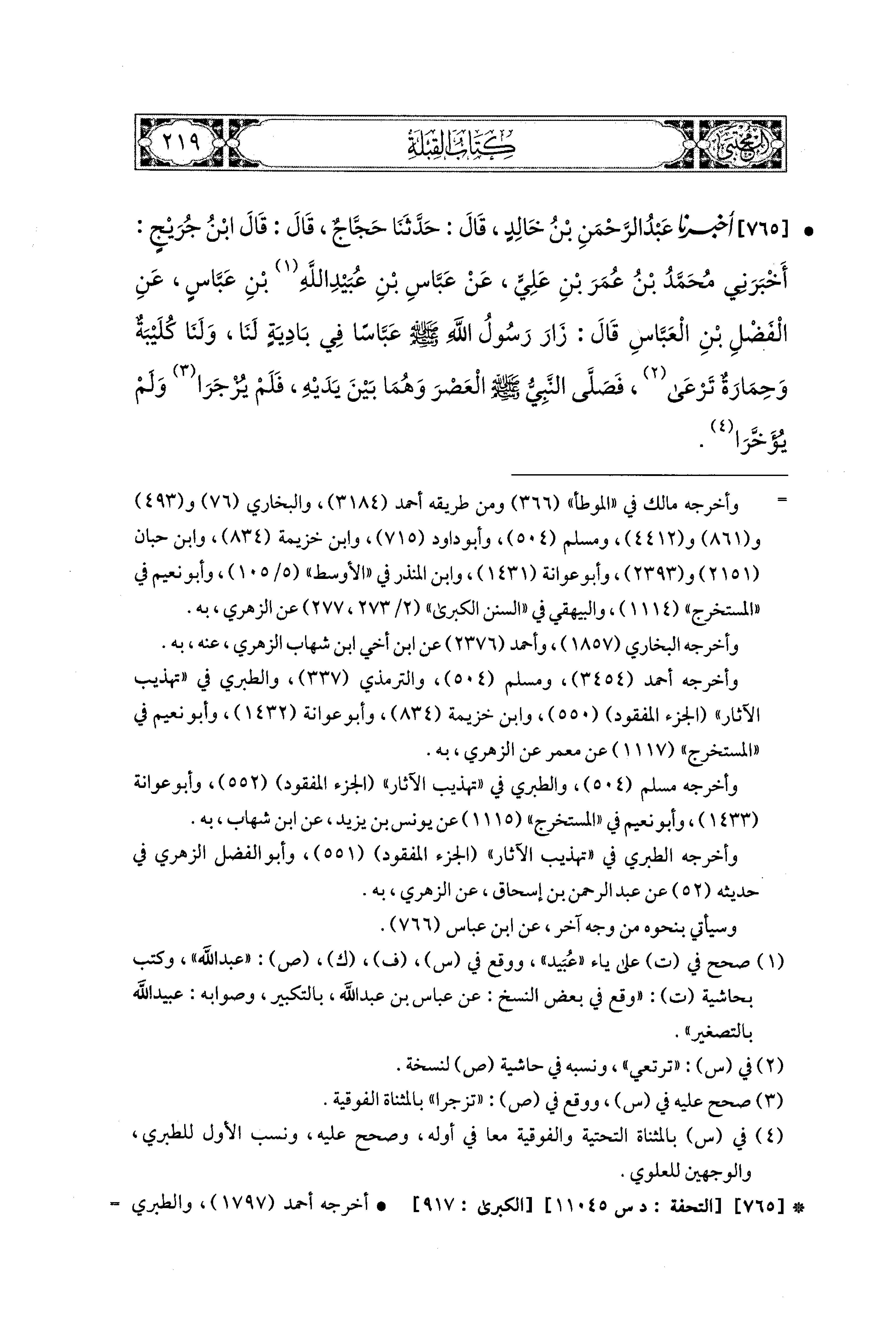 765- أَخبَرنا عَبدُ الرَّحْمَنِ بنُ خَالِدٍ، قال: حَدثنا حَجَّاجٌ قَالَ: قَالَ ابنُ جُرَيْجٍ: أَخبَرني مُحَمدُ بنُ عُمَرَ بْنِ عَلِيٍّ، عَن عَبَّاسِ بْنِ عُبَيدِ اللهِ بْنِ عَبَّاسٍ، عَنِ الفَضْلِ بْنِ العَبَّاسِ قَالَ: زَارَ رَسُولُ اللهِ صَلى الله عَليه وسَلم عَبَّاسًا فِي بَادِيَةٍ لَنَا، وَلَنَا كُلَيْبَةٌ وَحِمَارَةٌ تَرْعَى، فَصَلَّى النَّبيُّ صَلى الله عَليه وسَلم العَصْرَ وَهُمَا بَيْنَ يَدَيْهِ، فَلَمْ يُزْجَرَا وَلَمْ يُؤَخَّرَا.