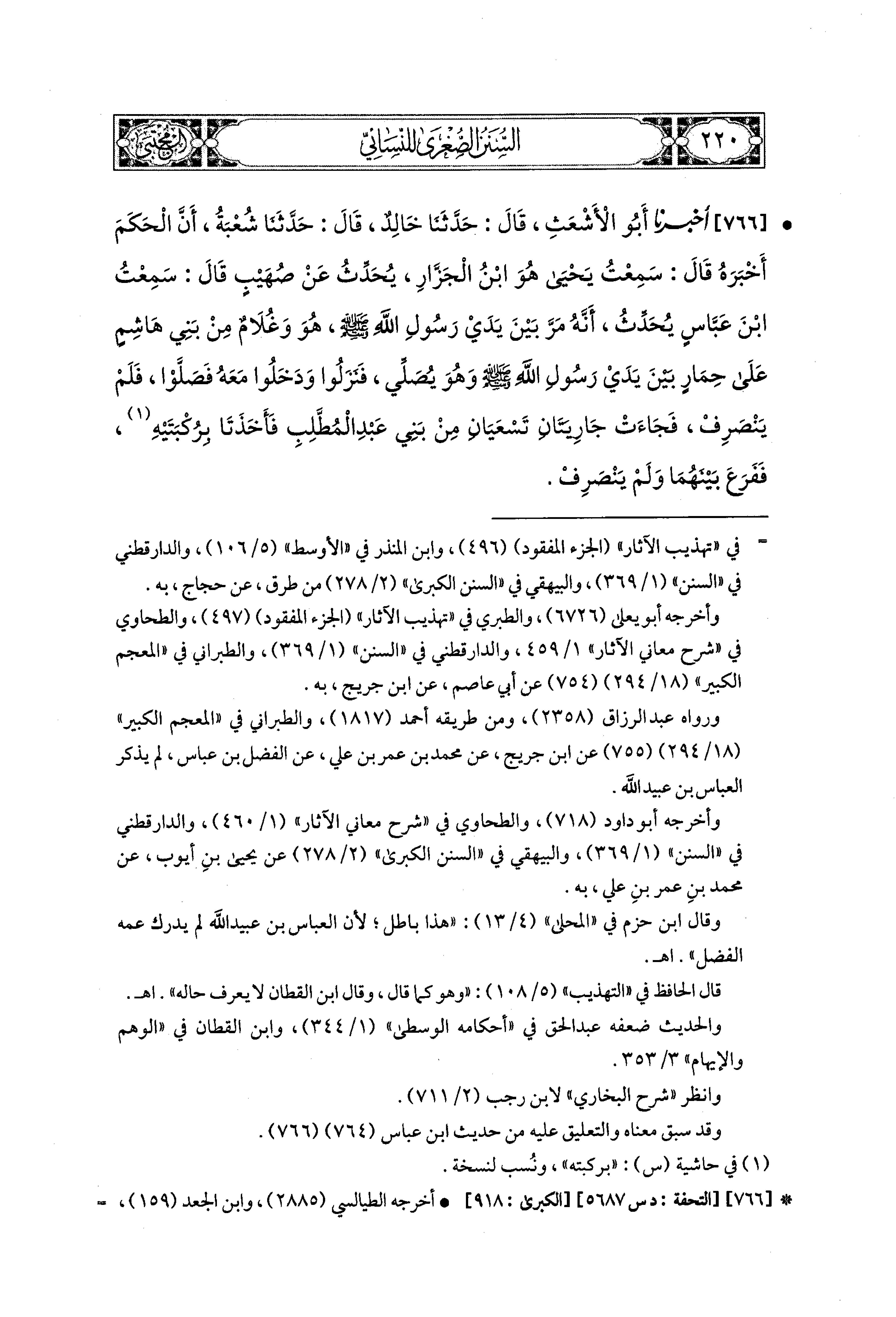 766- أَخبَرنا أَبو الأَشْعَثِ، قال: حَدثنا خَالِدٌ، قال: حَدثنا شُعبَةُ، أَنَّ الحَكَمَ أَخْبَرَهُ، قَالَ: سَمِعْتُ يَحيَى هو ابنَ الجَزَّارِ يُحَدِّثُ، عَن صُهَيْبٍ، قَالَ: سَمِعْتُ ابنَ عَبَّاسٍ يُحَدِّثُ أَنَّهُ مَرَّ بَيْنَ يَدَيْ رَسُولِ اللهِ صَلى الله عَليه وسَلم هُوَ وَغُلاَمٌ مِنْ بَني هَاشِمٍ عَلَى حِمَارٍ بَيْنَ يَدَيْ رَسُولِ اللهِ صَلى الله عَليه وسَلم وَهُوَ يُصَلِّي، فَنَزَلُوا وَدَخَلُوا مَعَهُ، فَصَلَّوْا وَلَمْ يَنْصَرِفْ، فَجَاءَتْ جَارِيَتَانِ تَسْعَيَانِ مِنْ بَني عَبدِ المُطَّلِبِ فَأَخَذَتَا بِرُكْبَتَيْهِ، فَفَرَعَ بَيْنَهُمَا وَلَمْ يَنْصَرِفْ.