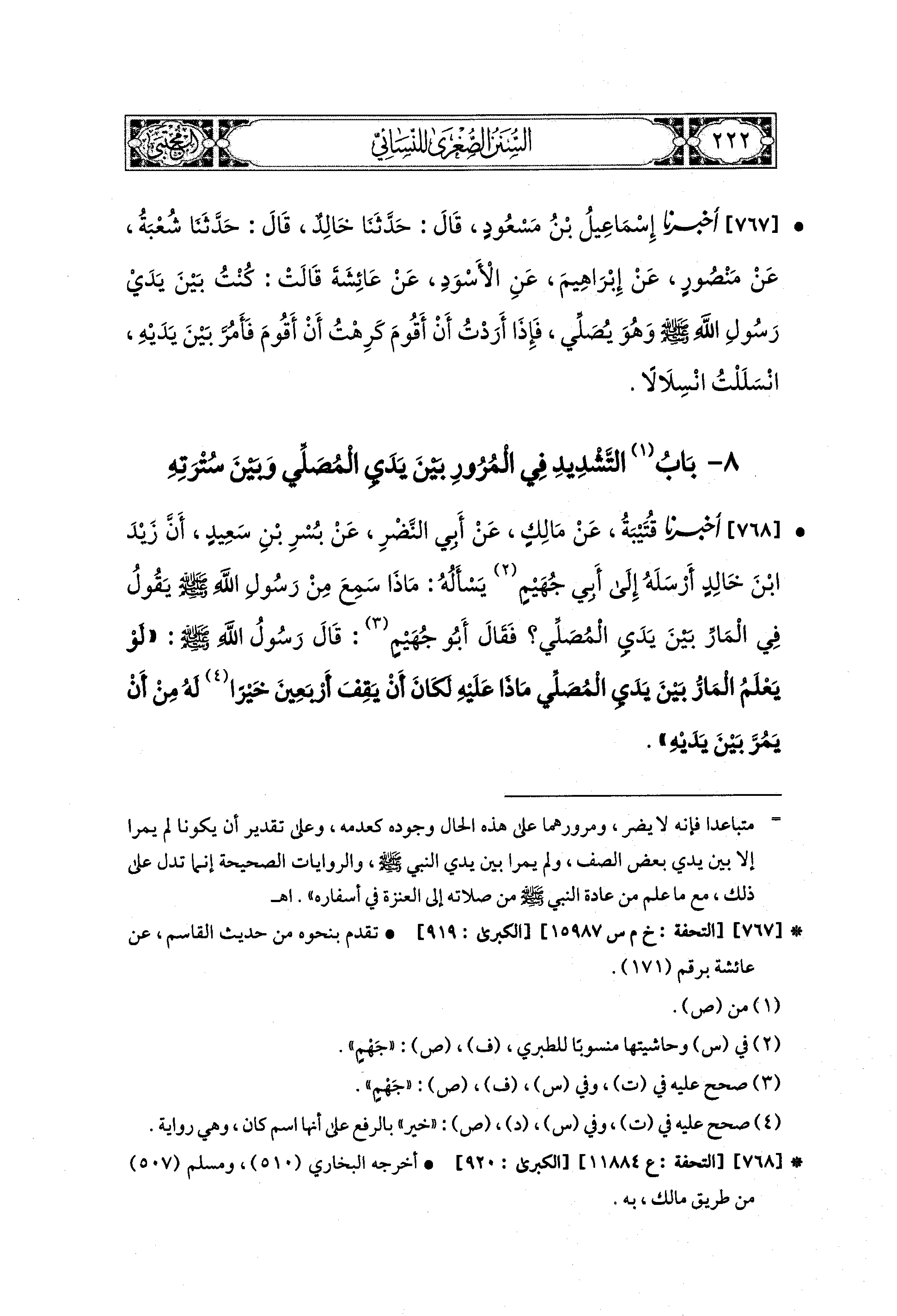 768- أَخبَرنا قُتَيبَةُ، عَن مَالِكٍ، عَن أَبي النَّضْرِ، عَن بُسْرِ بْنِ سَعيدٍ، أَنَّ زَيْدَ بْنَ خَالِدٍ أَرْسَلَهُ إِلَى أَبي جُهَيْمٍ يَسْأَلُهُ: مَاذَا سَمِعَ مِنْ رَسُولِ اللهِ صَلى الله عَليه وسَلم يَقُولُ فِي المَارِّ بَيْنَ يَدَيِ المُصَلِّي؟ فَقَالَ أَبو جُهَيْمٍ: قَالَ رَسُولُ اللهِ صَلى الله عَليه وسَلم: لَوْ يَعْلَمُ المَارُّ بَيْنَ يَدَيِ المُصَلِّي مَاذَا عَلَيهِ لَكَانَ أَنْ يَقِفَ أَرْبَعِينَ خَيْرًا لَهُ مِنْ أَنْ يَمُرَّ بَيْنَ يَدَيْهِ.