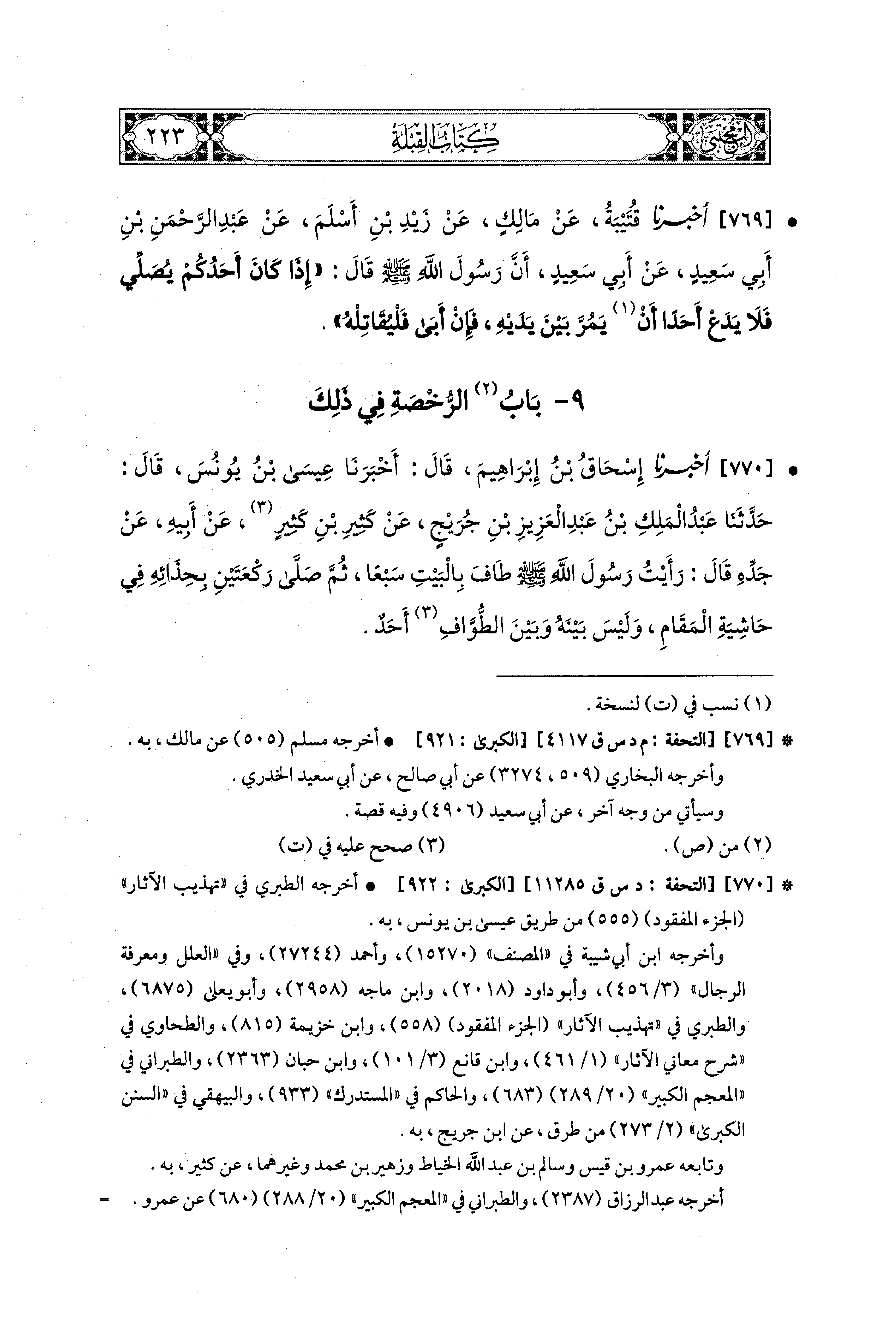 770- أَخبَرنا إِسحَاقُ بنُ إِبراهِيمَ، قَالَ: أَخبَرنا عِيسَى بنُ يُونُسَ، قال: حَدثنا عَبدُ المَلِكِ بنُ عَبدِ العَزِيزِ بْنِ جُرَيْجٍ، عَن كَثِيرِ بْنِ كَثِيرٍ، عَن أَبيهِ، عَن جَدِّهِ قَالَ: رَأَيْتُ رَسُولَ اللهِ صَلى الله عَليه وسَلم طَافَ بِالبَيْتِ سَبْعًا، ثُمَّ صَلَّى رَكْعَتَيْنِ بِحِذَائِهِ فِي حَاشِيَةِ المَقَامِ، وَلَيْسَ بَيْنَهُ وَبَيْنَ الطُّوَّافِ أَحَدٌ.
