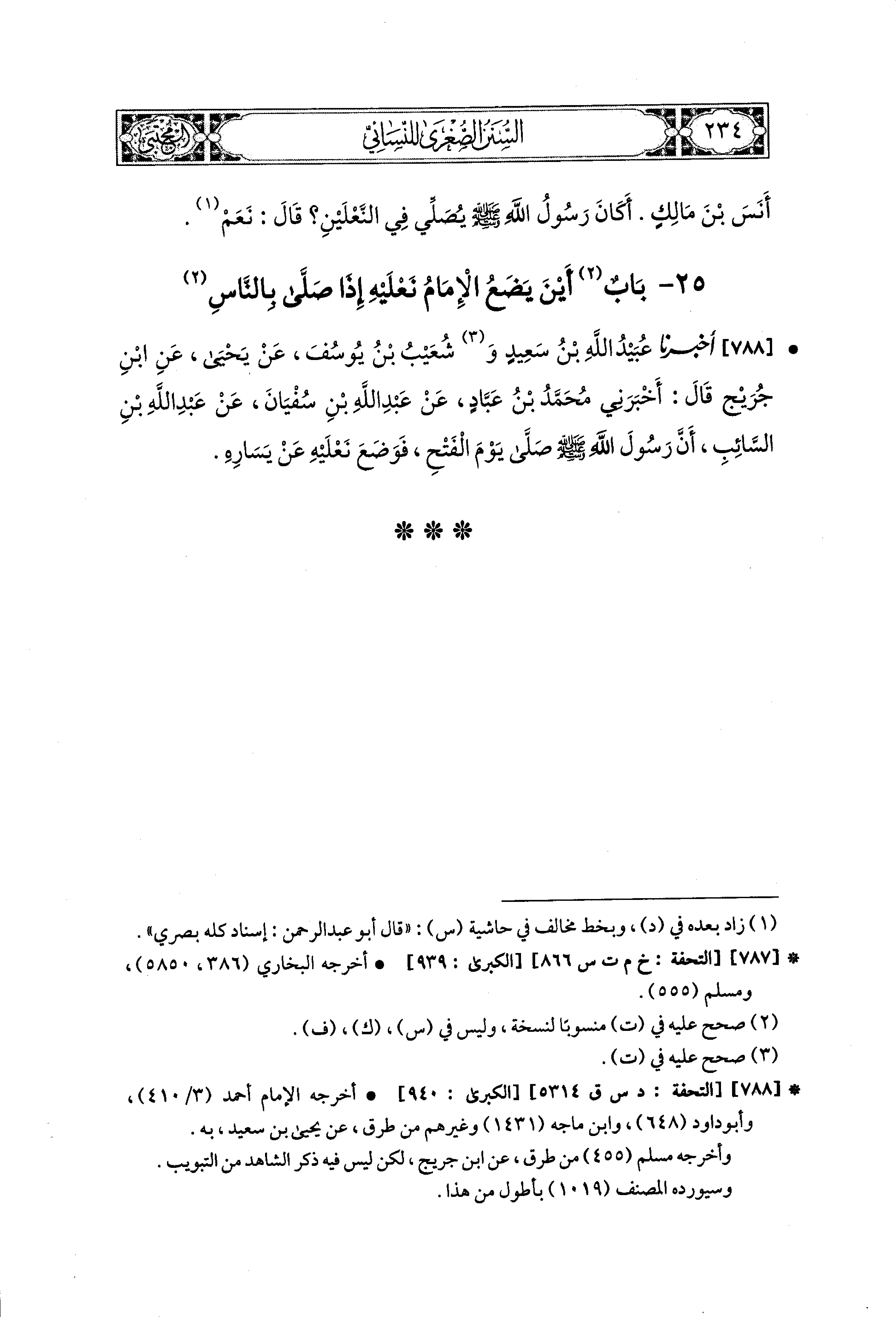 788- أَخبَرنا عُبَيدُ اللهِ بنُ سَعيدٍ، وَشُعَيبُ بنُ يُوسُفَ، عَن يَحيَى، عَنِ ابنِ جُرَيْجٍ، قَالَ: أَخبَرني مُحَمدُ بنُ عَبَّادٍ، عَن عَبد اللهِ بن سُفيَانَ، عَن عَبد اللهِ بن السَّائِبِ، أَنَّ رَسُولَ اللهِ صَلى الله عَليه وسَلم صَلَّى يَوْمَ الفَتْحِ فَوَضَعَ نَعْلَيْهِ عَن يَسَارِهِ.