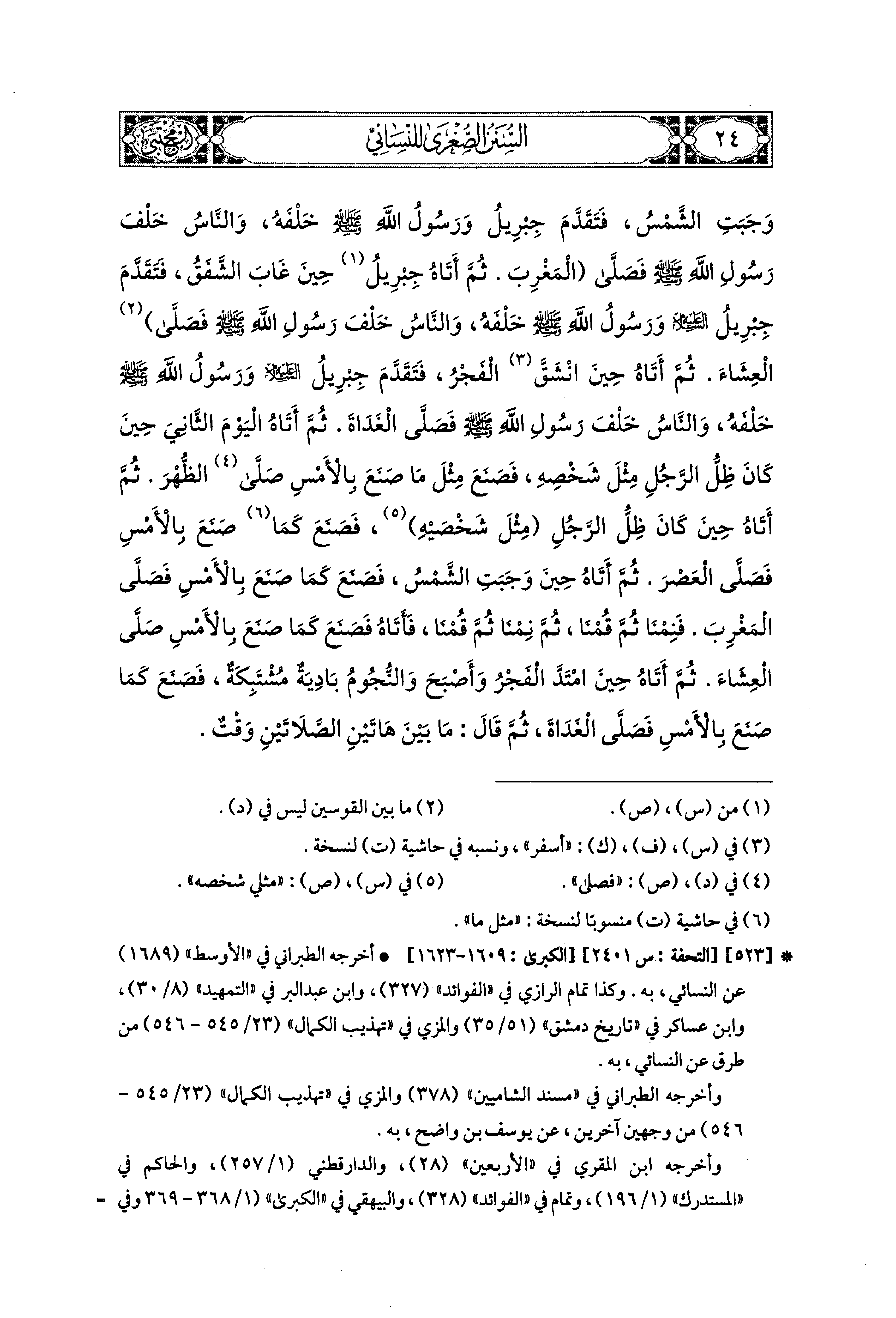 ثُمَّ أَتَاهُ جِبْرِيلَ حِينَ غَابَ الشَّفَقُ، فَتَقَدَّمَ جِبْرِيلُ عَلَيهِ السَّلاَمُ وَرَسُولُ اللهِ صَلى الله عَليه وسَلم خَلْفَهُ، وَالنَّاسُ خَلْفَ رَسُولِ اللهِ صَلى الله عَليه وسَلم، فَصَلَّى العِشَاءَ، ثُمَّ أَتَاهُ حِينَ انْشَقَّ الفَجْرُ، فَتَقَدَّمَ جِبْرِيلُ عَلَيهِ السَّلاَمُ وَرَسُولُ اللهِ صَلى الله عَليه وسَلم خَلْفَهُ، وَالنَّاسُ خَلْفَ رَسُولِ اللهِ صَلى الله عَليه وسَلم، فَصَلَّى الغَدَاةَ، ثُمَّ أَتَاهُ اليَوْمَ الثَّانيَ حِينَ كَانَ ظِلُّ الرَّجُلِ مِثْلَ شَخْصِهِ، فَصَنَعَ مِثْلَ مَا صَنَعَ بِالأَمْسِ صَلَّى الظُّهْرَ، ثُمَّ أَتَاهُ حِينَ كَانَ ظِلُّ الرَّجُلِ مِثْلَ شَخْصَيْهِ فَصَنَعَ كَمَا صَنَعَ بِالأَمْسِ، فَصَلَّى العَصْرَ، ثُمَّ أَتَاهُ حِينَ وَجَبَتِ الشَّمْسُ فَصَنَعَ كَمَا صَنَعَ بِالأَمْسِ، فَصَلَّى المَغْرِبَ، فَنِمْنَا ثُمَّ قُمْنَا، ثُمَّ نِمْنَا ثُمَّ قُمْنَا، فَأَتَاهُ فَصَنَعَ كَمَا صَنَعَ بِالأَمْسِ صَلَّى العِشَاءَ، ثُمَّ أَتَاهُ حِينَ امْتَدَّ الفَجْرُ وَأَصْبَحَ وَالنُّجُومُ بَادِيَةٌ مُشْتَبِكَةٌ فَصَنَعَ كَمَا صَنَعَ بِالأَمْسِ فَصَلَّى الغَدَاةَ، ثُمَّ قَالَ: مَا بَيْنَ هَاتَيْنِ الصَّلاَتَيْنِ وَقْتٌ.