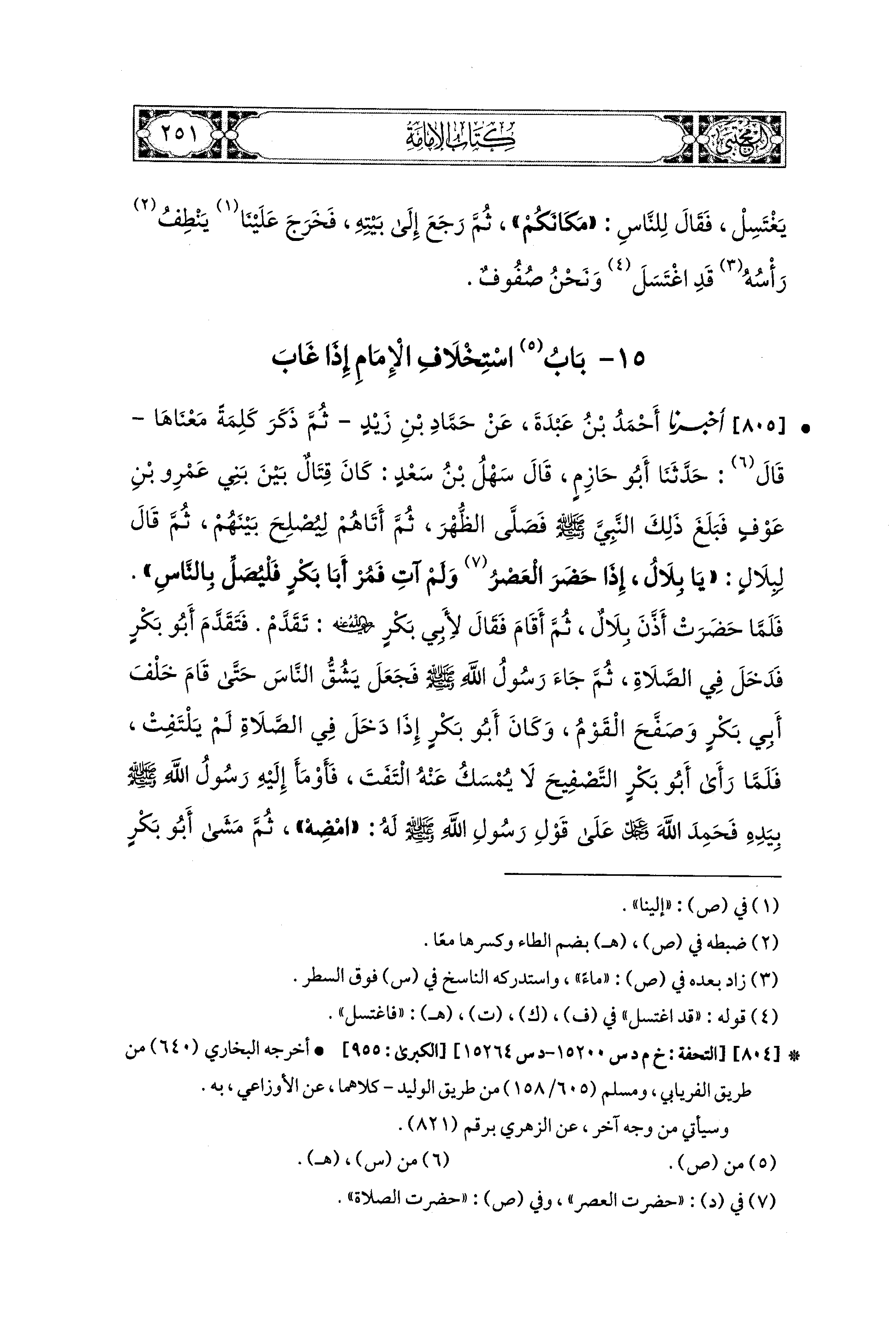 805- أَخبَرنا أَحْمَدُ بنُ عَبدَةَ، عَن حَمَّادِ بْنِ زَيْدٍ ثُمَّ ذَكَرَ كَلِمَةً مَعْنَاهَا، قال: حَدثنا أَبو حَازِمٍ قَالَ سَهْلُ بنُ سَعْدٍ: كَانَ قِتَالٌ بَيْنَ بَني عَمْرِو بْنِ عَوْفٍ، فَبَلَغَ ذَلِكَ النَّبيَّ صَلى الله عَليه وسَلم فَصَلَّى الظُّهْرَ، ثُمَّ أَتَاهُمْ لِيُصْلِحَ بَيْنَهُمْ، ثُمَّ قَالَ لِبِلاَلٍ: يَا بِلاَلُ، إِذَا حَضَرَ العَصْرُ وَلَمْ آتِ فَمُرْ أَبَا بَكْرٍ فَلْيُصَلِّ بِالنَّاسِ، فَلَمَّا حَضَرَتْ أَذَّنَ بِلاَلٌ ثُمَّ أَقَامَ، فَقَالَ لأَبي بَكْرٍ رَضِيَ اللهُ عَنهُ: تَقَدَّمْ، فَتَقَدَّمَ أَبو بَكْرٍ فَدَخَلَ فِي الصَّلاَةِ، ثُمَّ جَاءَ رَسُولُ اللهِ صَلى الله عَليه وسَلم، فَجَعَلَ يَشُقُّ النَّاسَ حَتَّى قَامَ خَلْفَ أَبي بَكْرٍ وَصَفَّحَ القَوْمُ، وَكَانَ أَبو بَكْرٍ إِذَا دَخَلَ فِي الصَّلاَةِ لَمْ يَلْتَفِتْ، فَلَمَّا رَأَى أَبو بَكْرٍ التَّصْفِيحَ لاَ يُمْسَكُ عَنهُ التَفَتَ، فَأَوْمَأَ إِلَيْهِ رَسُولُ اللهِ صَلى الله عَليه وسَلم بِيَدِهِ، فَحَمِدَ اللهَ عَزَّ وَجَلَّ عَلَى قَوْلِ رَسُولِ اللهِ صَلى الله عَليه وسَلم لهُ امْضِهْ، ثُمَّ مَشَى أَبو بَكْرٍ القَهْقَرَى عَلَى عَقِبَيْهِ فَتَأَخَّرَ، فَلَمَّا رَأَى ذَلِكَ رَسُولُ اللهِ صَلى الله عَليه وسَلم تَقَدَّمَ فَصَلَّى بِالنَّاسِ، فَلَمَّا قَضَى صَلاَتَهُ قَالَ: يَا أَبَا بَكْرٍ مَا مَنَعَكَ إِذْ أَوْمَأْتُ إِلَيْكَ أَنْ لاَ تَكُونَ مَضَيْتَ؟ فَقَالَ: لَمْ يَكُنْ لاِبْنِ أَبي قُحَافَةَ أَنْ يَؤُمَّ رَسُولَ اللهِ صَلى الله عَليه وسَلم، وَقَالَ لِلنَّاسِ: إِذَا نَابَكُمْ شَيْءٌ فَلْيُسَبِّحِ الرِّجَالُ، وَلْيُصَفِّحِ النِّسَاءُ.