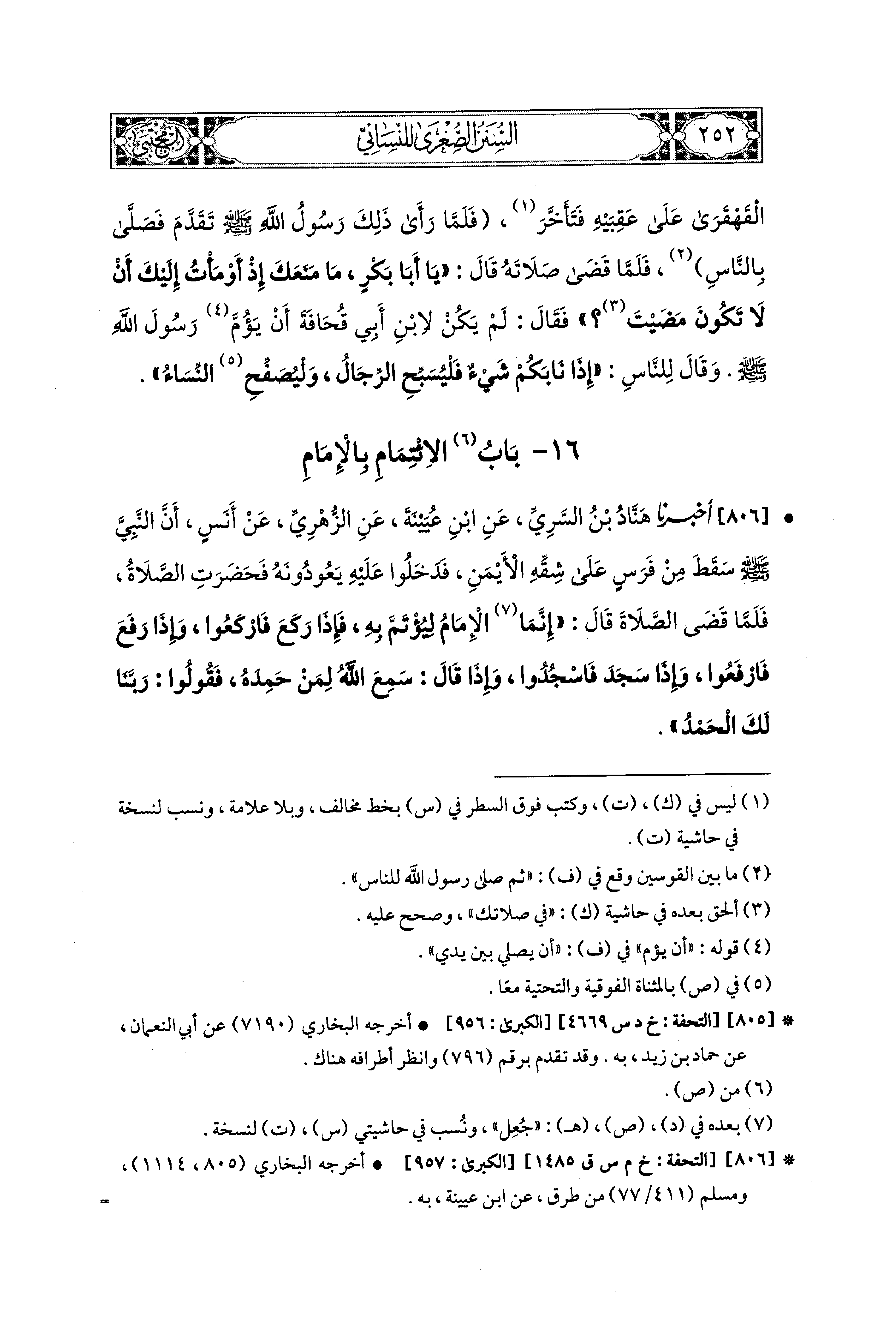 806- أَخبَرنا هَنَّادُ بنُ السَّرِيِّ، عَنِ ابنِ عُيَيْنَةَ، عَنِ الزُّهْرِيِّ، عَن أَنَسٍ، أَنَّ النَّبيَّ صَلى الله عَليه وسَلم سَقَطَ مِنْ فَرَسٍ عَلَى شِقِّهِ الأَيْمَنِ، فَدَخَلُوا عَلَيهِ يَعُودُونَهُ فَحَضَرَتِ الصَّلاَةُ، فَلَمَّا قَضَى الصَّلاَةَ قَالَ: إِنَّمَا الإِمَامُ لِيُؤْتَمَّ بِهِ، فَإِذَا رَكَعَ فَارْكَعُوا، وَإِذَا رَفَعَ فَارْفَعُوا، وَإِذَا سَجَدَ فَاسْجُدُوا، وَإِذَا قَالَ: سَمِعَ اللهُ لِمَنْ حَمِدَهُ، فَقُولُوا: رَبَّنَا لَكَ الحَمْدُ.