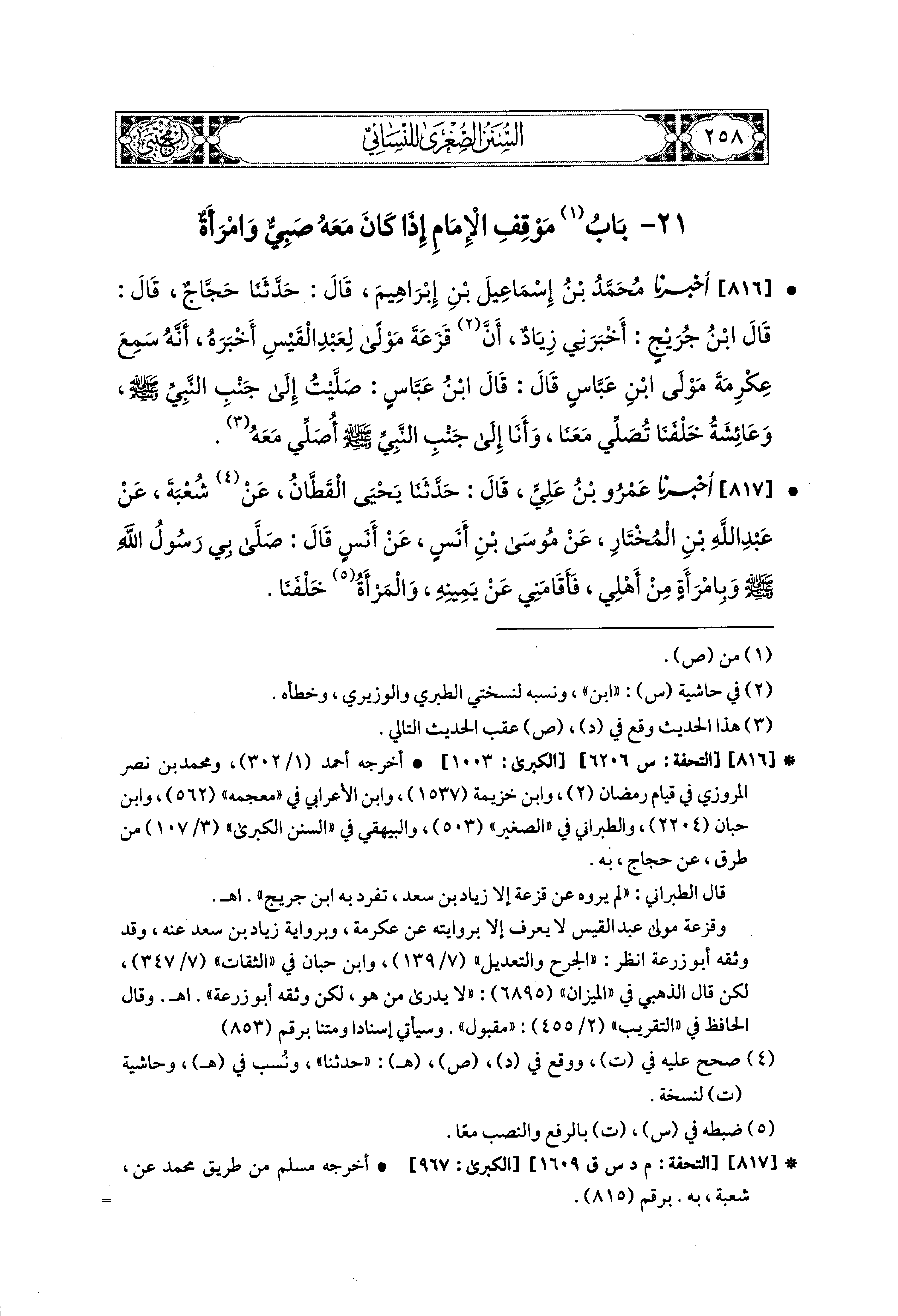 816- أَخبَرنا مُحَمد بنُ إِسماعِيلَ بْنِ إِبراهِيمَ، قال: حَدثنا حَجَّاجٌ قَالَ: قَالَ ابنُ جُرَيْجٍ: أَخبَرني زِيَادٌ، أَنَّ قَزَعَةَ مَوْلًى لِعَبدِ القَيْسٍ أَخْبَرَهُ، أَنَّهُ سَمِعَ عِكْرِمَةَ مَوْلَى ابنِ عَبَّاسٍ، قَالَ: قَالَ ابنُ عَبَّاسٍ: صَلَّيْتُ إِلَى جَنْبِ النَّبيِّ صَلى الله عَليه وسَلم وَعَائِشَةُ خَلْفَنَا تُصَلِّي مَعَنَا، وَأَنَا إِلَى جَنْبِ النَّبيِّ صَلى الله عَليه وسَلم أُصَلِّي مَعَهُ.