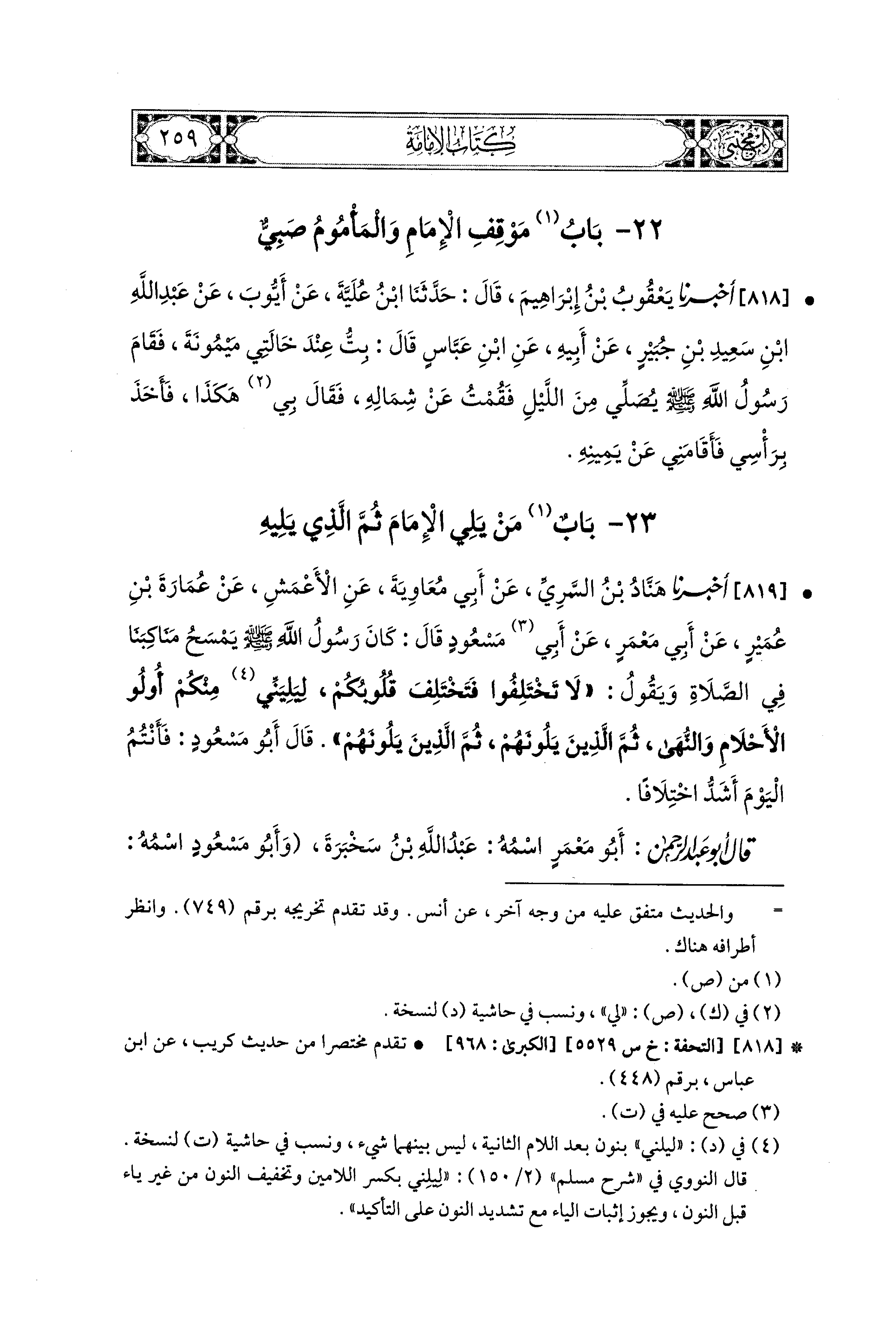 819- أَخبَرنا هَنَّادُ بنُ السَّرِيِّ، عَن أَبي مُعَاوِيَةَ، عَنِ الأَعْمَشِ، عَن عُمَارَةَ بْنِ عُمَيْرٍ، عَن أَبي مَعْمَرٍ، عَن أَبي مَسْعُودٍ قَالَ: كَانَ رَسُولُ اللهِ صَلى الله عَليه وسَلم يَمْسَحُ مَنَاكِبَنَا فِي الصَّلاَةِ وَيَقُولُ: لاَ تَخْتَلِفُوا فَتَخْتَلِفَ قُلُوبُكُمْ، لِيَلِيَني مِنْكُمْ أُولُو الأَحْلاَمِ وَالنُّهَى، ثُمَّ الَّذِينَ يَلُونَهُمْ، ثُمَّ الَّذِينَ يَلُونَهُمْ، قَالَ أَبو مَسْعُودٍ: فَأَنْتُمُ اليَوْمَ أَشَدُّ اخْتِلاَفًا.